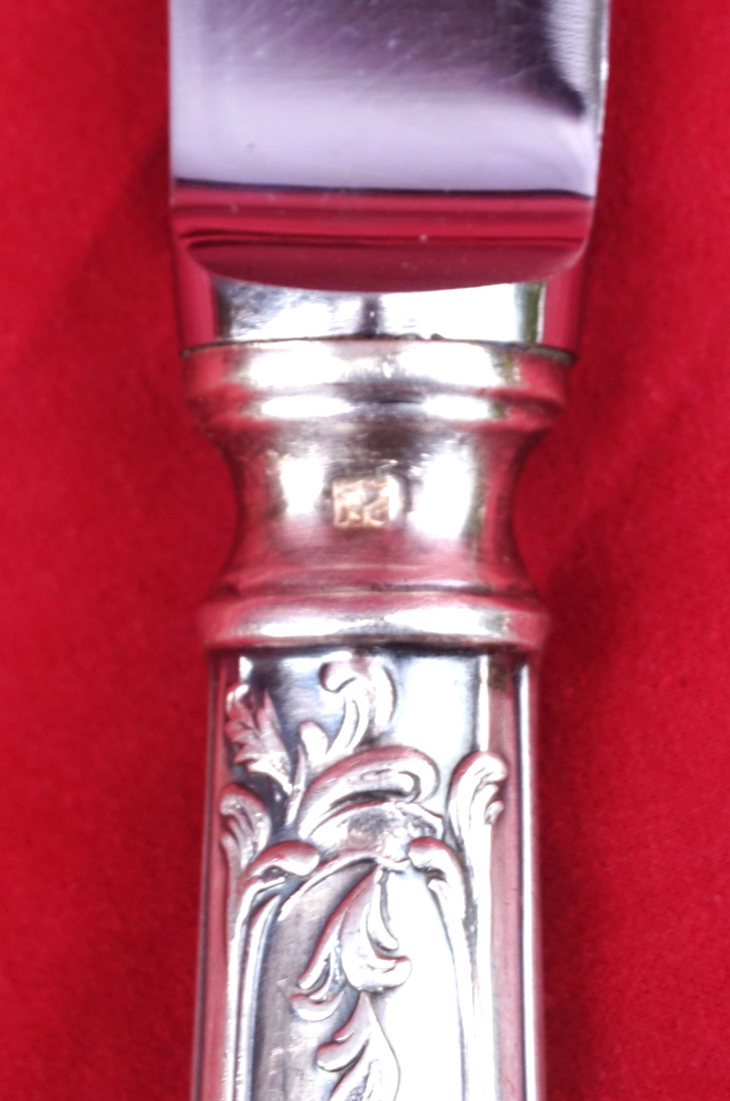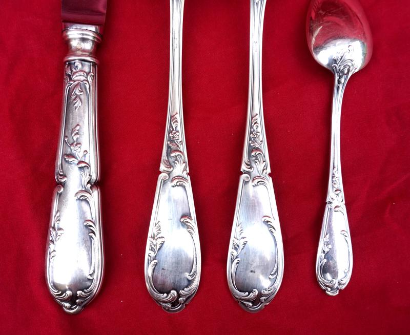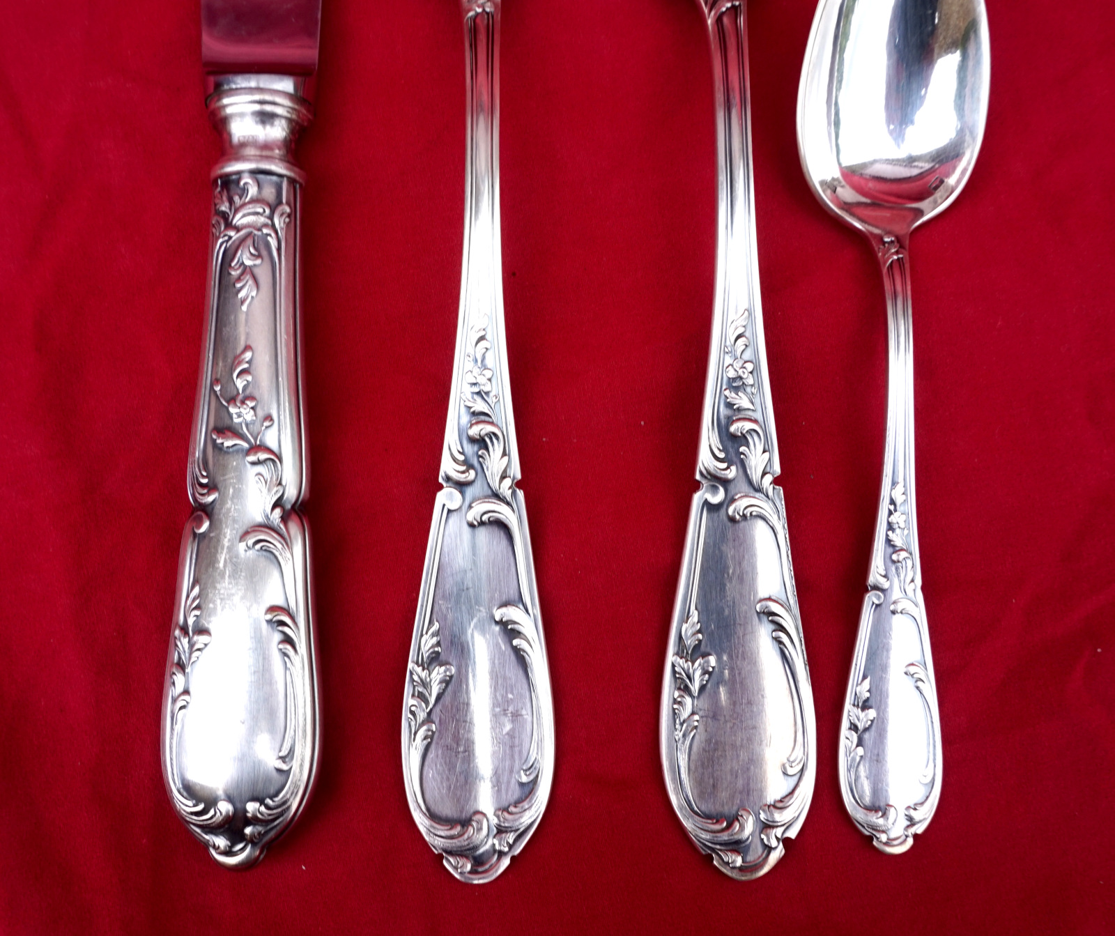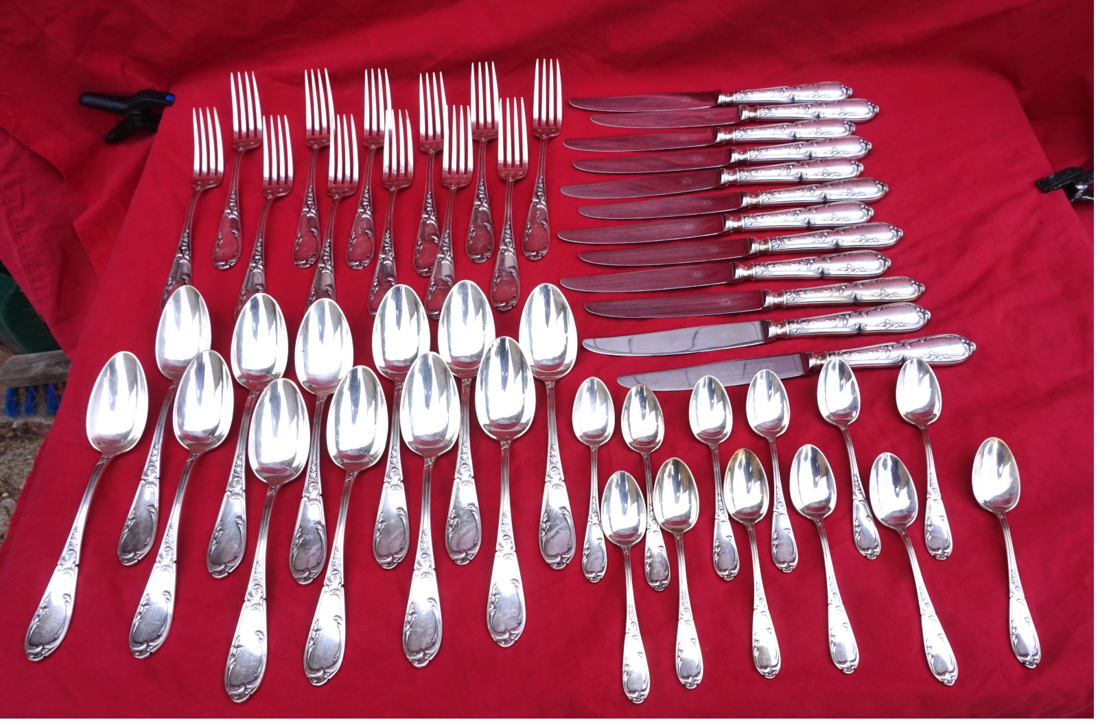 Ménagère de table de style Louis XV en métal argenté par SFAm, orfèvrerie de Chambly, comprenant 12 couteaux de table lame inox, 12 fourchettes et cuillères et 12 cuillères à dessert. Toutes les pièces sont poinçonnées et grammées. Longueur des couteaux 26cm, fourchettes et cuillères table 21.5cm, cuillères dessert 14.5cm. Très bel état.