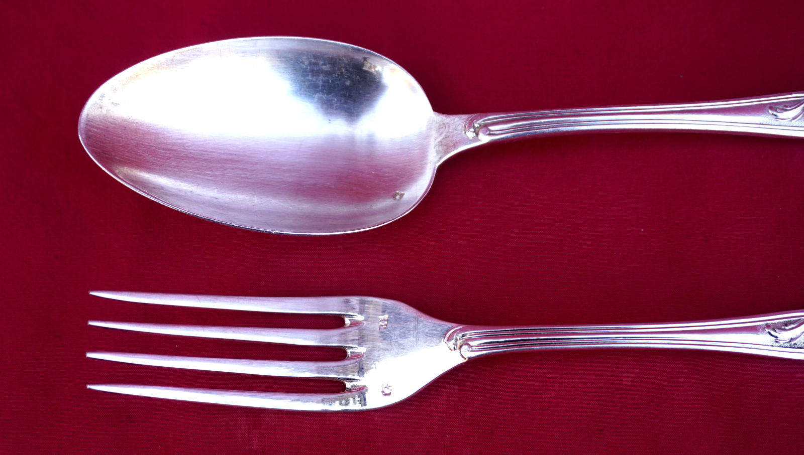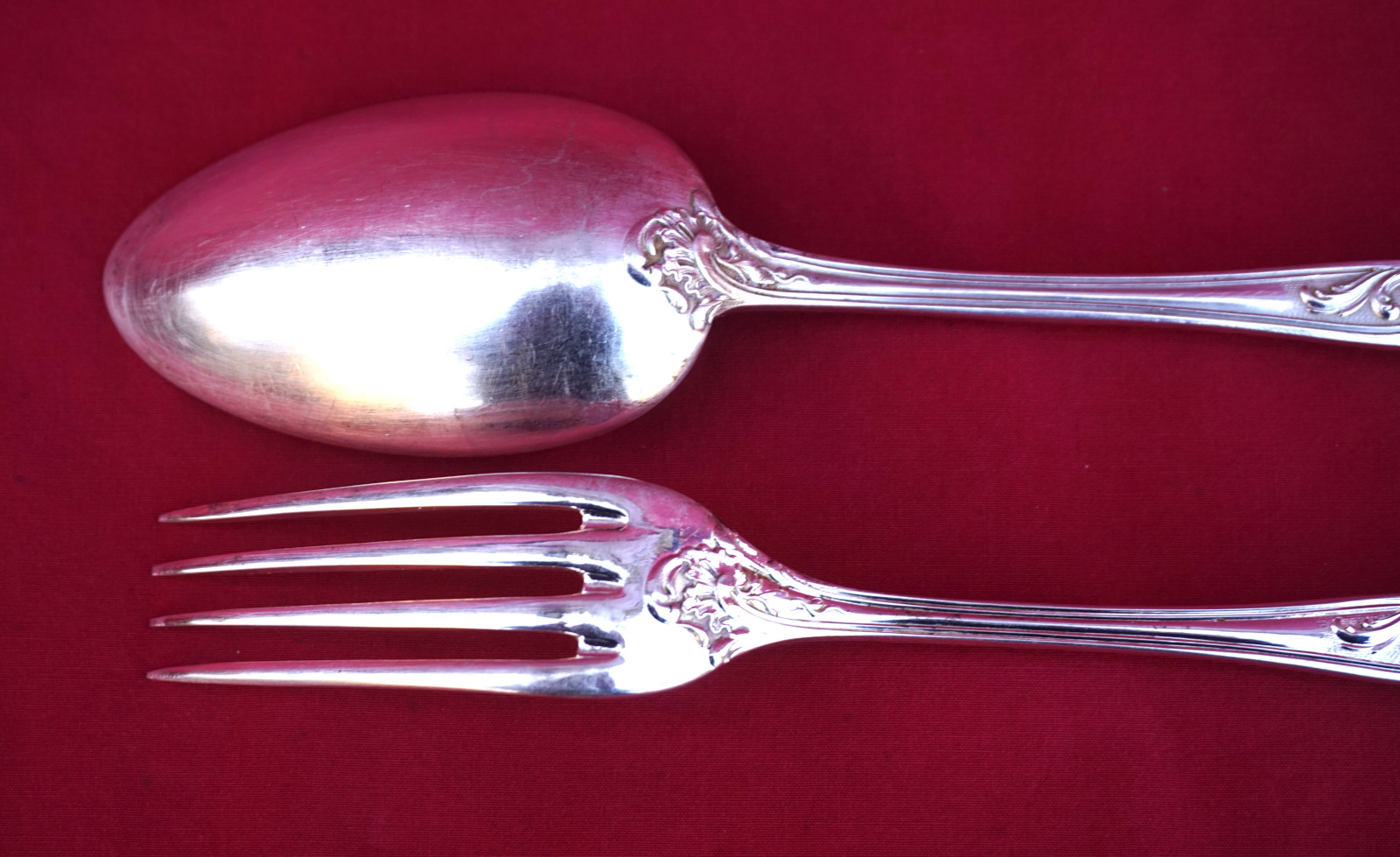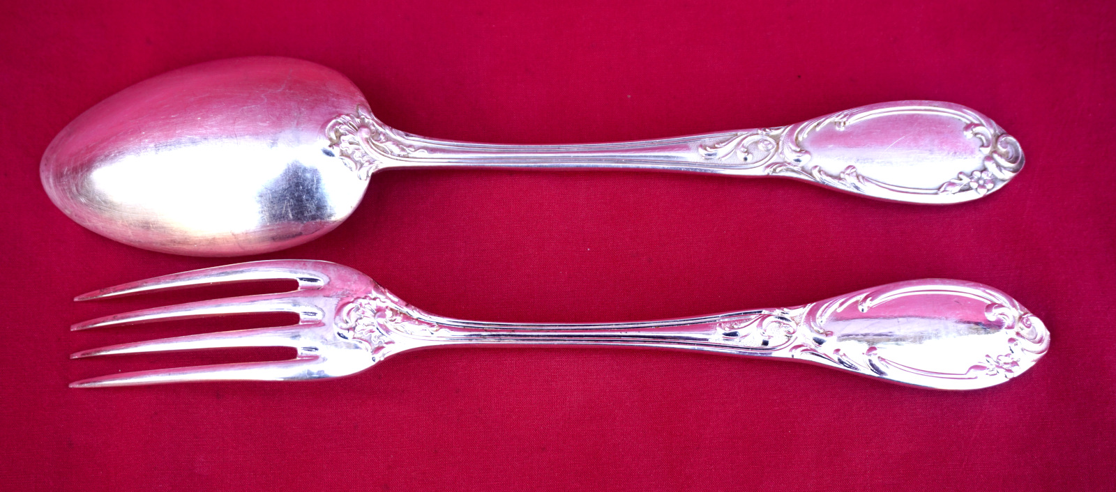 French silverplate flatware set of 12 dinner forks and spoons made during the 1910's. They are hallmarked. 8 1/4" '21cm) length for the fork, 8 1/2" (21.5cm) length for the spoon. Good condition.