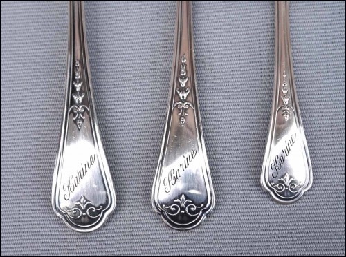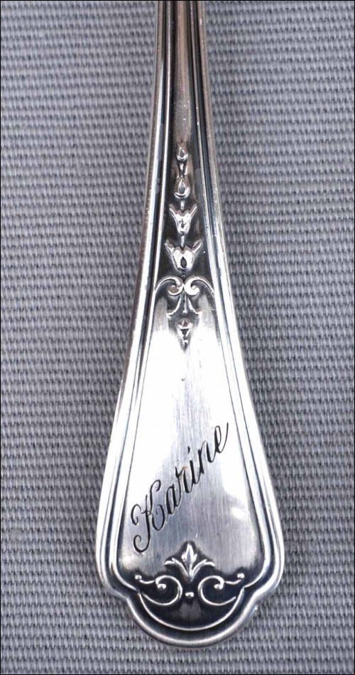 French silver plate children set with spoon, forks and dessert spoon in Louis XV style and angraved Karine made by Caillar Gaillard & cie in Paris. They measure: 7 1/4" (18.5cm) for the spoon, 7 1/8" (18cm) length for the fork and 5" (14cm) length for the dessert spoon. Perfect condition as mint as shown by the following pictures.