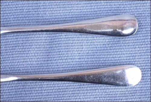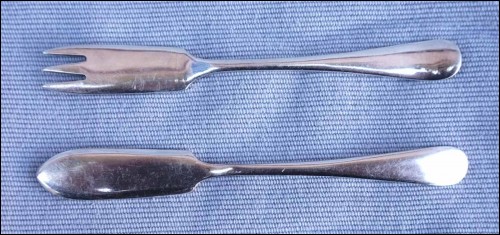 Victorian fork knife serving set for cheese, pickles... made by Mappin & Webb. They are hallmarked. 4" (10.2cm) length. Good condition, tiny scratches, as shown by the following pictures.