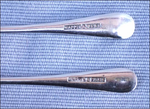 Couvert de service, pickle, fromage.... par Mappin & Webb. Ils sont poinçonnés au dos. Longueur 10,2 cm. Très bel état.