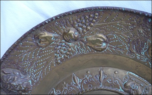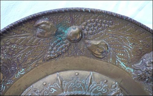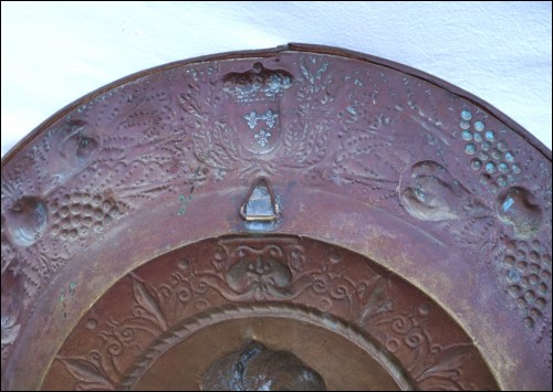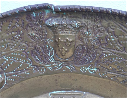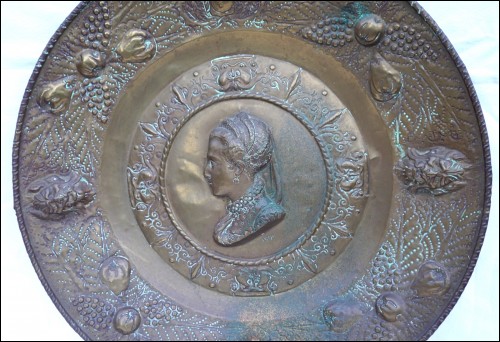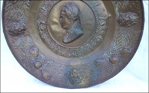 Grand plat mural historique, en laiton repoussé, présentant Marie de Médicis en médaillon aux Armes de France, milieu XIXe siècle. Diamètre 61.5 cm, profondeur 7 cm, poids 1.6kg. Bel état , un accident sur le bord à 12H.