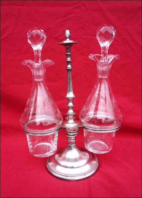 French oil vinegar set with engraved crystal cruets and cut crystal stopper on silver plate stand made during the 1900's. It's stamped with the hallmark of silversmith. 9 5/8" (24.5cm) total height, 8 1/4" (21cm) width. Beautiful condition, the silverplate is slightly used and the stoppers perhaps not original as shown by the following pictures.