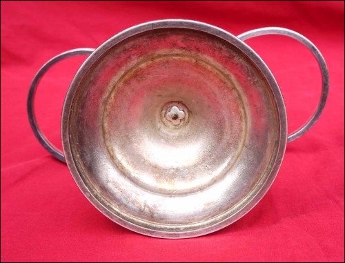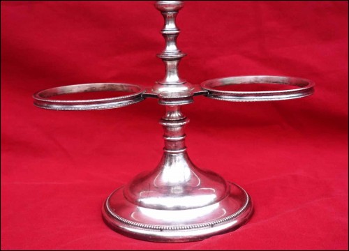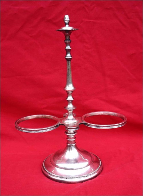 Huilier vinaigrier en cristal taillé à la roue sur une monture en métal argenté, vers 1900. Il porte le poinçon de l'orfèvre. Hauteur totale 24.5 cm, largeur 21 cm. Très bel état.