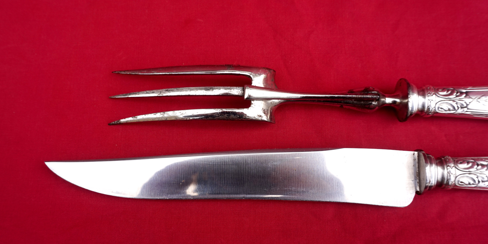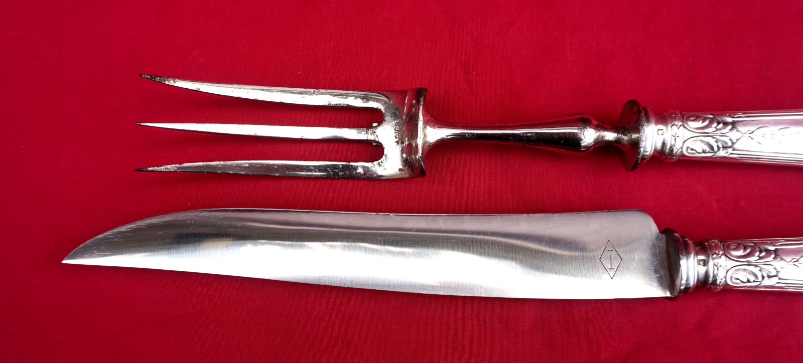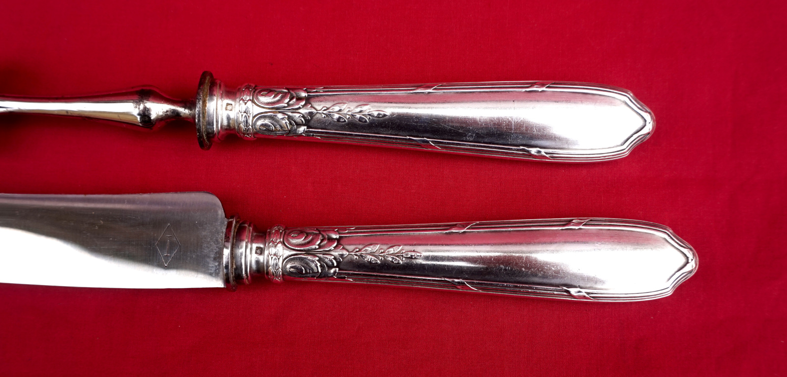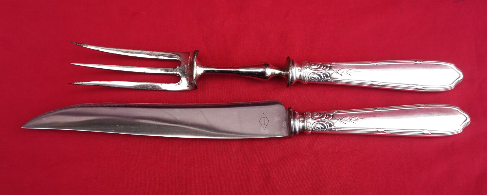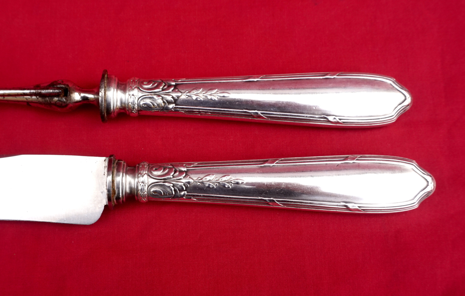 French silver plate serving carving set, with stainless steel blade, in Louis XVI style made by Ravinet Denfert during the 1900's. They are hallmarked. 12 1/2" (31.7cm) length for the knife, 11 1/4" (28.5cm) length for the fork. Beautiful condition, a few small oxydation stains on the chrome of the fork.