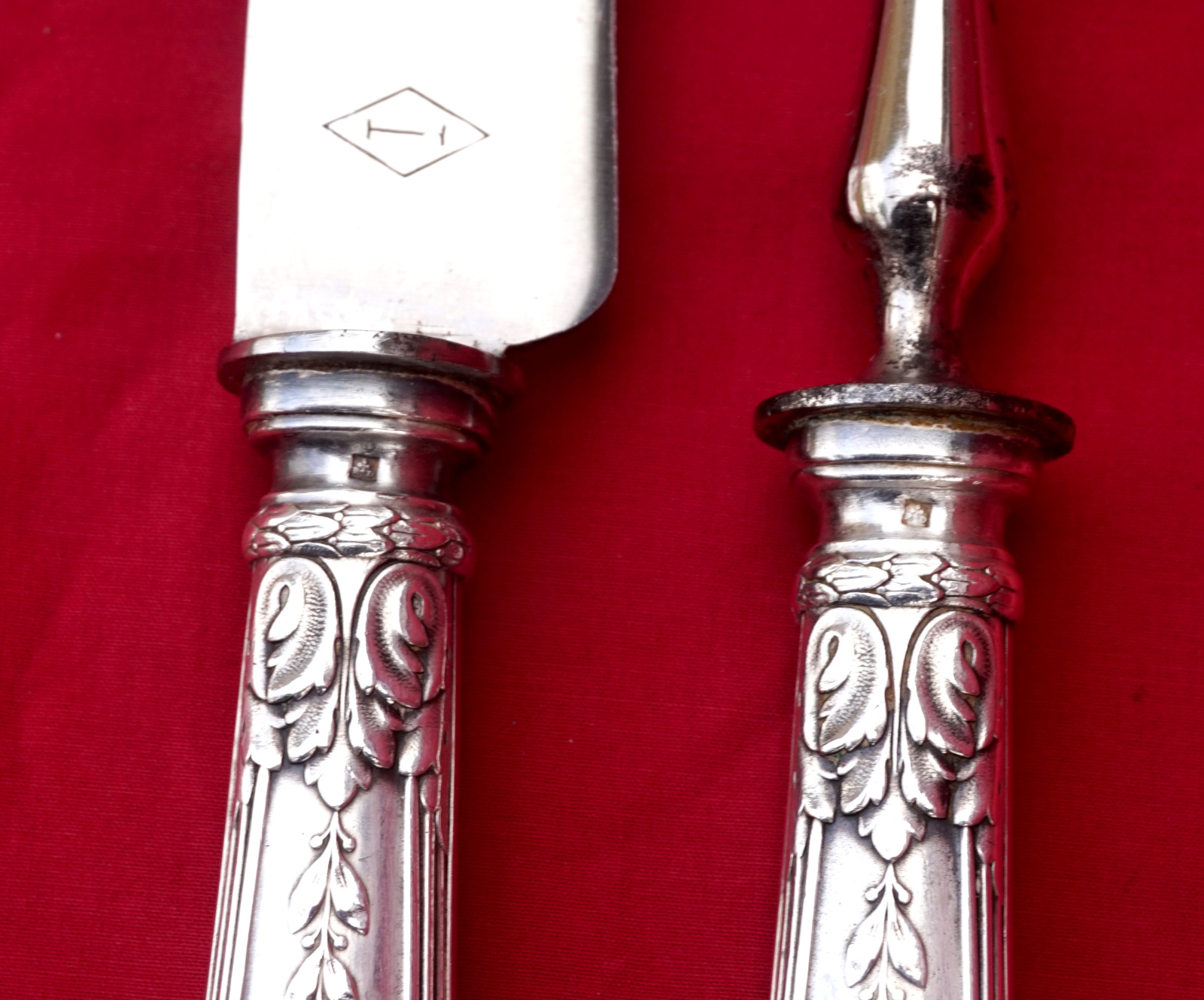 Service à découper, couteau lame inox, en métal argenté de style Louis XVI par Ravinet Denfert vers 1900. Ils ont poinconnés de la marque des orfèvres RD et trèfle (1891-1912). Longueur du couteau 31.7cm, de la fourche 28.5cm. Très bel état.