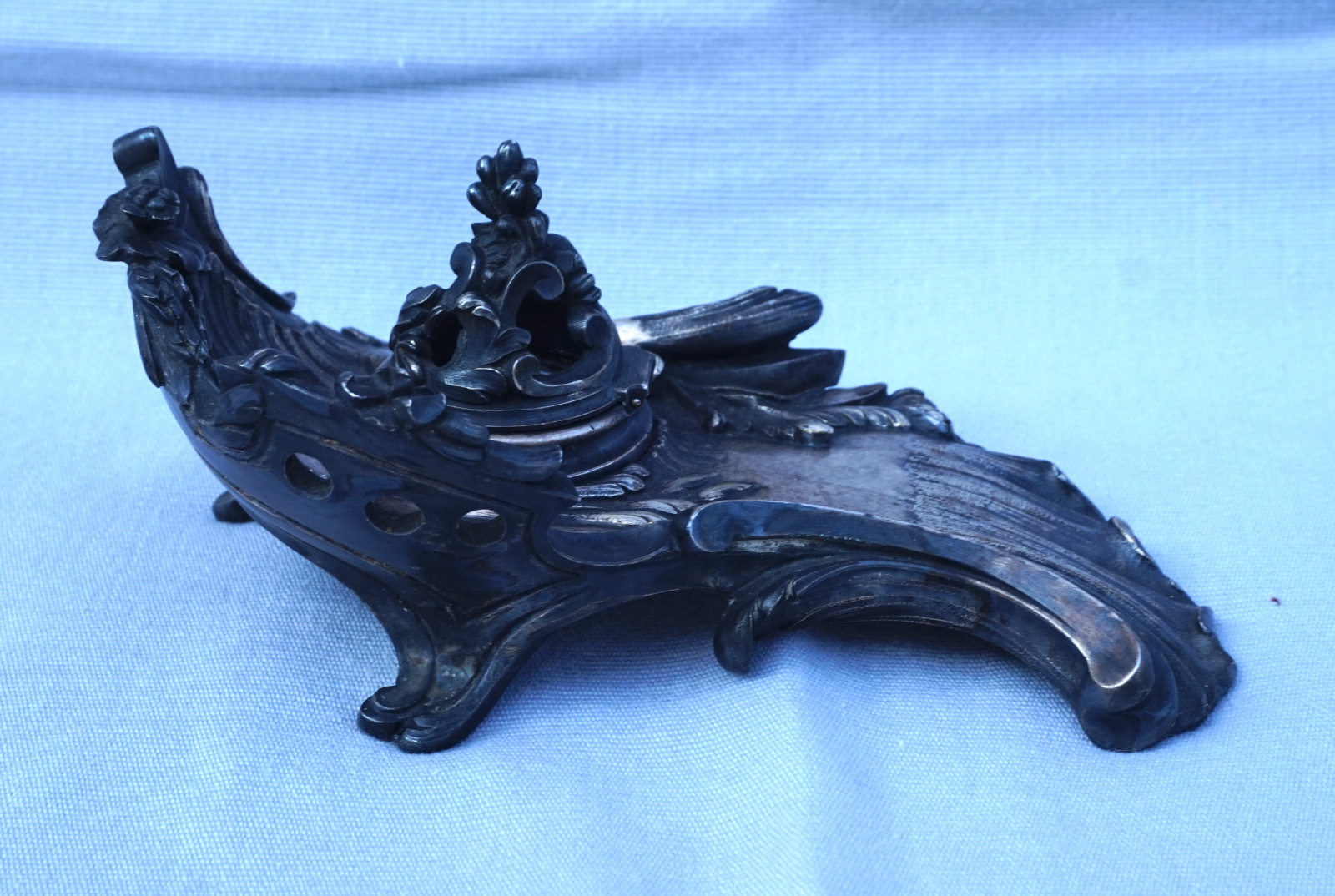 French nickel silver in Rococo Louis Xv style made during the second half of the 19th century.6 1/2" (16.5cm) length, 4 3/4" (12cm) width, 2 1/2" (6.5cm), weight 1lb5oz (620 grams). Perfect condition and complete with glass inkwell.