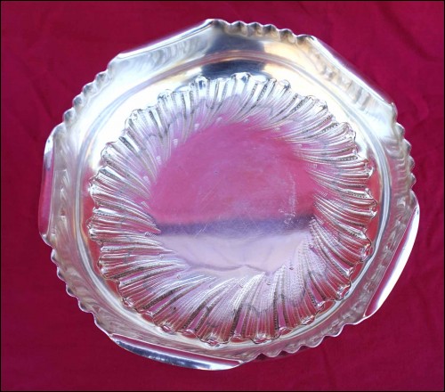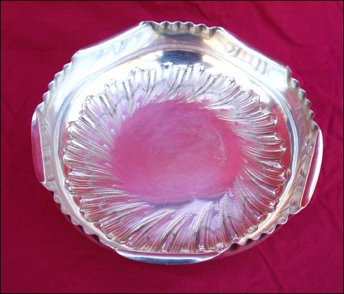 Coupe de présentation en métal argenté à décor rocaille. 22.2 cm diamètre, 8.3 cm hauteur. Bel état d'usage