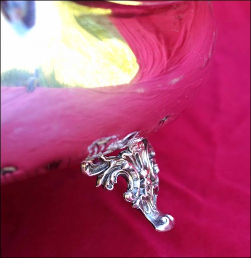 French Rococo style centerpiece fruit candy dish in silver plated. The hallmark on the bottom is unreadable. 8 3/4" (22.2cm) diameter, 3 1/4" (8.3cm) height. Good condition a few small used as shown by the following pictures.