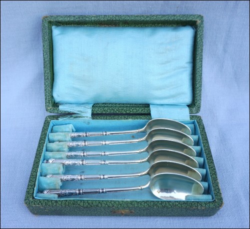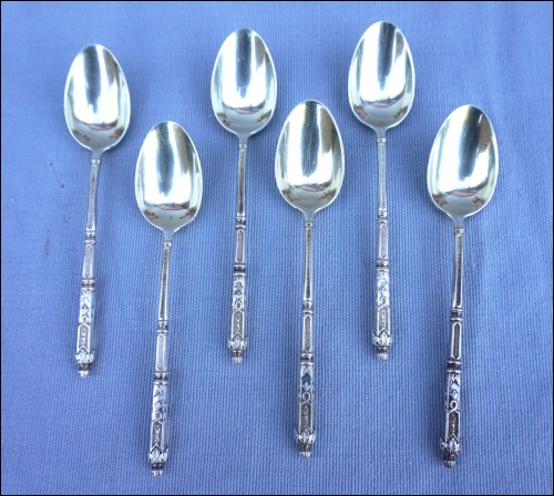 French silver plate set of 6 dessert coffee spoons "A la Russe" model made by SFAM. They are hallmarked. 5 1/4" (13.5cm) length. Beautiful condition, the box is slightly used as shown by the following pictures.