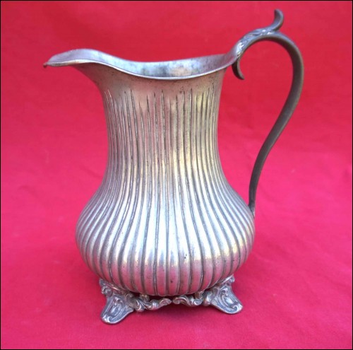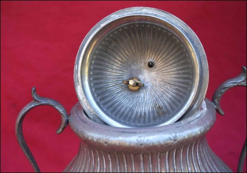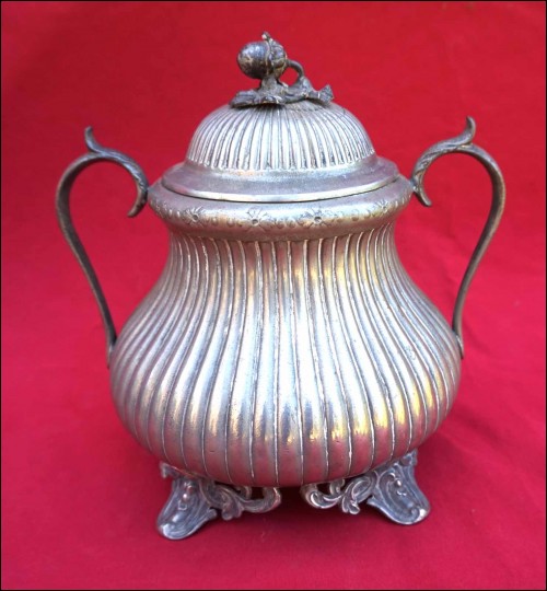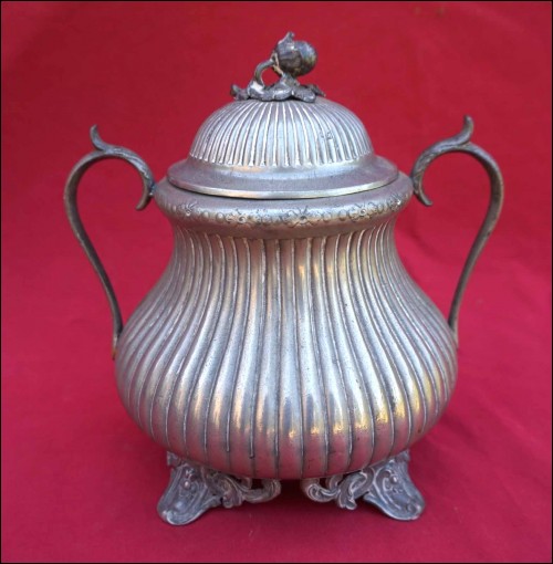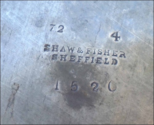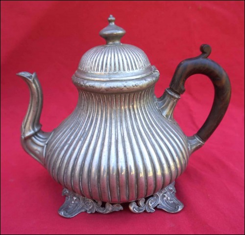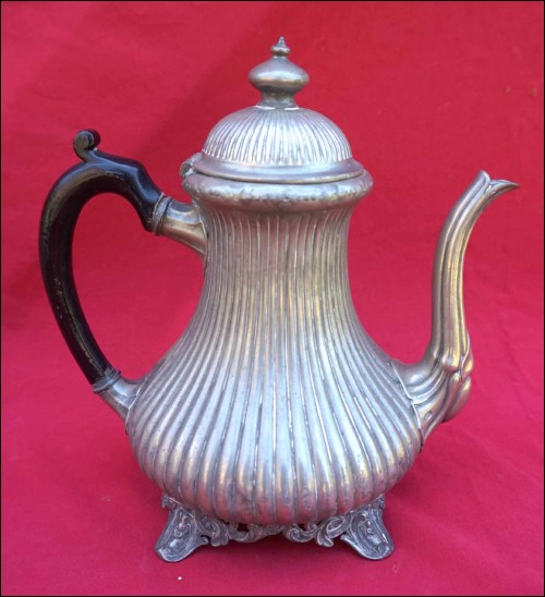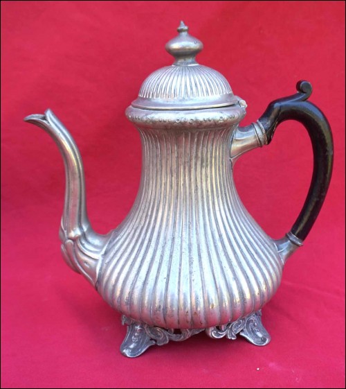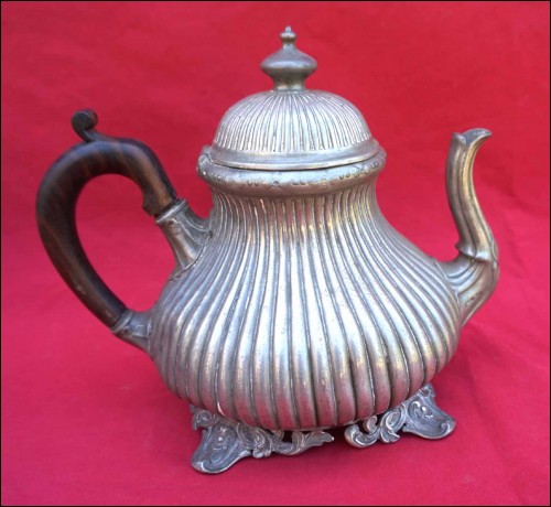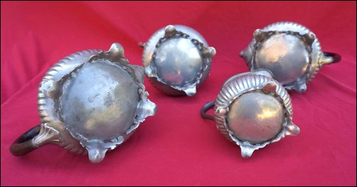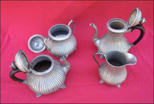 Tea coffe set with creamer and sugar pot in polish pewter made by Shaw & Fisher (1835-1894) in Sheffield during the 1870's. They are stamped Shaw & Fisher Shefffield 1520 72 4. They measure for the tea pot 7 1/8" (18cm) height, 8 5/8" (23cm) width; for the coffee pot 8 5/8" (23cm) height by 8 5/8" (23cm) width; for the creamer 5 1/2" (14cm) height by 5 7/8" (15cm) width and for the sugar pot 7 1/8" (18cm) height by 7 1/2" (19cm) width. Good condition only the lid of the sugar pot has been repair with screw inside as shown by the following pictures.