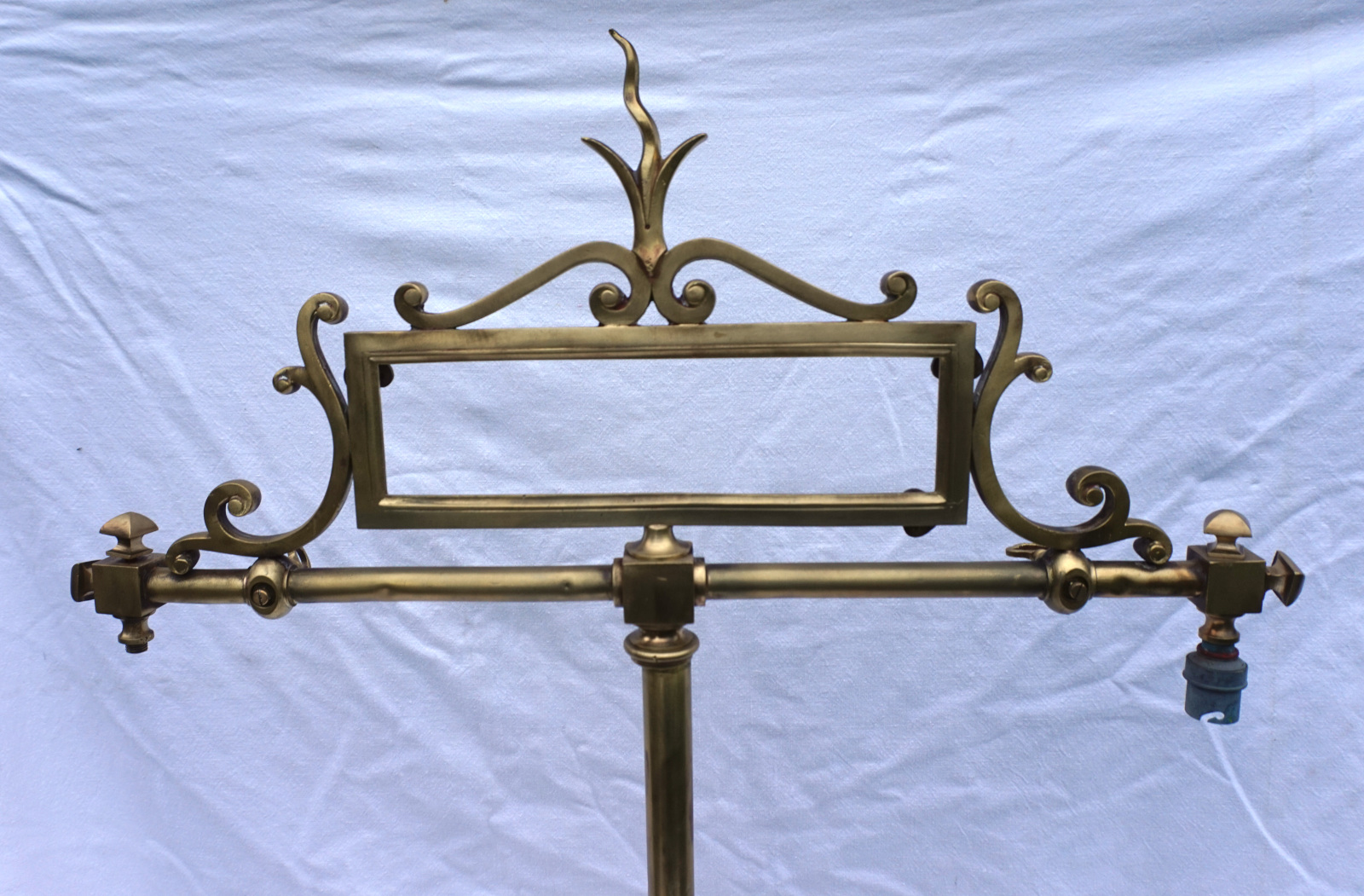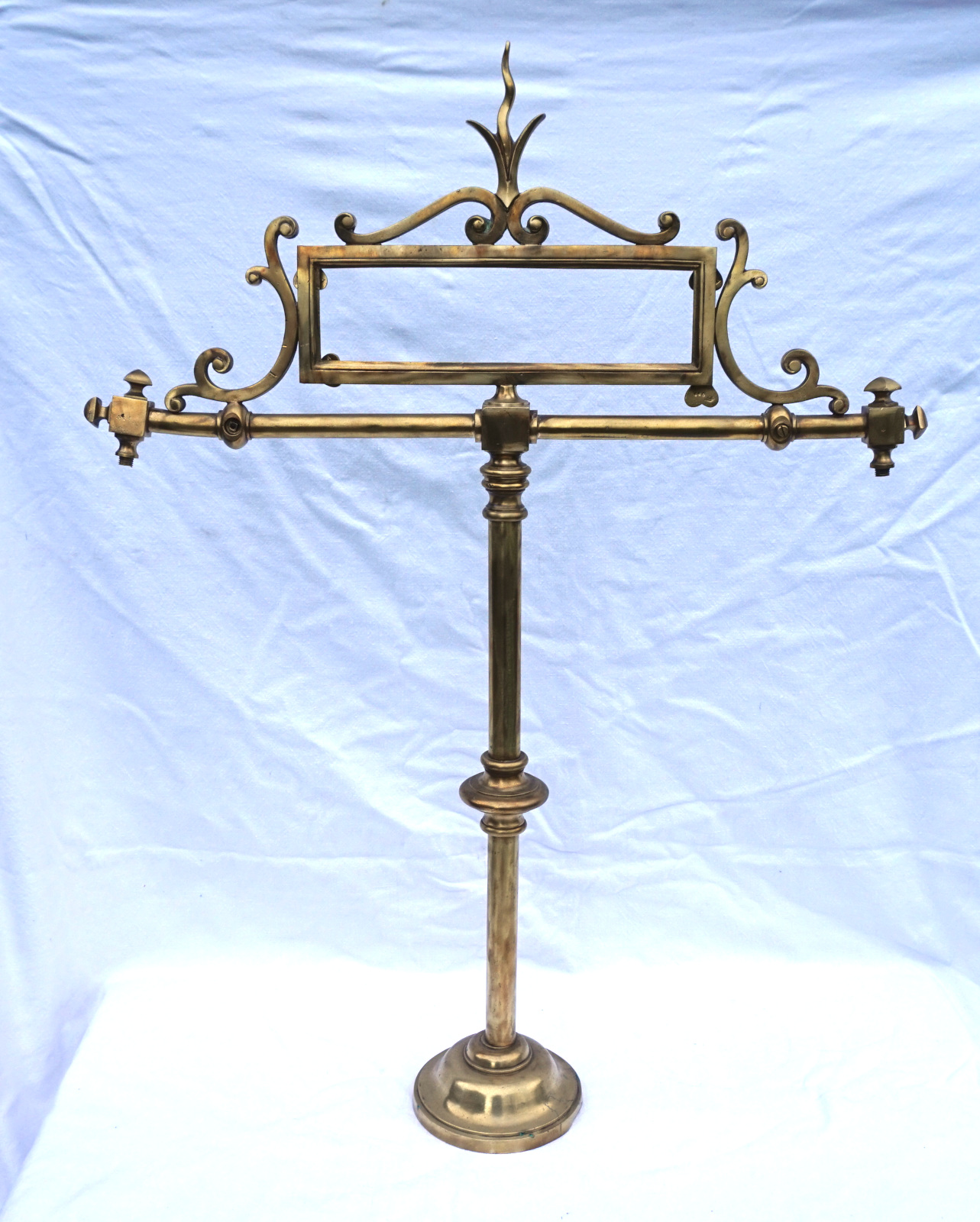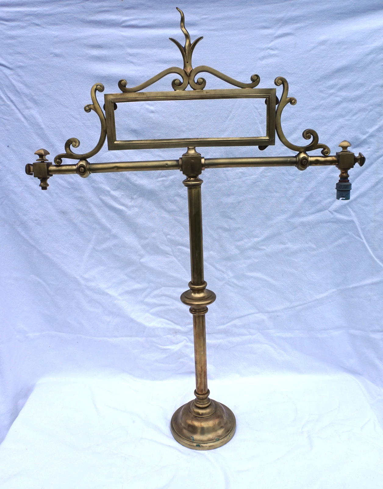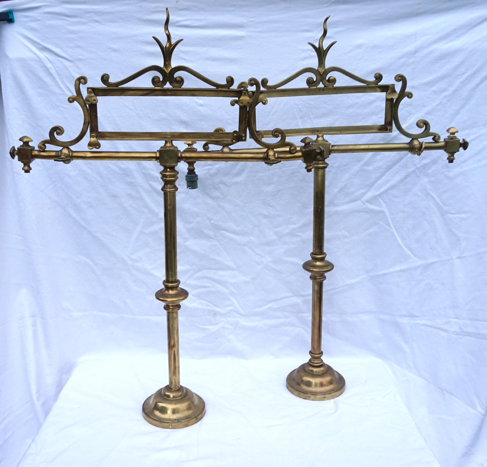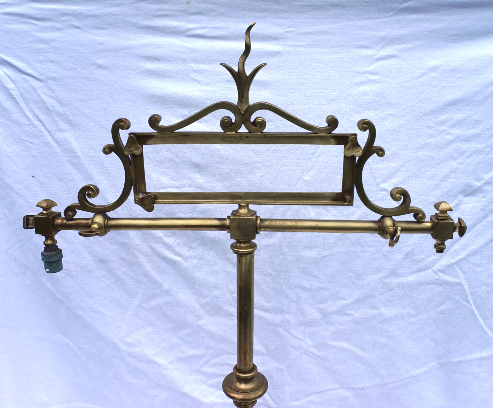 Paire de porte panonceaux de comptoir d'hotel ou magasin en laiton avec 2 sorties d'éclairage au gaz vers 1850. Ils sont signés, mais pour nous, illisible. Hauteur totale 83 cm, largeur 62 cm, pour l'encadrement du pannonceau hauteur 9 cm, largeur 29 cm. Très bel état, manque un locket de maintient pour pannonceau.