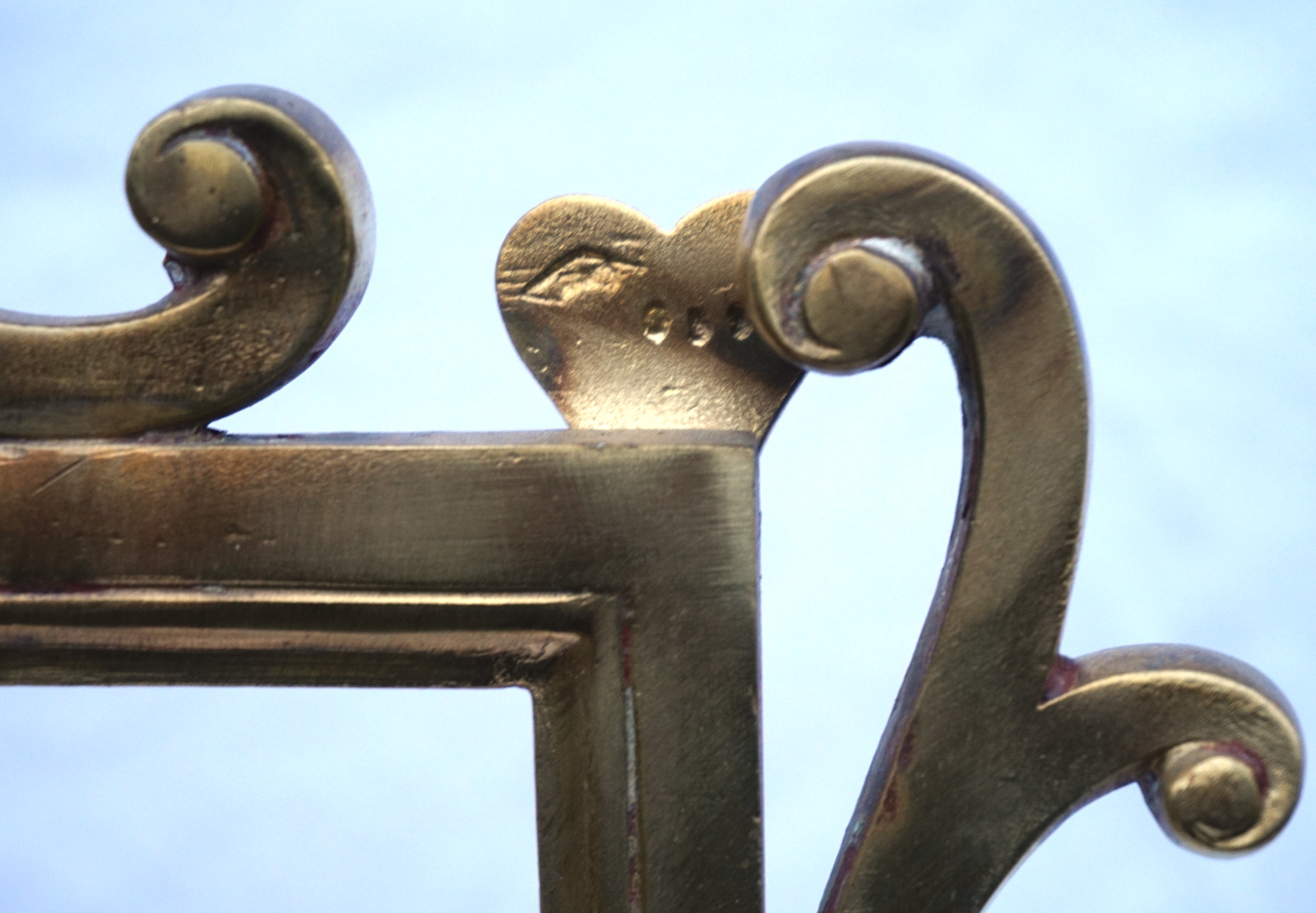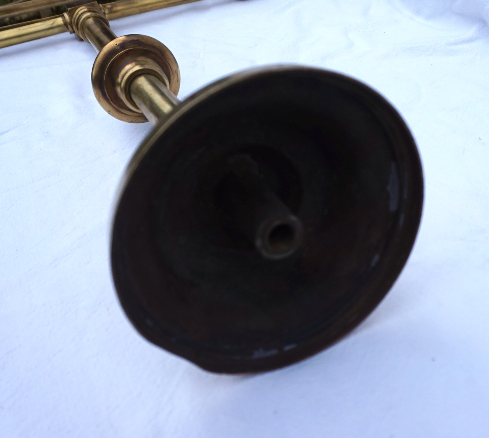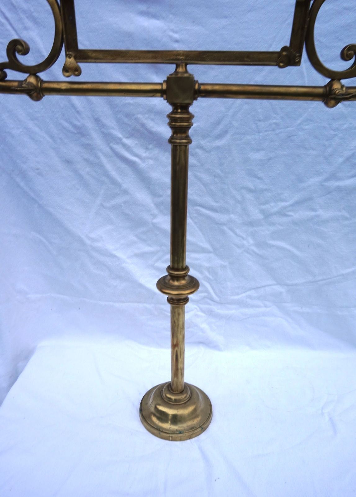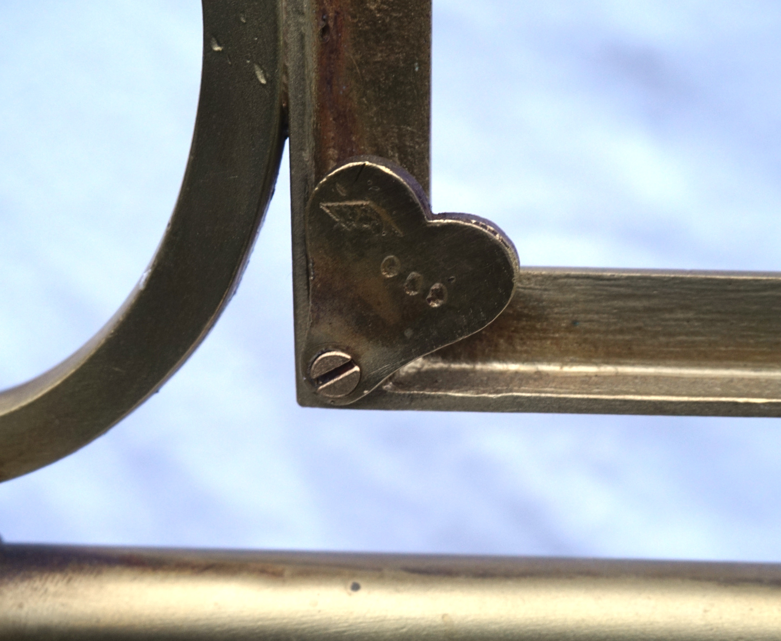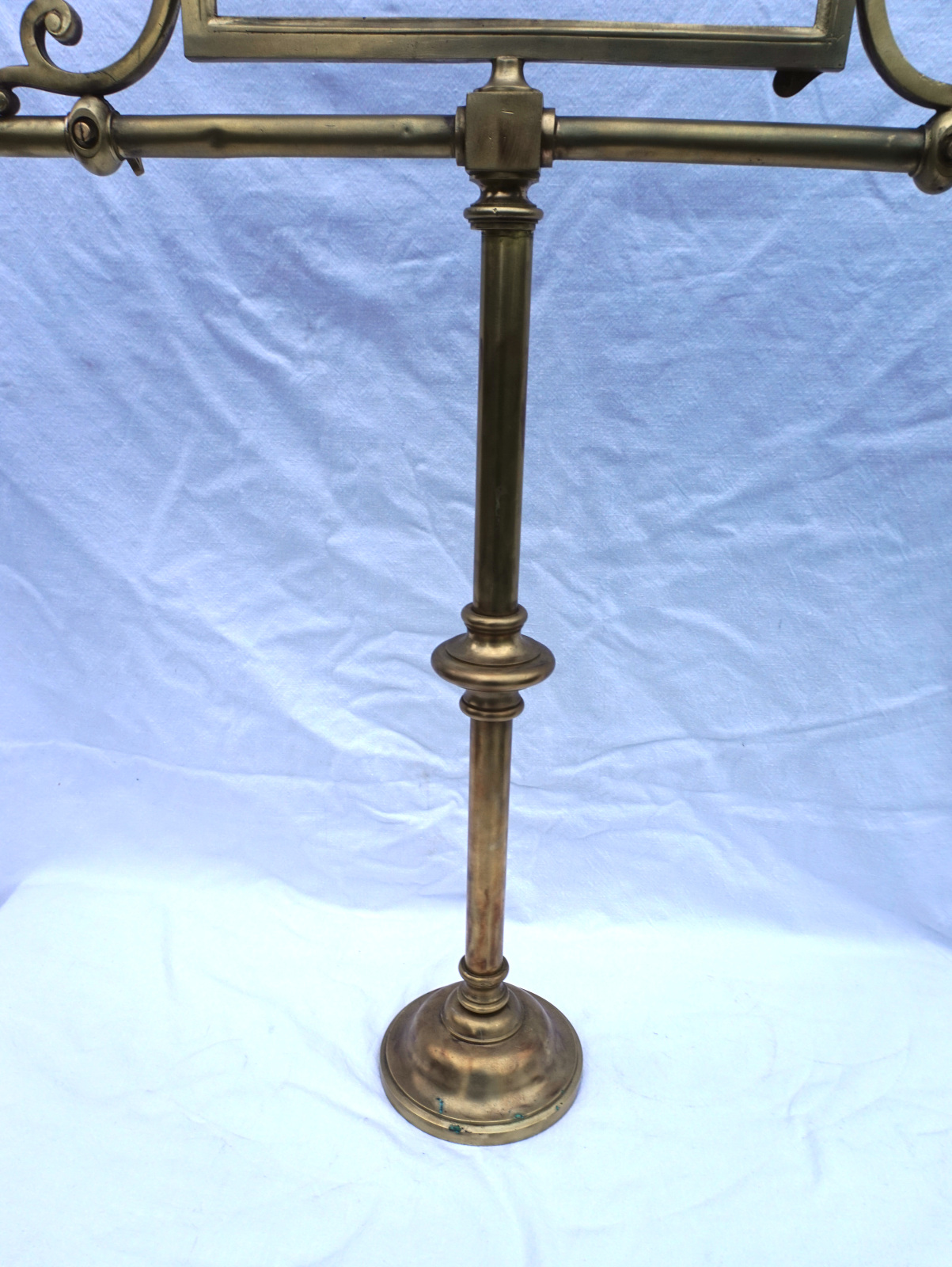 Paire de porte panonceaux de comptoir d'hotel ou magasin en laiton avec 2 sorties d'éclairage au gaz vers 1850. Ils sont signés, mais pour nous, illisible. Hauteur totale 83 cm, largeur 62 cm, pour l'encadrement du pannonceau hauteur 9 cm, largeur 29 cm. Très bel état, manque un locket de maintient pour pannonceau.