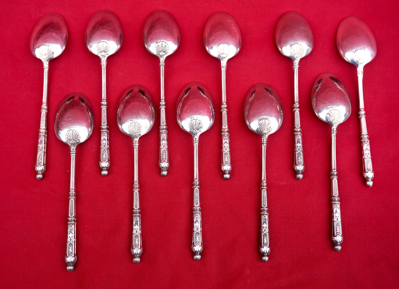 French silver plate 11 moka coffee demi tasse spoons russian model made by SFAM Parisduring the 1920's. They are hallmarked. 4 1/4" (10.9cm) length. Perfect condition.