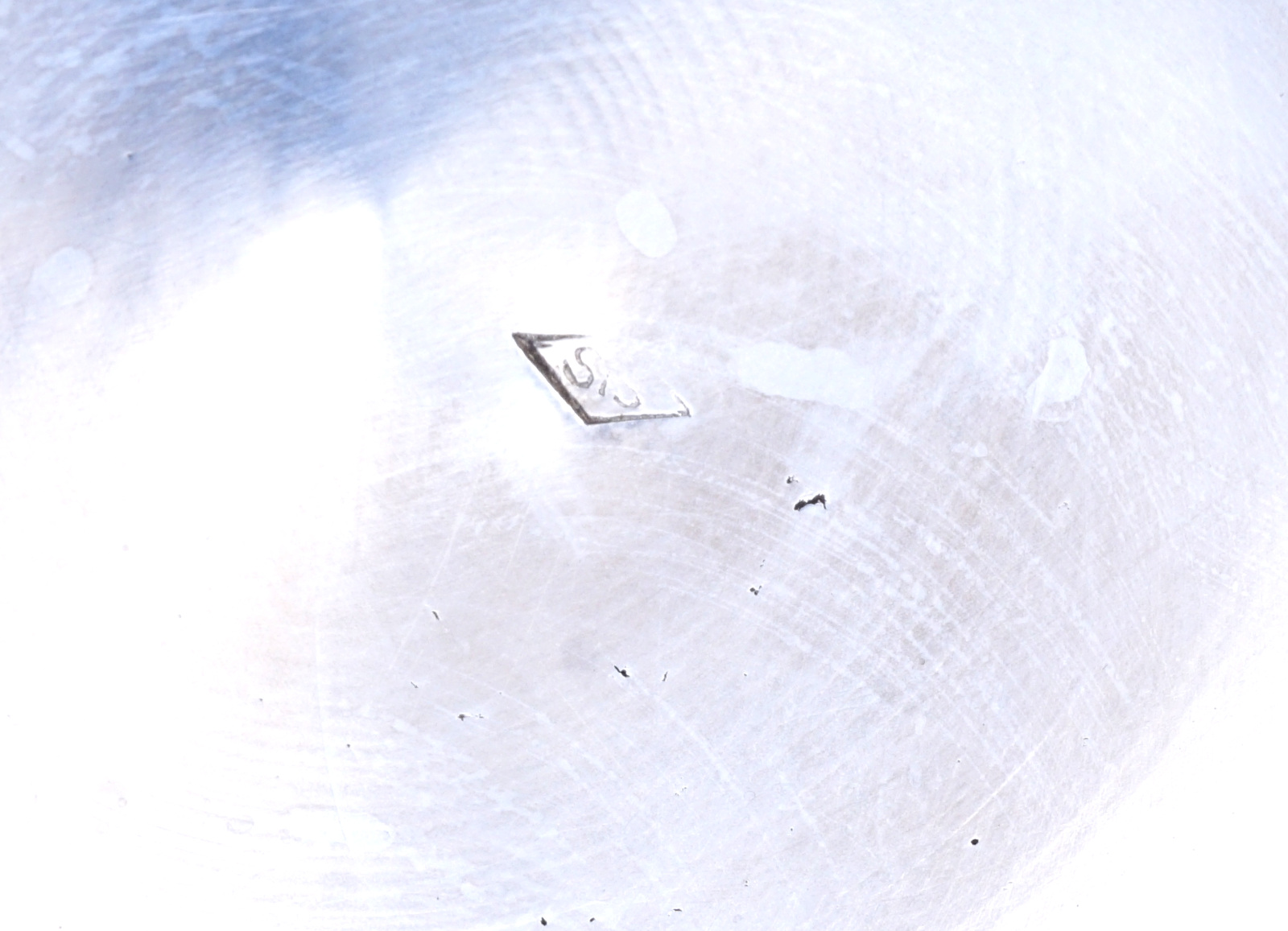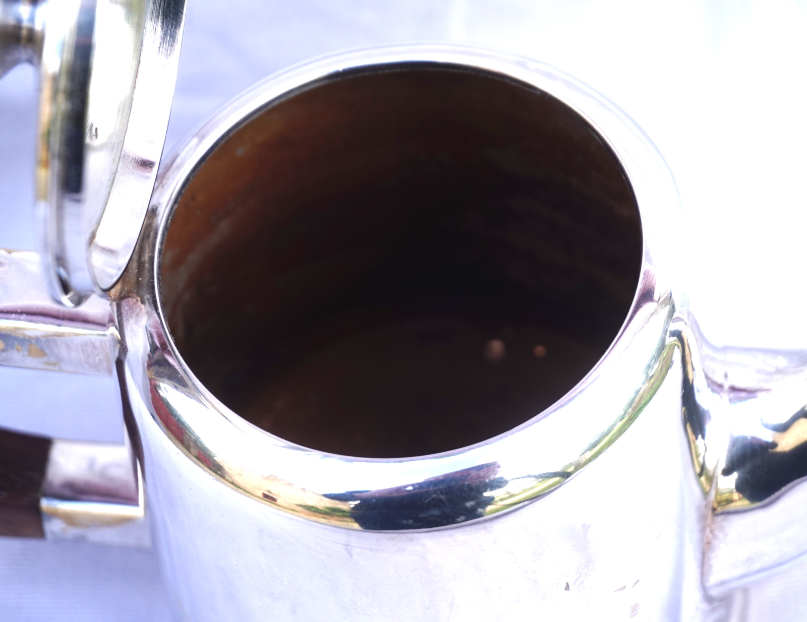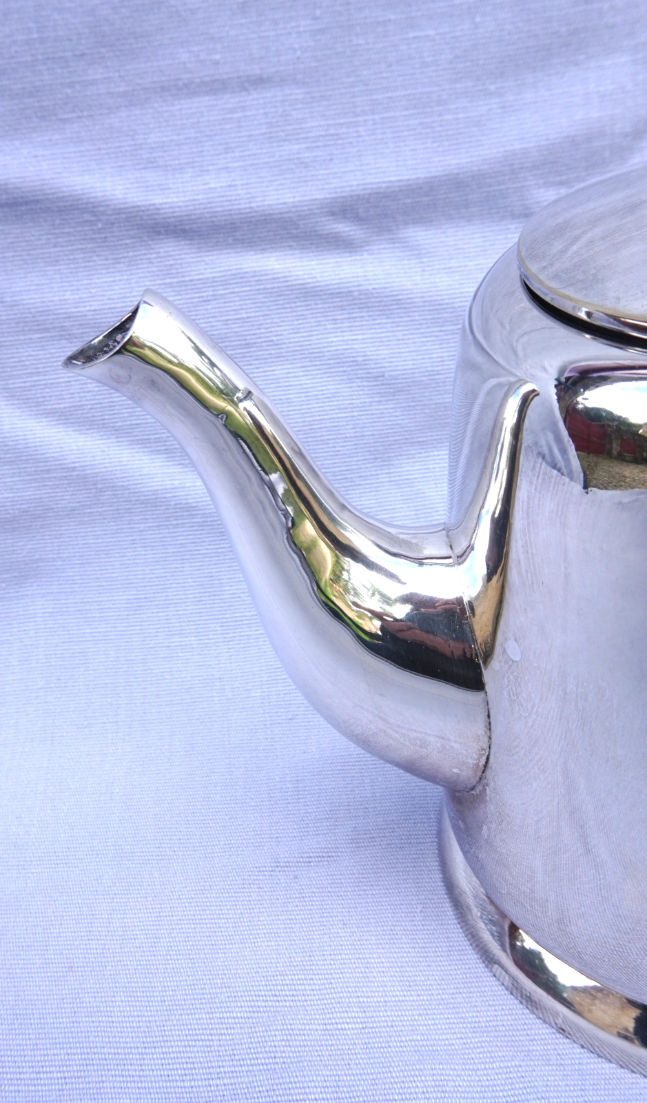 Théière en métal argenté et poignée palissandre orfèvrerie SIS vers 1950. Elle est poinçonné sur son fond. Hauteur 17 cm, largeur avec le bec 21 cm, diamètre à la base 12 cm, poids 985 gr. Bel état, quelques manques d'argenture.