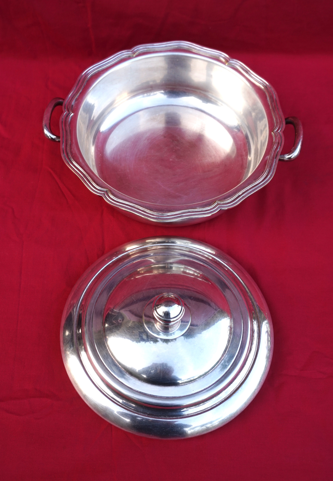 French silver plate vegetable lidded dish tureen made by Gustave Aubry during the 1960's. It's hallmarked with the Gustave Aubry mark on the bottom. 9 1/2" (24.2cm) diameter, 11" (28cm) width with handles, 4 1/2" (11.5cm) height with lid, weight 2lbs 6oz. Good condition a few tiny usedas shown by the following pictures.