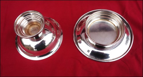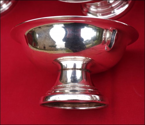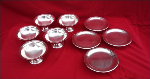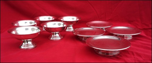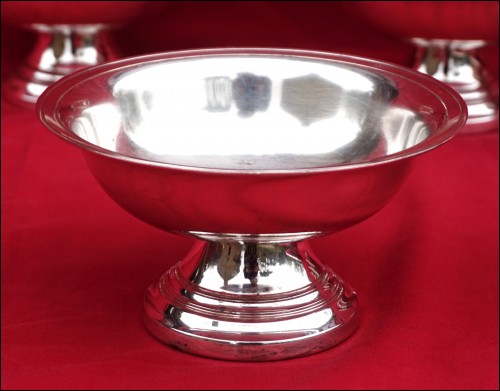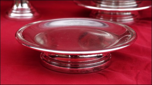 French silverplate set of 9 dishes, 4 compotes footed dishes and 5 round bowl dishes, for wedding, party buffet made by Orfevrerie de France during the 1950's. They are hallmarked with the stamp of silversmith. They measures for the 4 compote dishes: 6 1/2" (16.5cm) diameter and 1 3/4" (4.5cm) height, and for the footed bowl dishes 5 1/2" (14cm) diameter and 3" (7.6cm) height. Beautiful condition a few tiny used as shown by the following pictures.