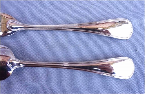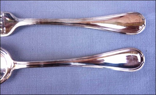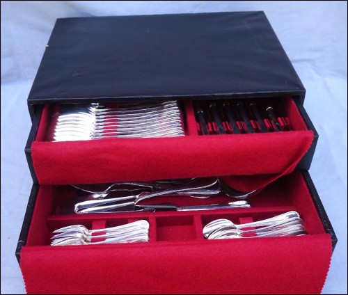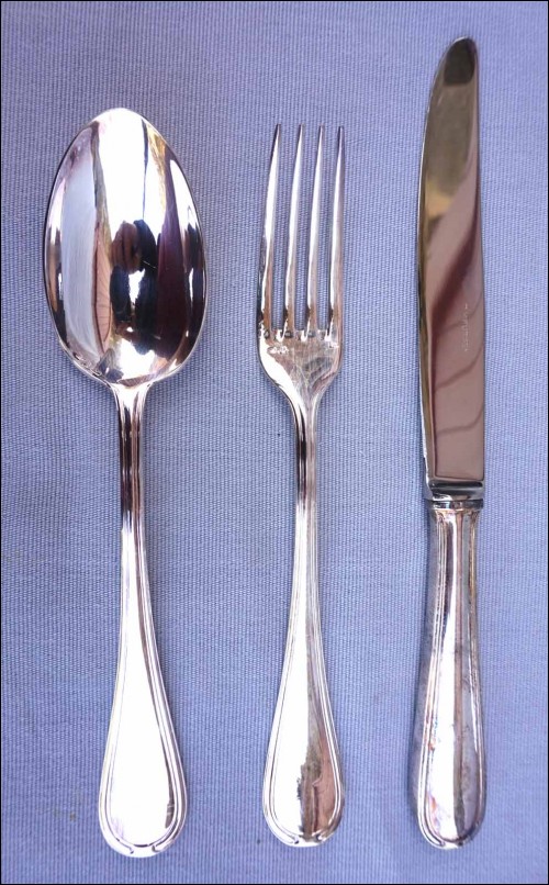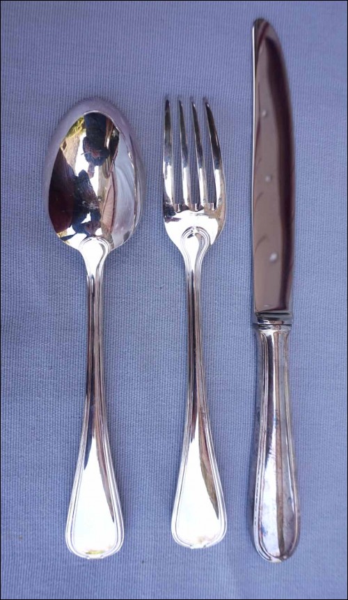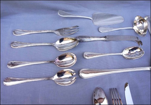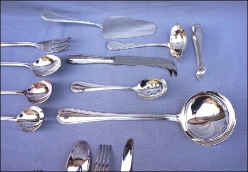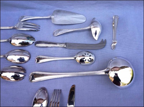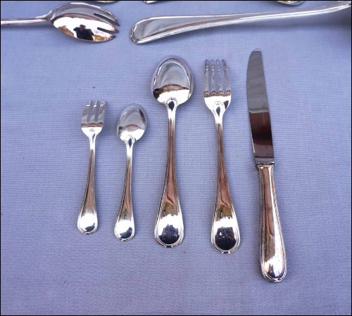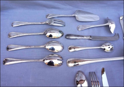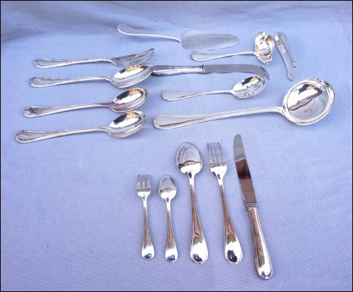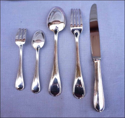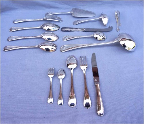 Ménagère en métal argenté modèle Senlis par Pierre Meurgey à Paris. Elle comprend:12 cuillers fourchettes , longueur 21cm, et couteaux de table (25cm), fourchettes à gateaux et cuiller à café dessert (14cm), pièces de service: louche, couteau à fromage, cuillère et fourchette à servir, couvert à salade, cuillère à glaçon, pelle à tarte, cuillère à sauce, pelle à tarte.Toutes les pièces sont poinçonnées de la marque de l'orfèvre.