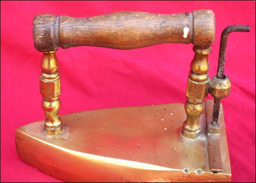 Antique french solid brass sad iron with sliding door for ingot (missing) and wooden handle made late 19th century. 7 1/2" (19cm) length, 4 1/4" (11cm) width, 5 1/2" (14cm) height, weight 3lbs 8.22oz (1.594 kilogram). Beautiful condition the ingot is missing as shown by the following pictures.