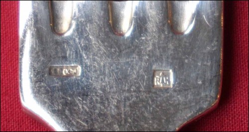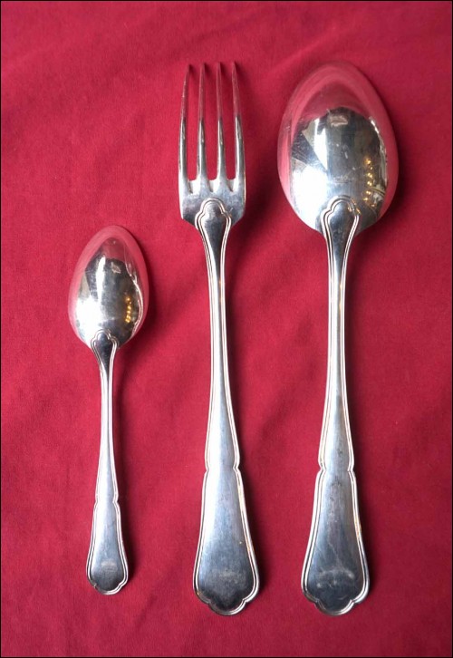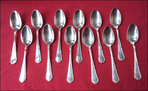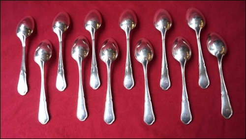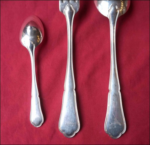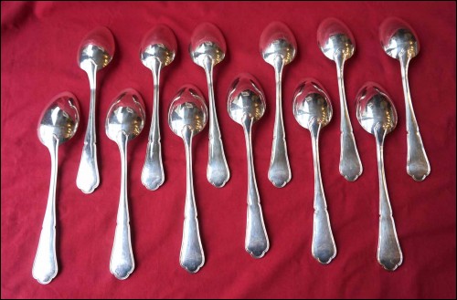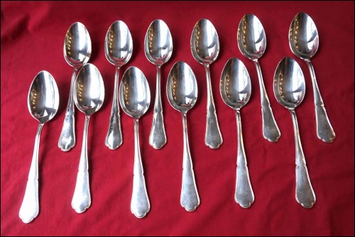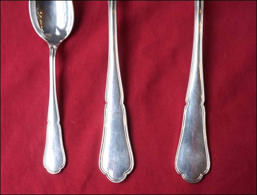 Ménagère de 36 couverts modèle Spatours, maïtre orfèvre R.H. Un petit moulin 1910 Hureau Raoul. Longueur des cuillères et fourchettes de table 21,5 cm, pour les cuillères dessert 14 cm. Bel état.