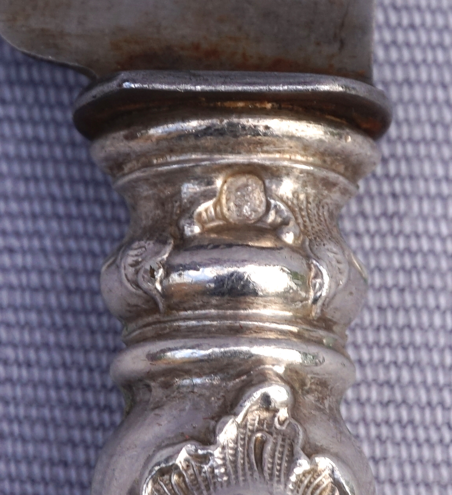 French sterling silver hollow handles 12 dinner knives in Louis XV style made late 19th centuiry. They are hallmarked with the head of Minerva, french sterling silver (.950) guarantee. 9 3/4" (24.8cm) length. Good condition, a few stains on the iron blade.