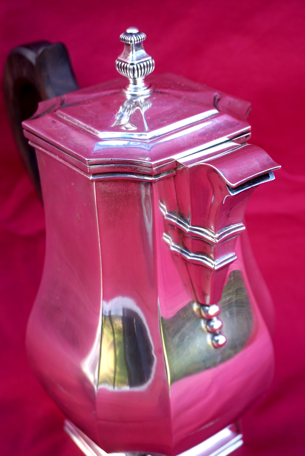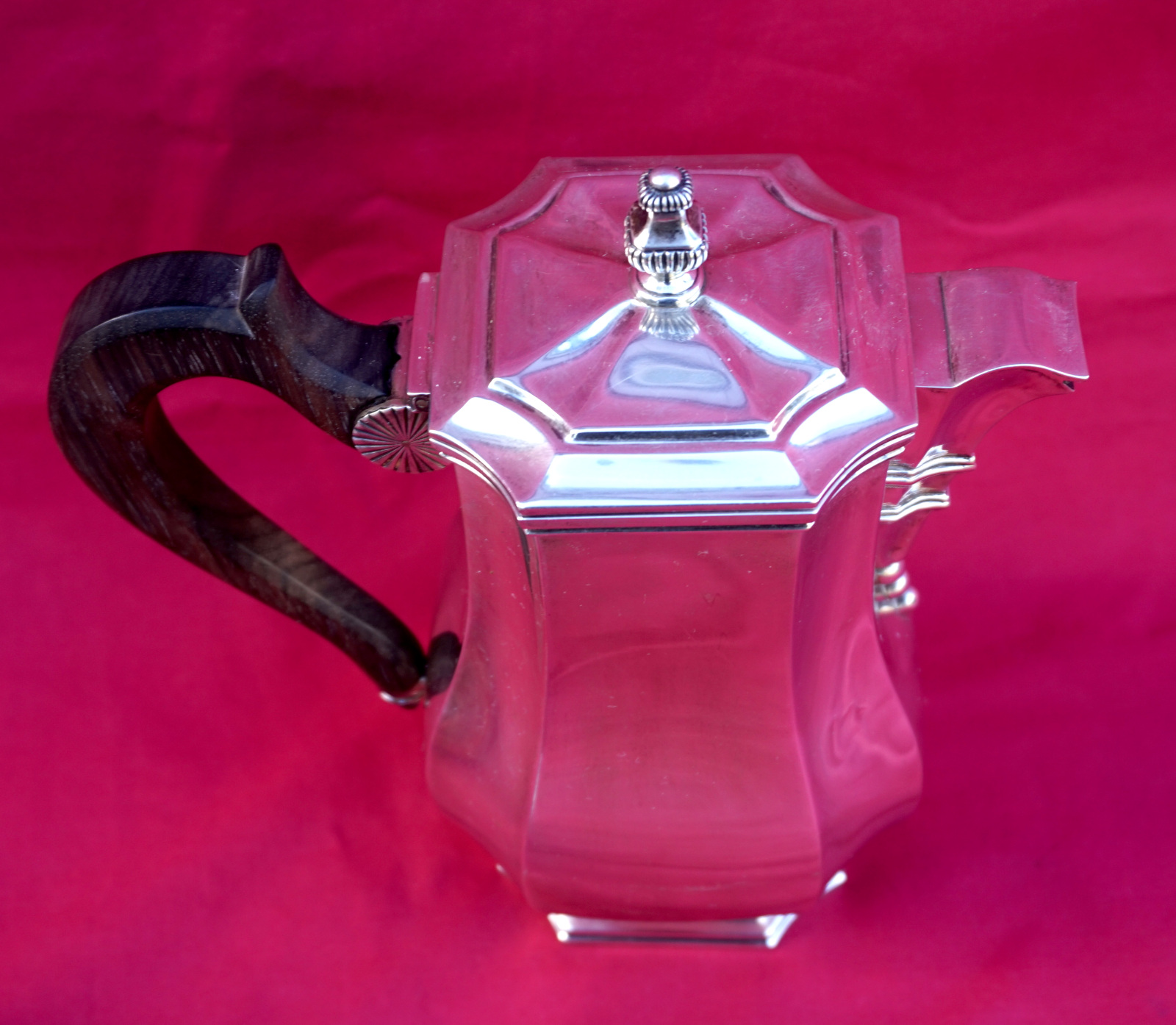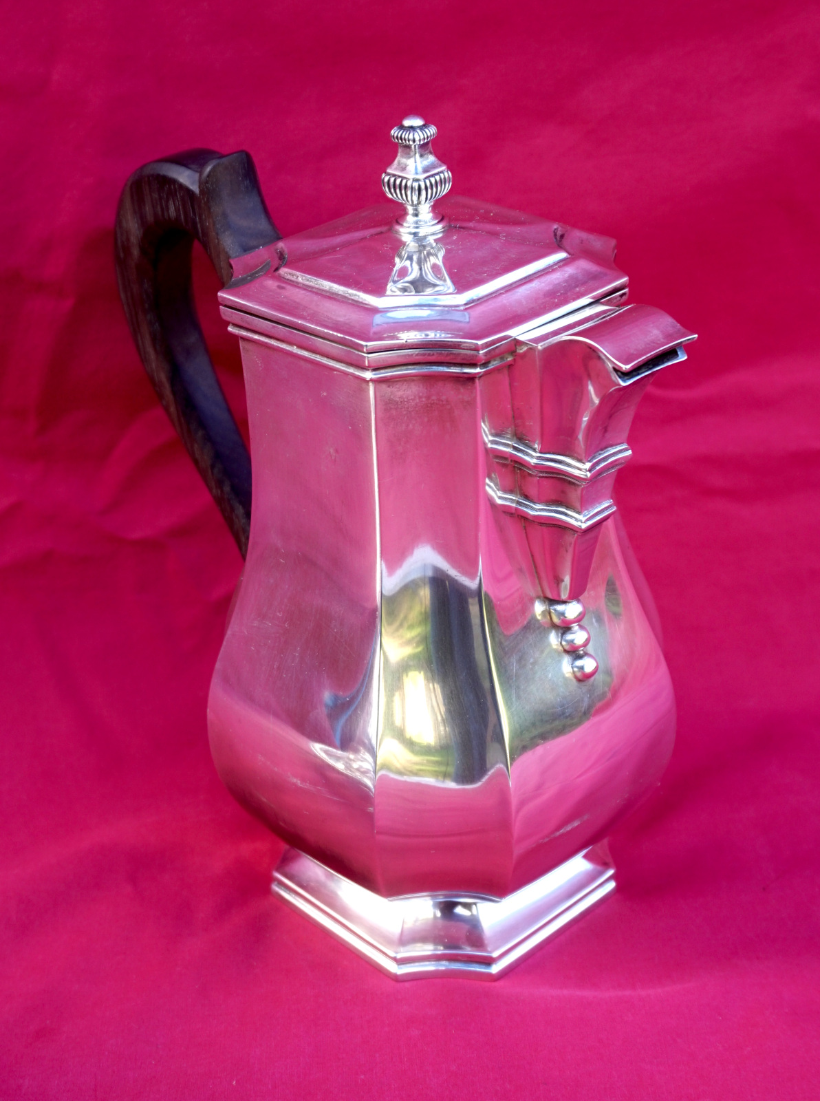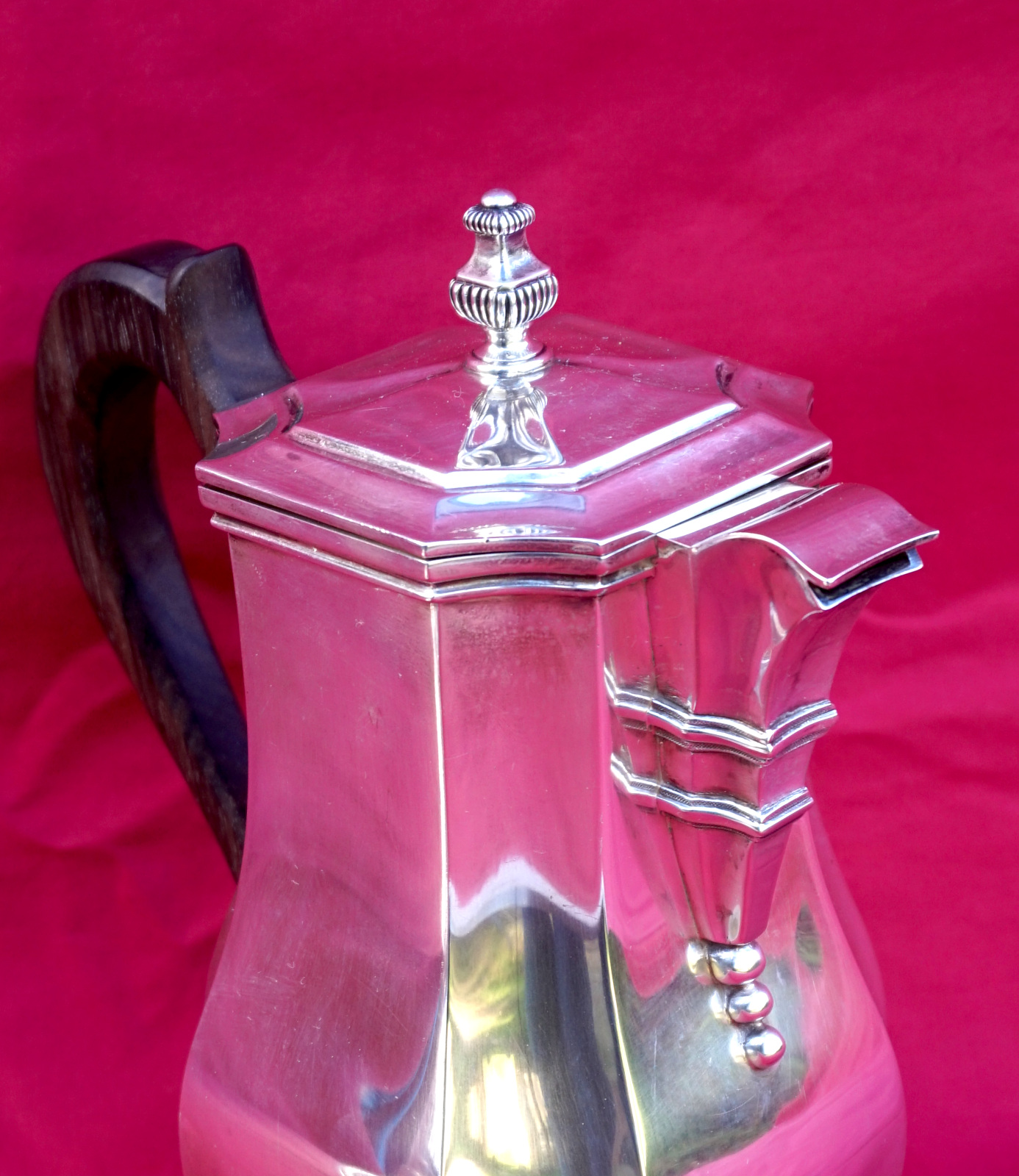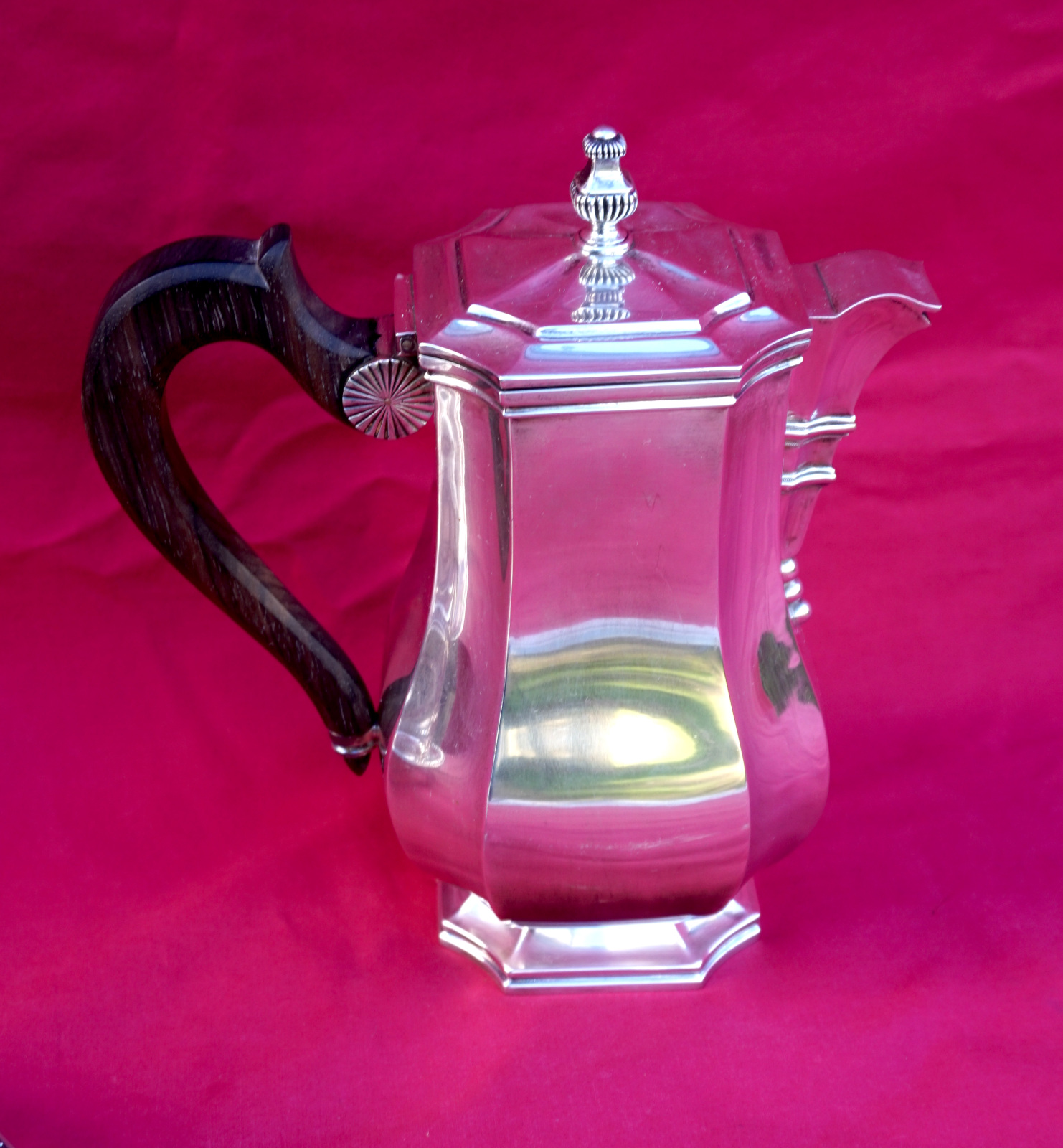 French sterling silver victorian coffee pot with palissander handle made Charles Tirbour in Paris during the 1900's. It's hallmarked with the head of Minerva (.950) and the Chrles Tiorbour mark. 8 1/2" (21.5cm) height, 7 1/4" (18.5cm) width, 4 3/8" (11cm) depth, weight 1lb 11oz (765 grams). Beautiful condition.