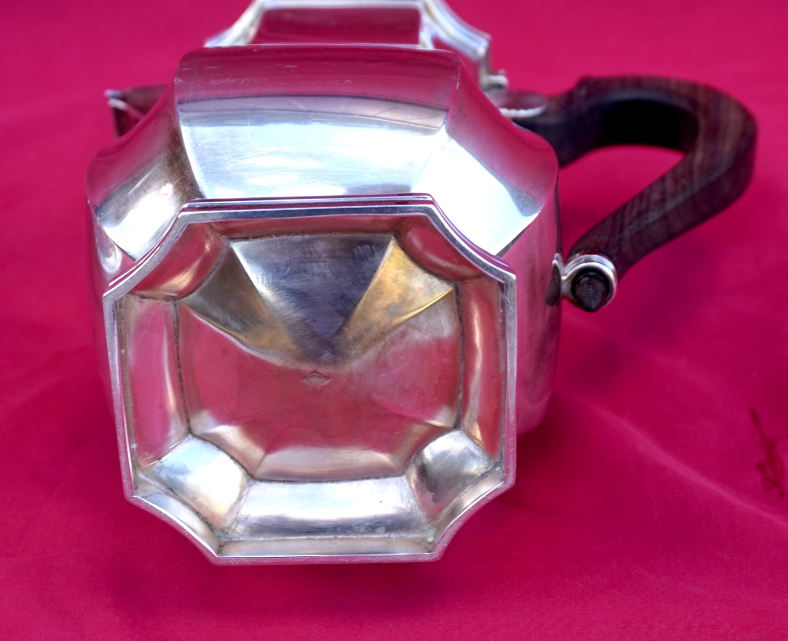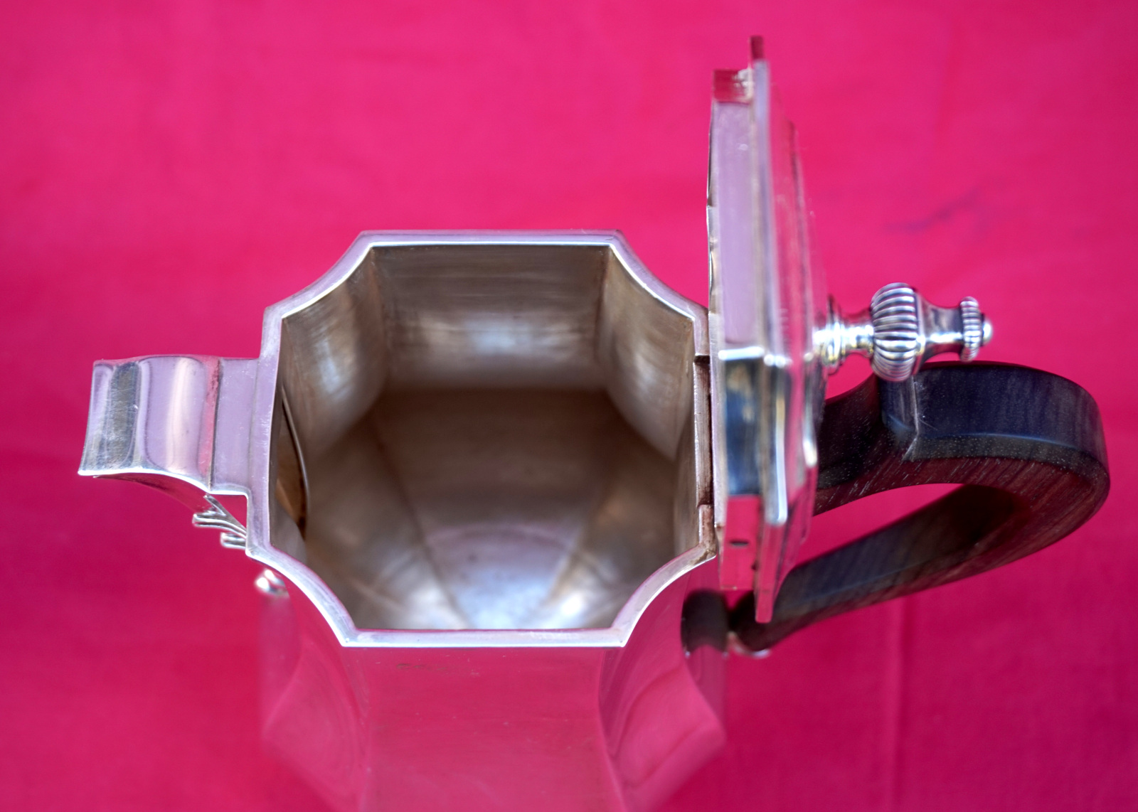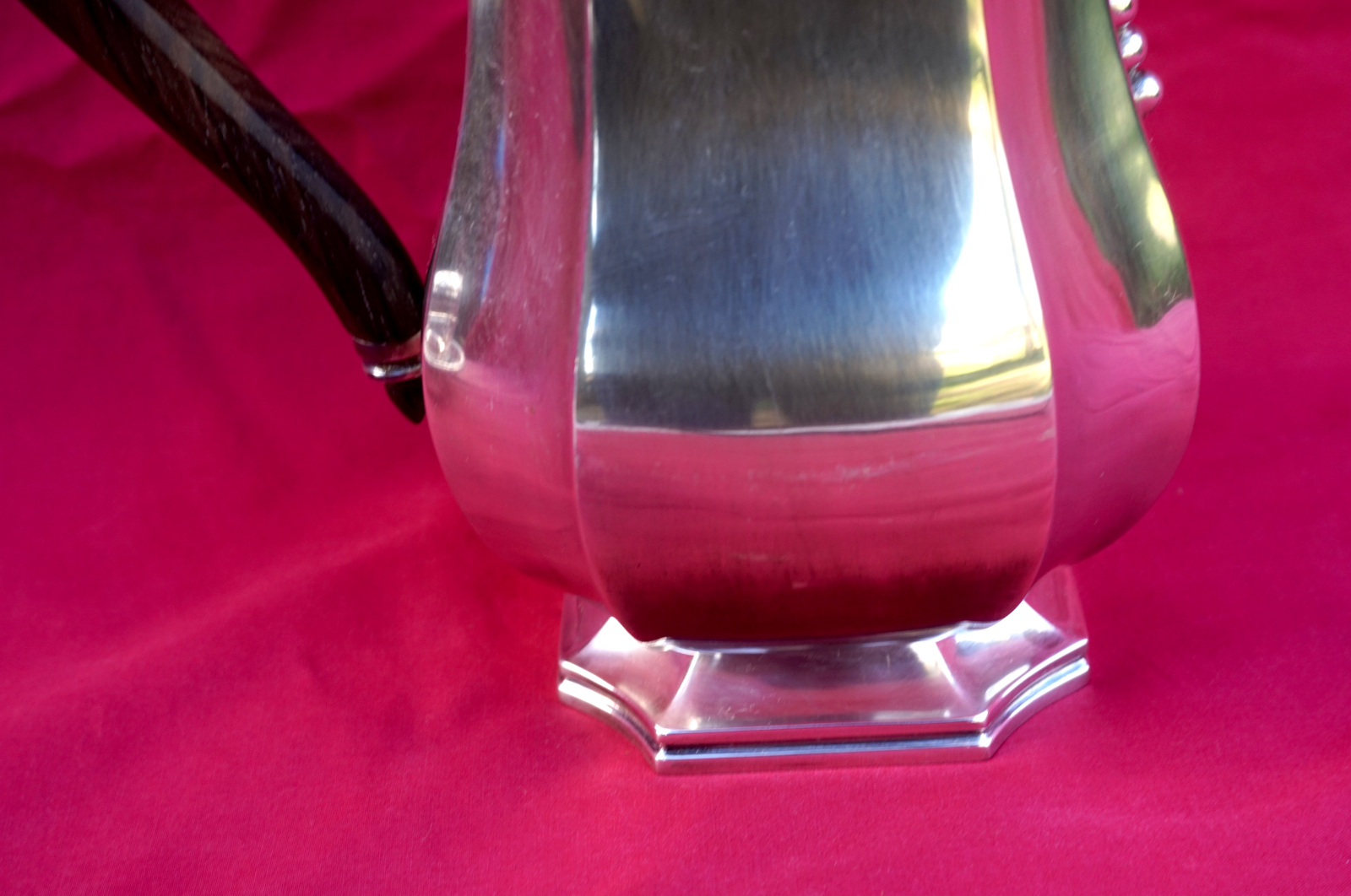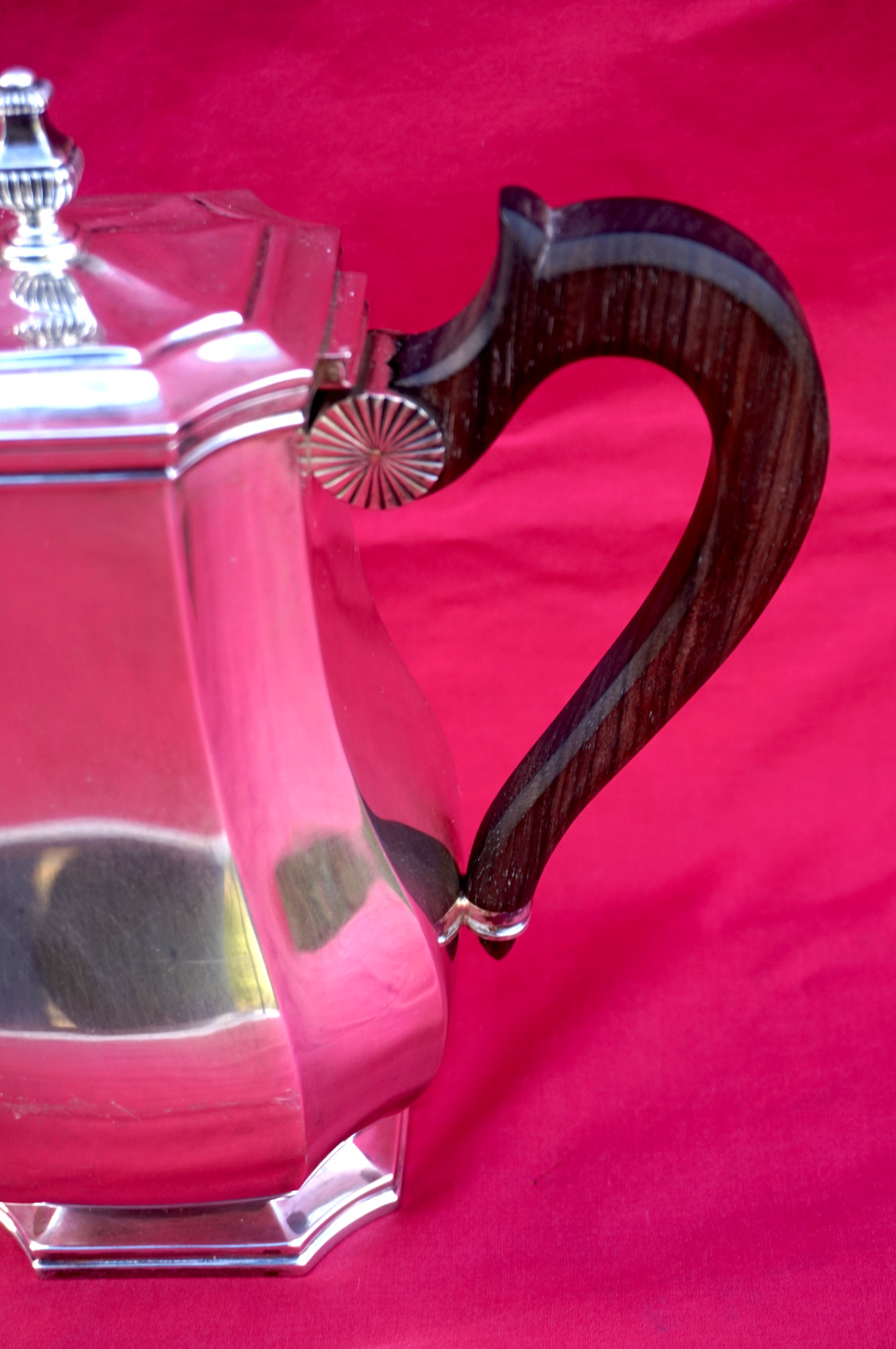 Verseuse en argent massif Moderne style à poignée palissandre , vers 1910. Elle est poinçonné de la tête de Minerve et de Charles Tirbour rue Chapon Paris. Hauteur 21.5 cm, largeur 18.5 cm, profondeur 11 cm, poids 764 gr. Très bel état.