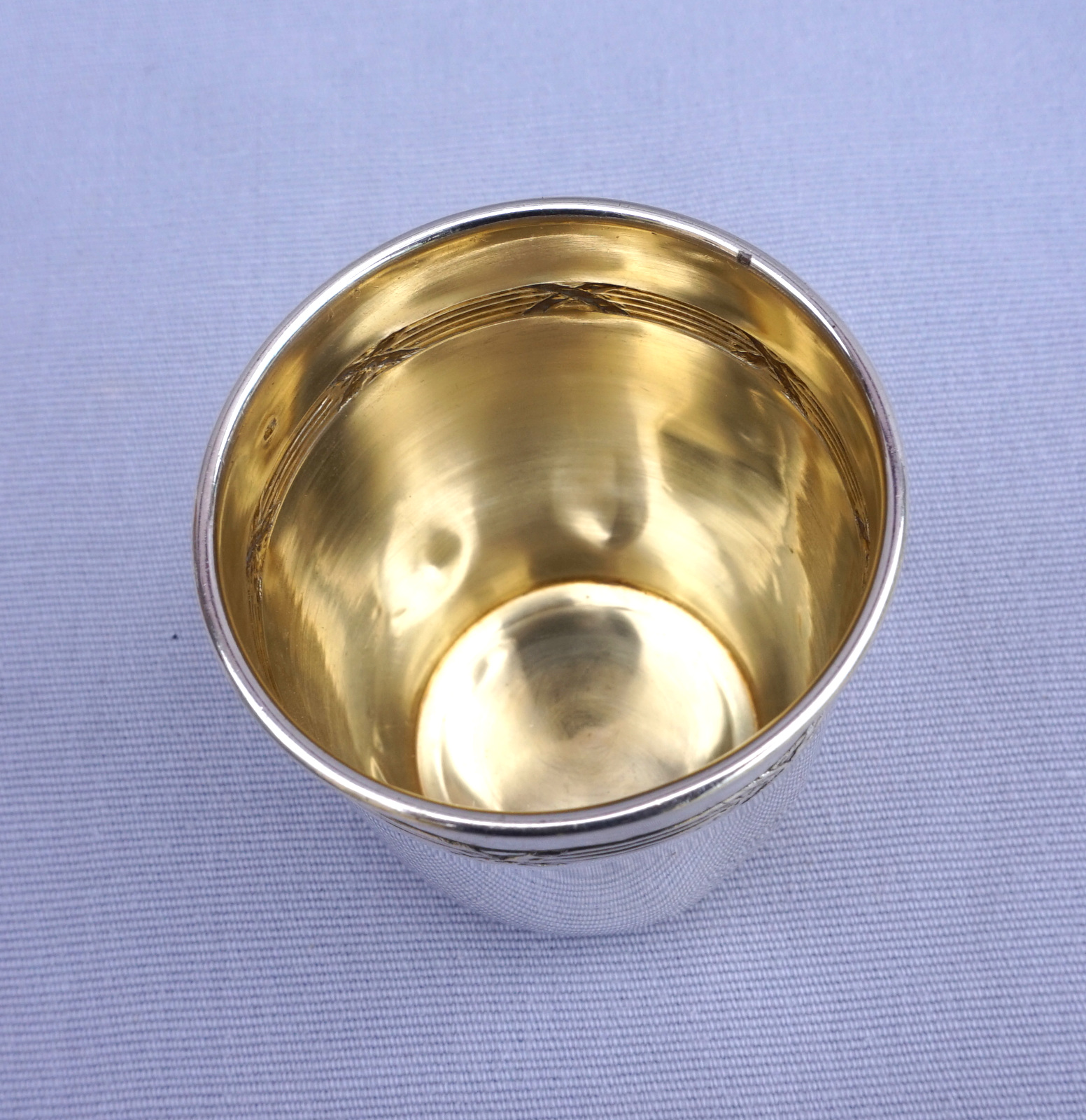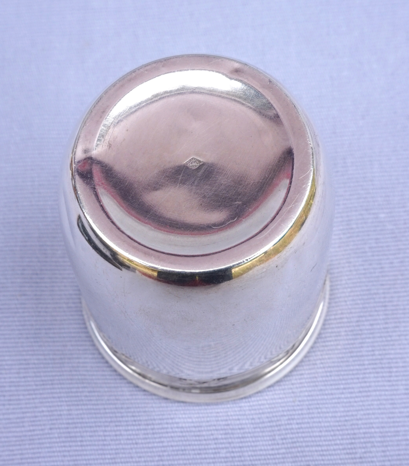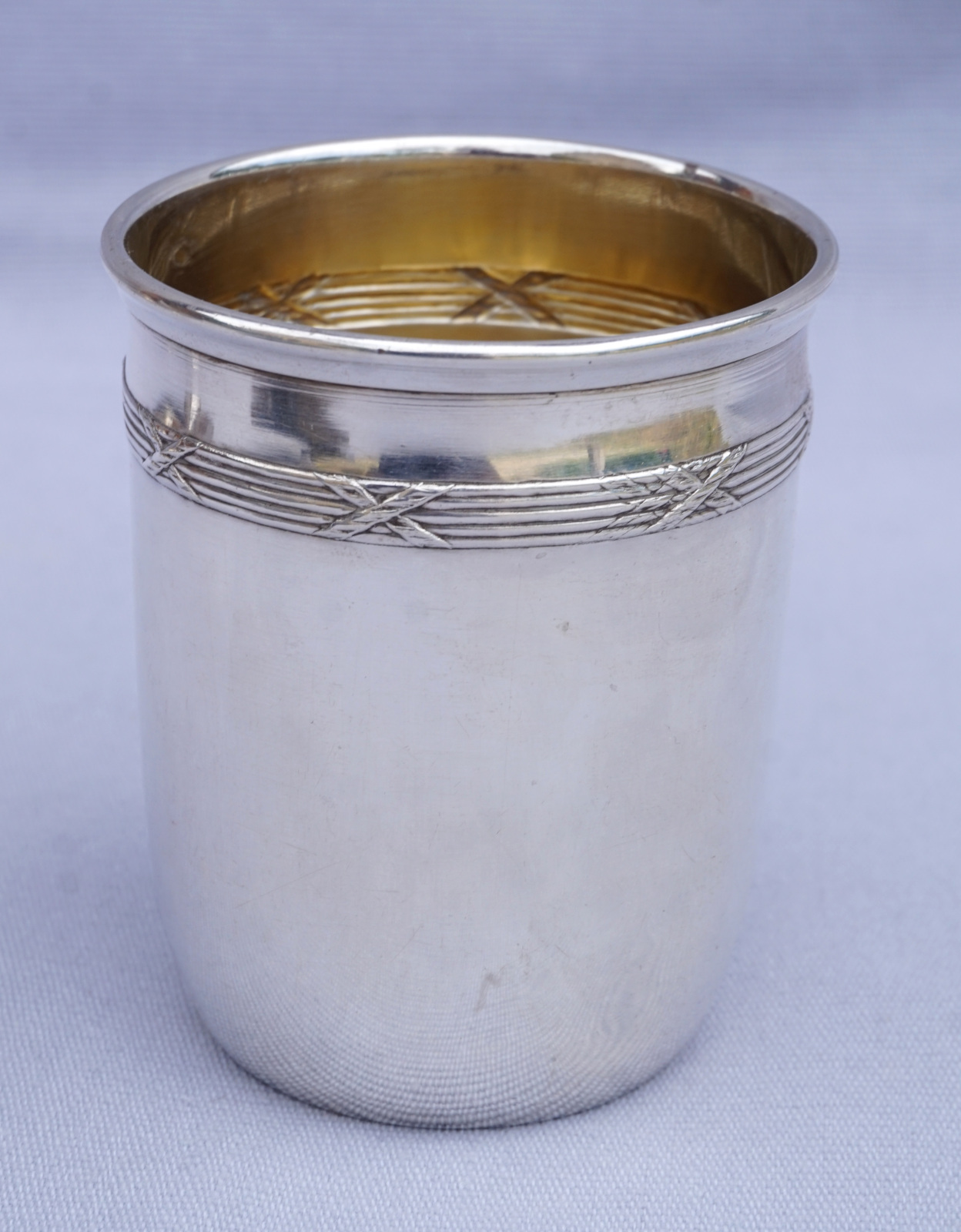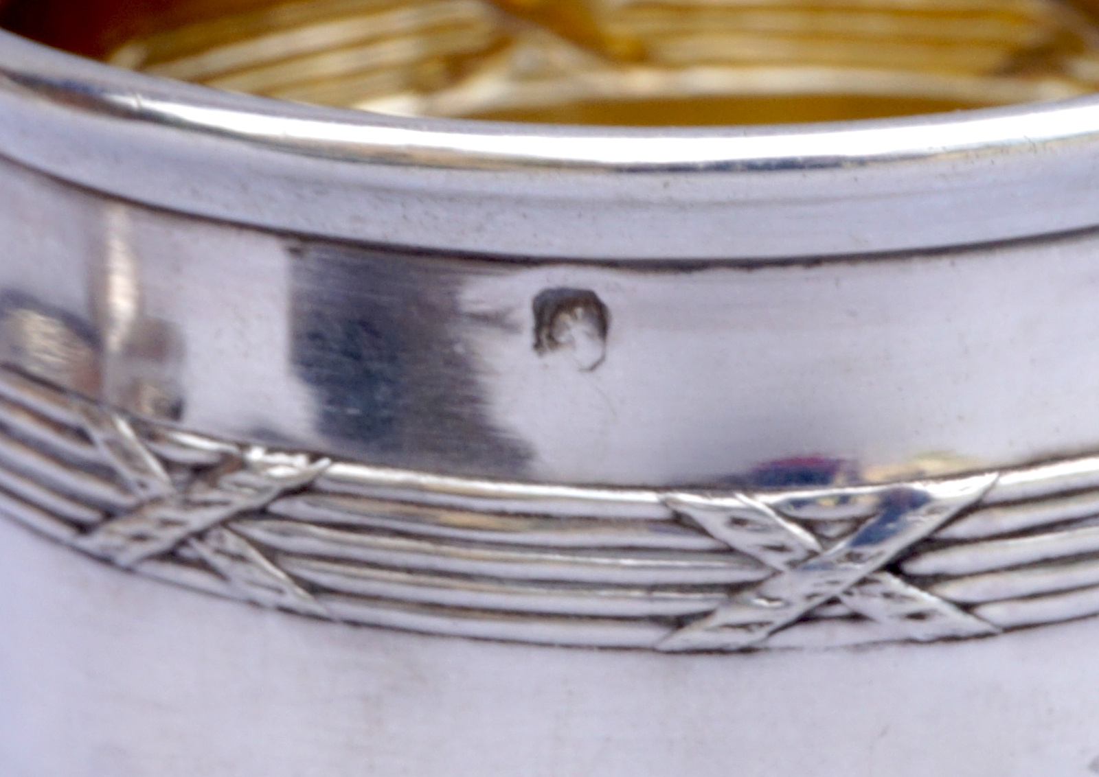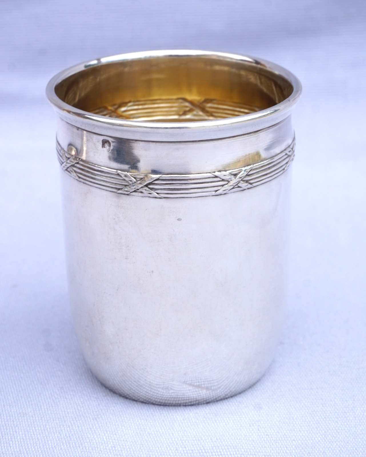 Timbale en argent massif à décor de rubans croisés, Par Hénin et Cie à Paris en 1896. Elle est poinçonnée de la Minerve, 1° titre, et de la marque de l'orfère. Hauteur 7.6 cm, diamètre 6 cm, poids 57.80 gr. Très bel état.