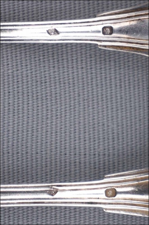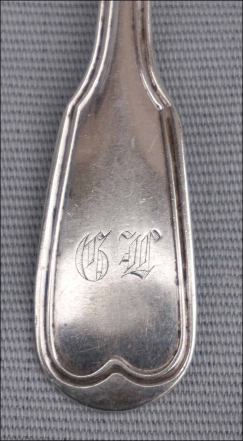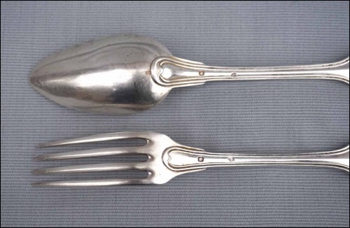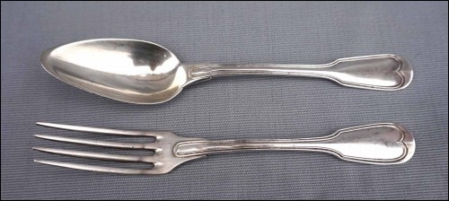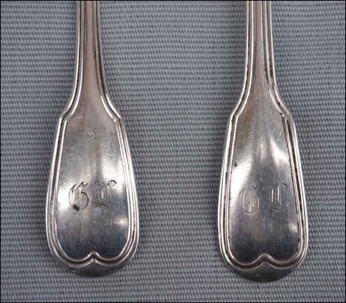 Couverts d'enfant, cuiller et fourchette, en argent massif monogrammé GU, poinçon Minerve et maitre orfèvre Claude Henri 1890. Longueur 18.3 cm, poids 96 gr. Bel état, quelques usures.