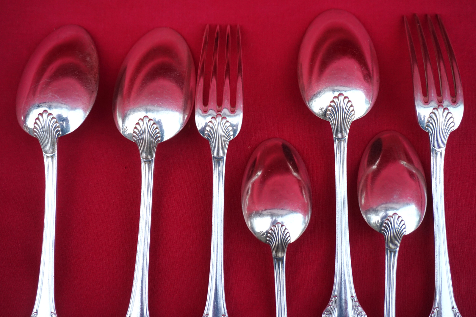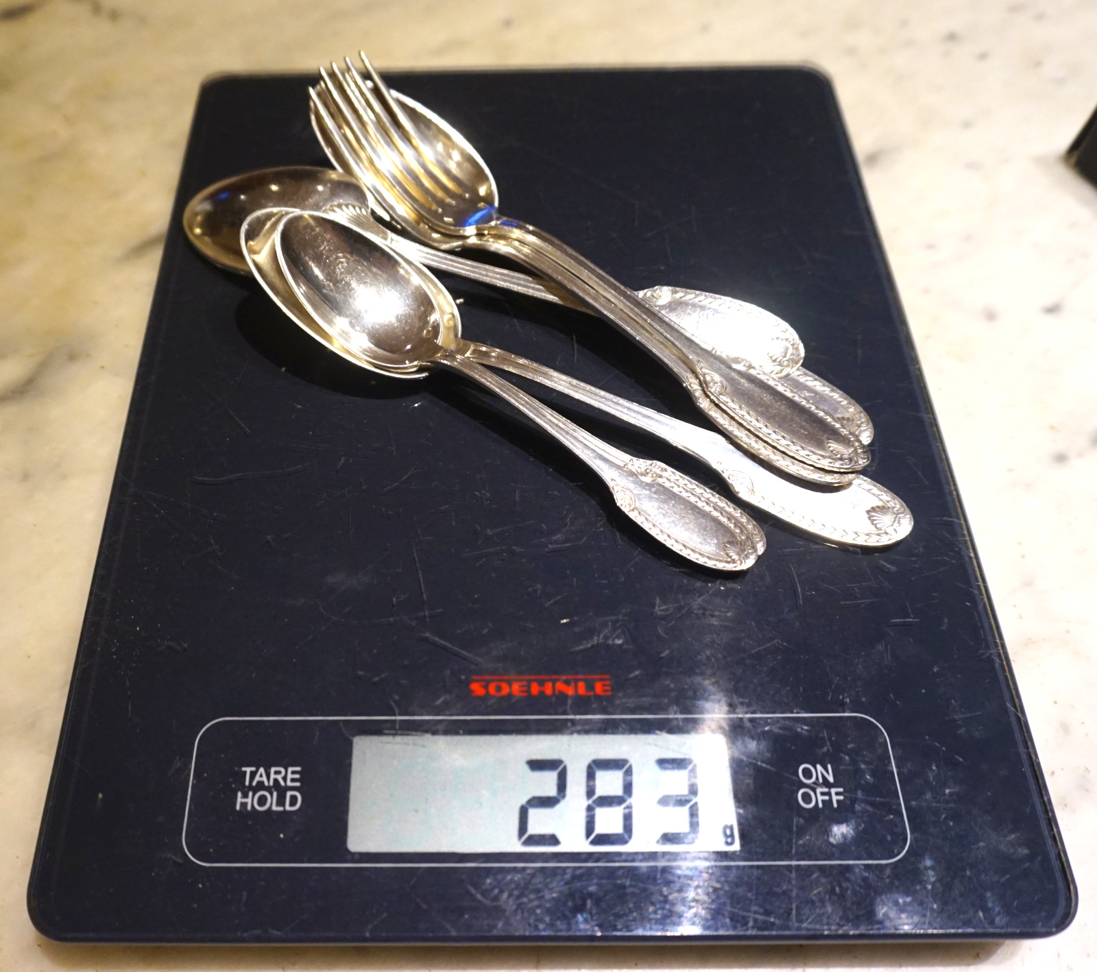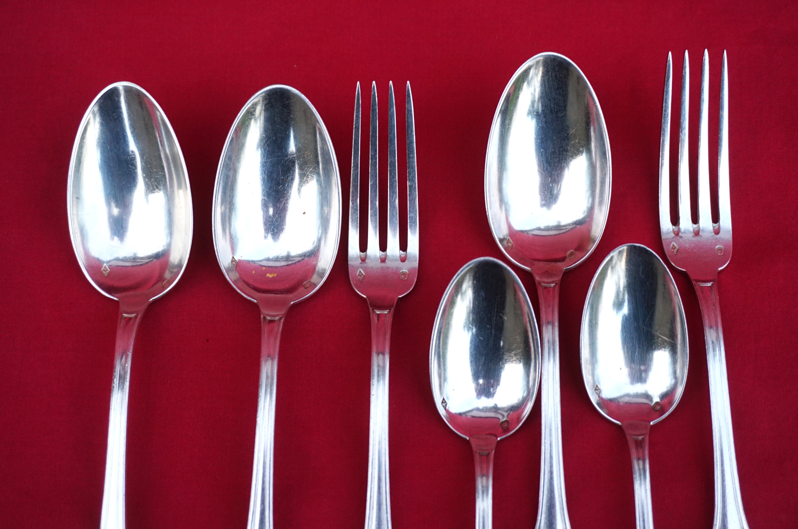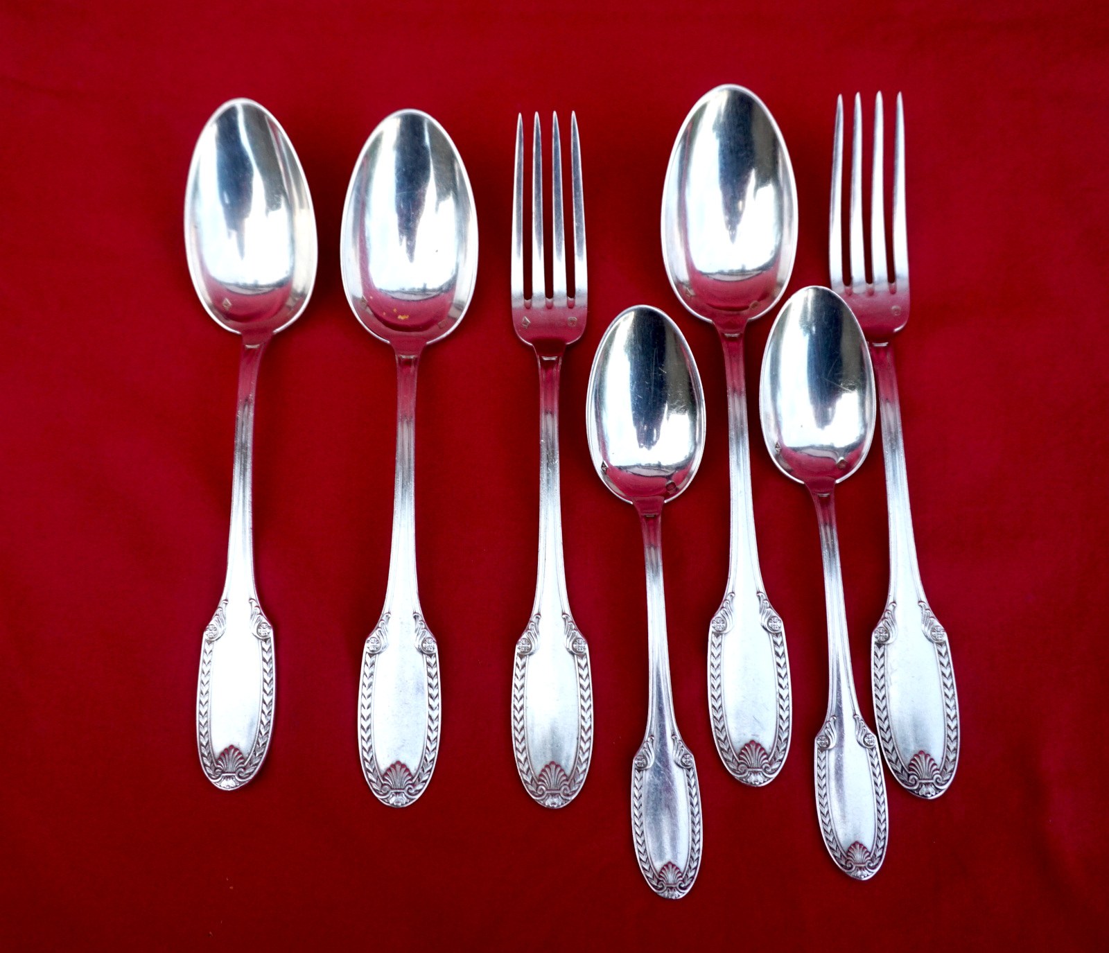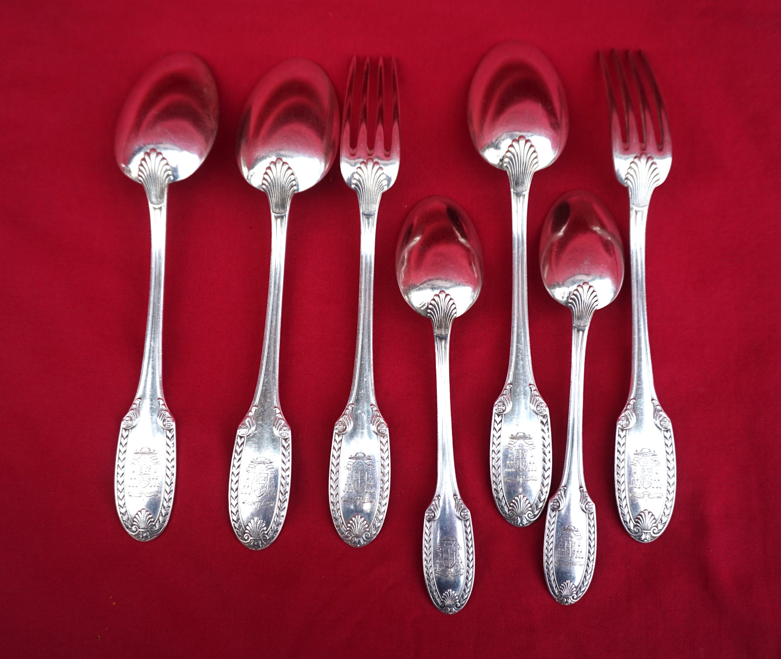 French sterling silver dessert 2 forks ,3 spoons and 2 coffee spoons set with the episcopal blazon of Archibishop RP Miguen in Rennes Dol and Saint Malo (1931). They are hallmarked with the head of Minerva and the silversmith mark PQ Queillé family. 6 7/8" (17.5cm) length for the dessert fork and spoon, weight 283 grams. Perfect condition.