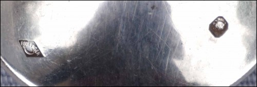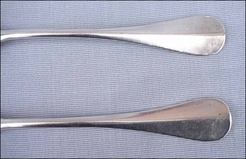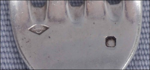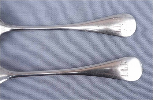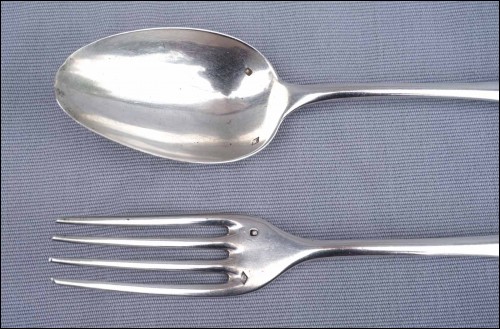 French sterling silver dinner fork and spoon set with monogram LLR engraved made by Boulenger Paris. They are hallmarked with the head of Minerva, french sterling silver guarantee (.925) and the mark of silversmith. 8 1/4" (21cm) for the fork, 8 1/8" (20.7cm) for the spoon, weight of the both 5.82oz (165 grams). Good condition a few small used as shown by the following pictures.