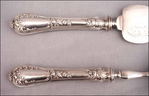 French sterling silver, hollow handles, fish serving set , fork and knife, in Louis XV style made during the 1900's. They are hallmarked with the head of Minerva, french sterling silver (.925) guarantee. 10 1/2" (26.7cm) length. Perfect condition
