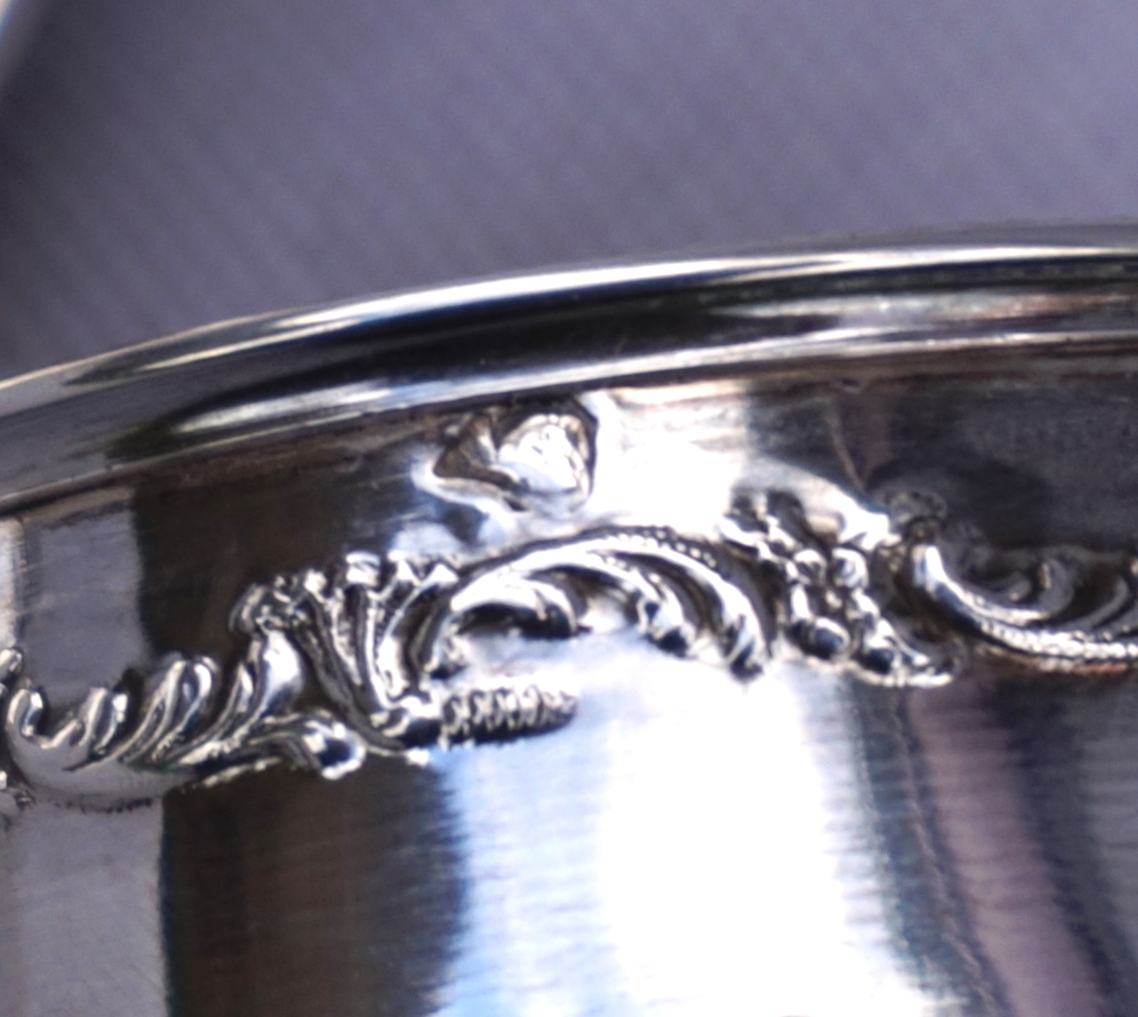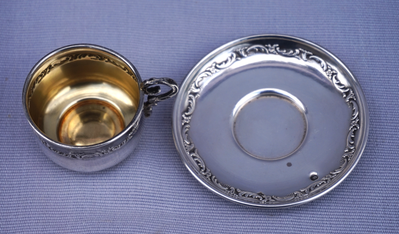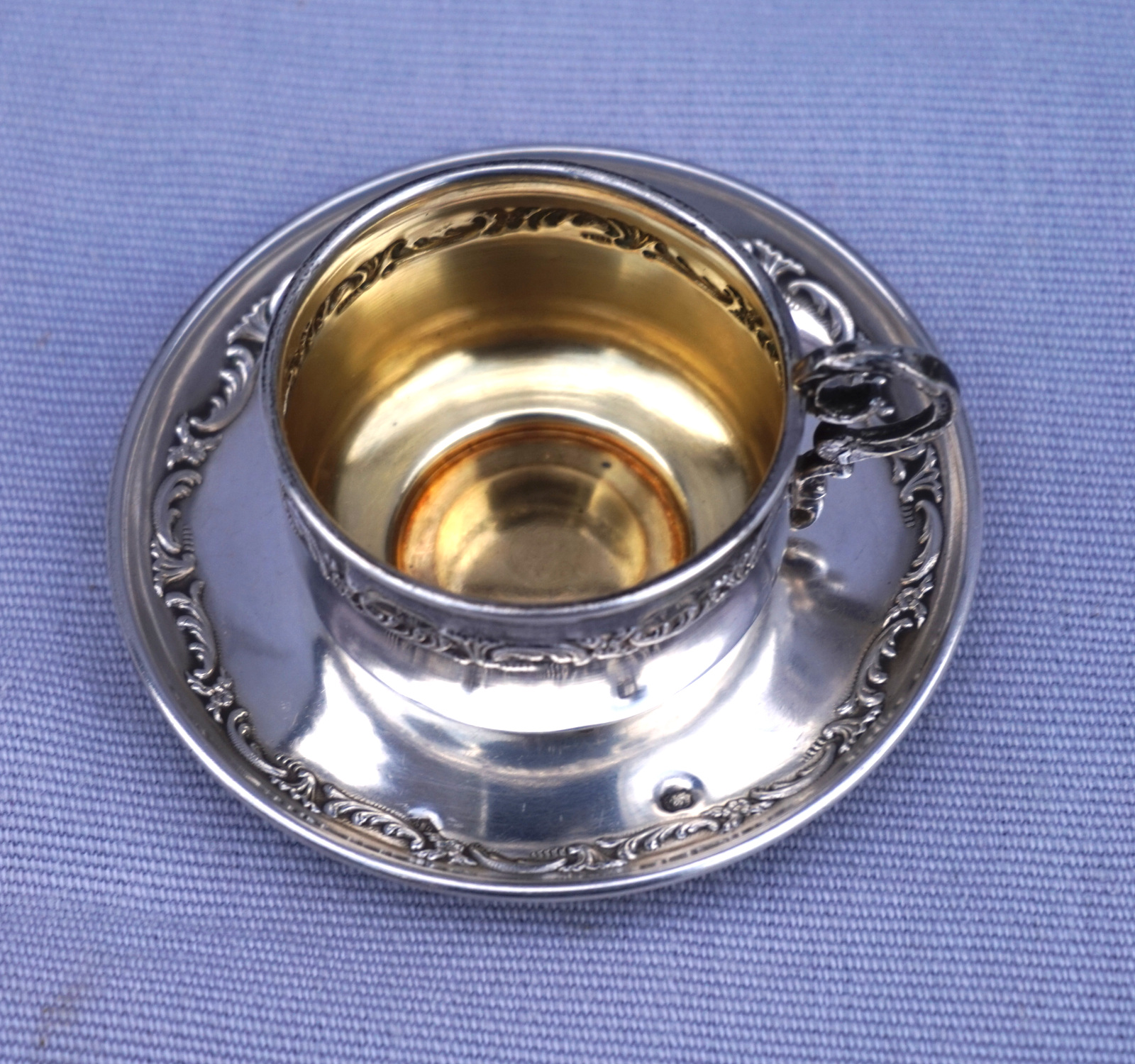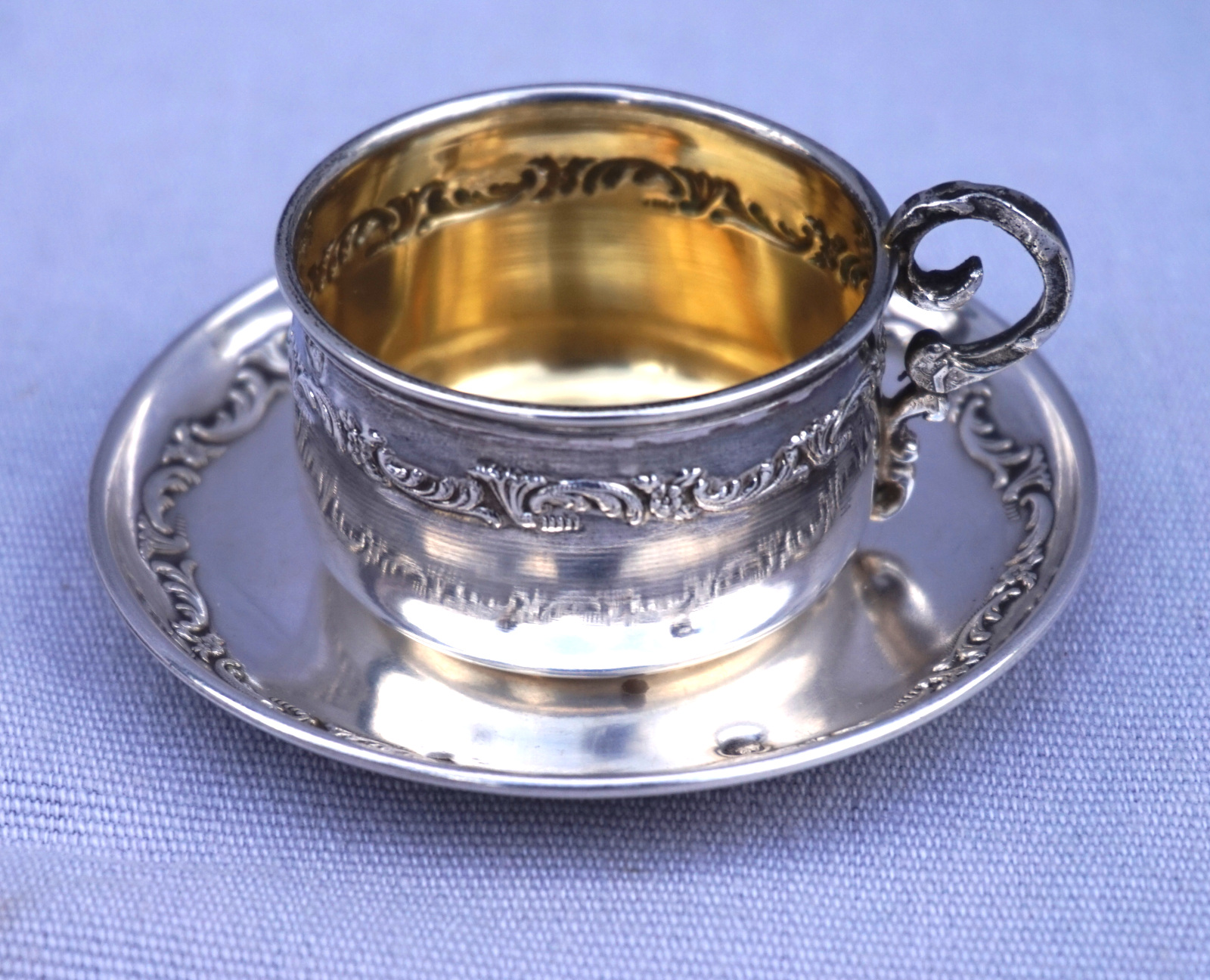 French sterling silver moka cup, vermeil (gold plated )inside, and saucer with foliage decor made by Auguste Défis Paris during the 1890's. It's hallmarked with the head of Minerva, french sterling silver (.925) guarantee, and the silversmith mark. They measure for the saucer 2 7/8" (7.4cm) diameter, for the cup 2 1/8" (5.5cm) width with the handle , 1 5/8" (4.3cm) diameter and 1 1/8" (3cm) height, weight for the set 30grams. Perfect condition.