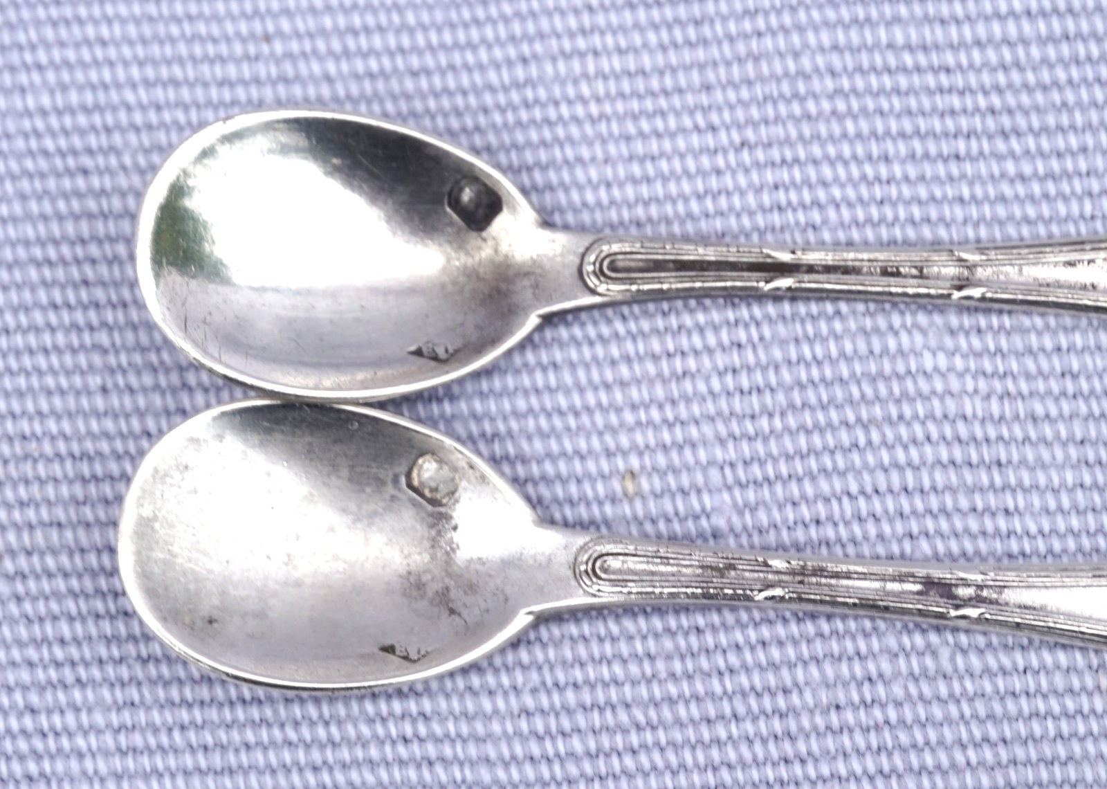 French sterling silver pair of salt spoons with filet thread decor made during the 1900's. They are hallmarked with the head of Minerva, french sterling silver (.950) guarantee and the silversmith stamp. 2 3/4" (7cm) length, weight 9.96 grams. Good condition a few small stains.
