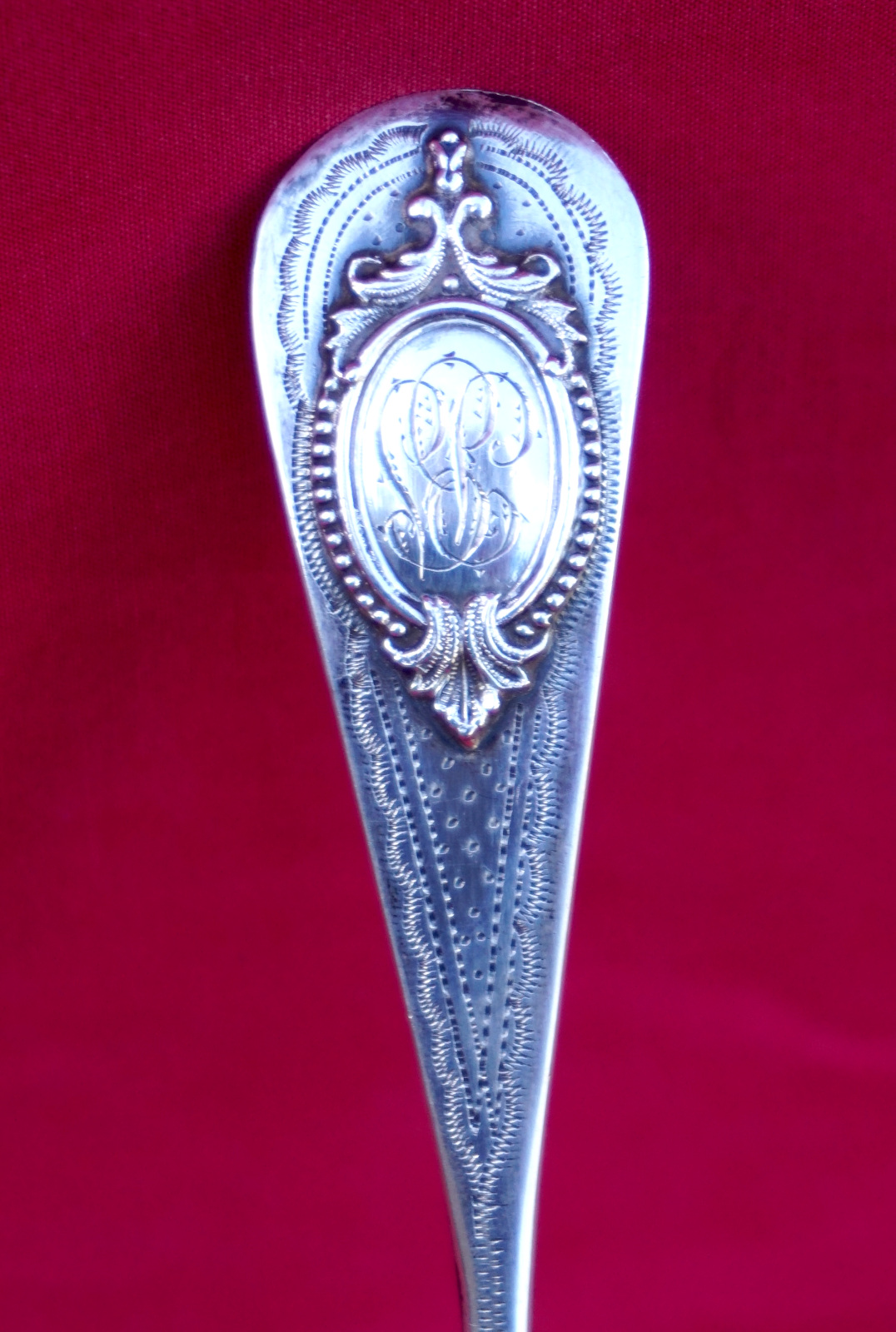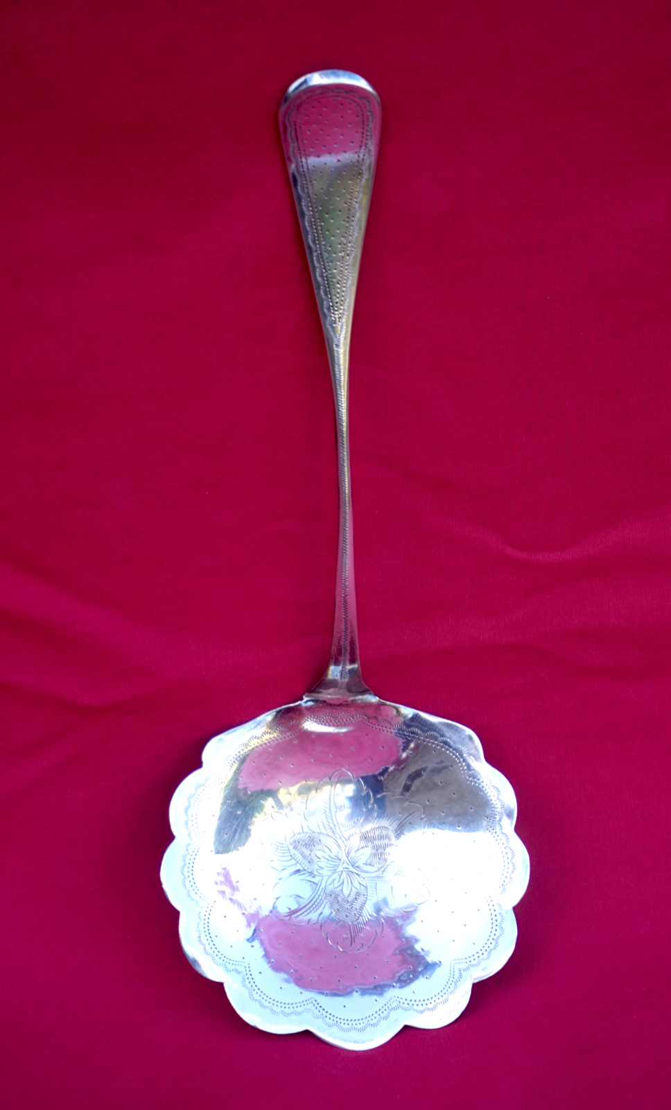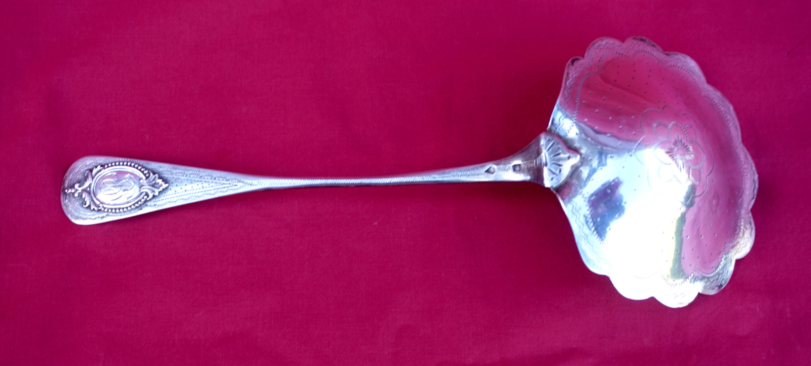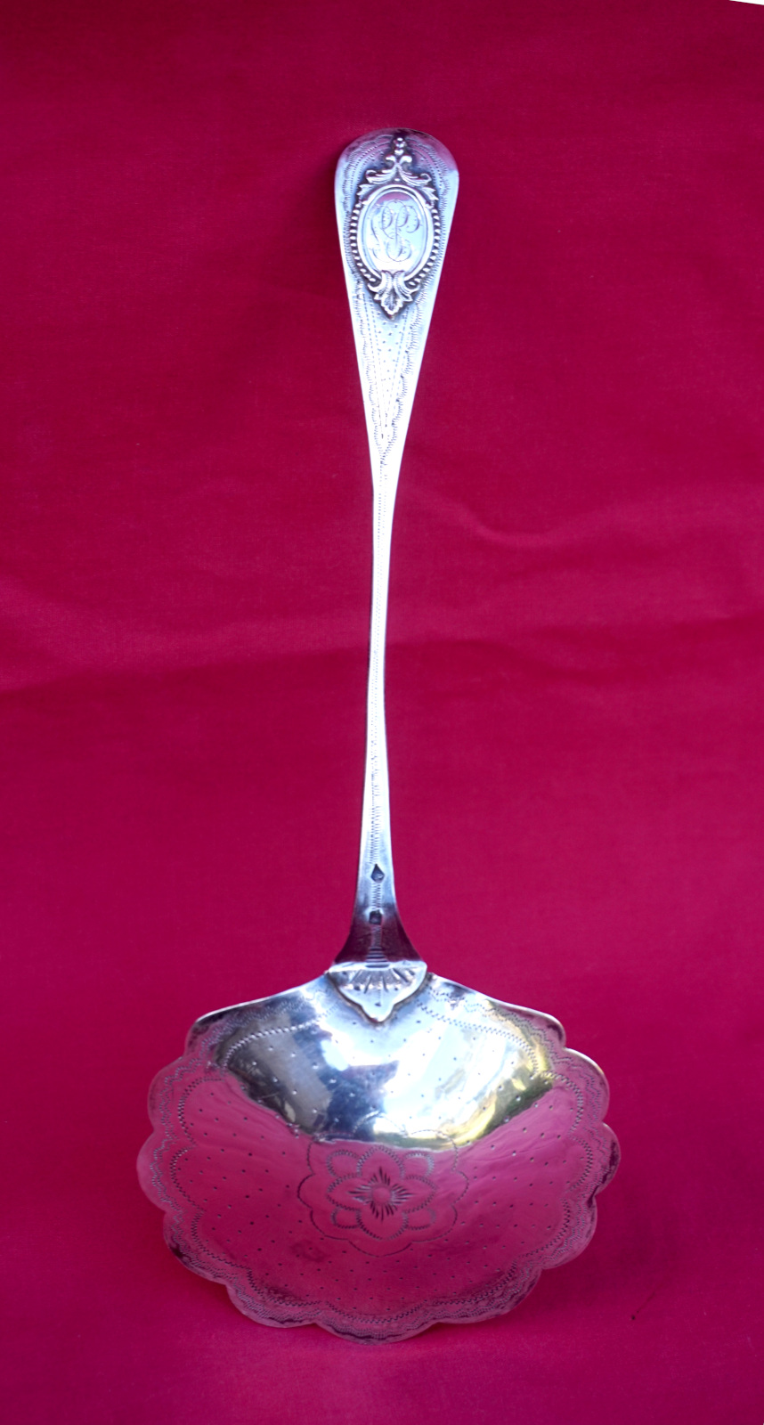 French sterling silver strawberry serving spoon with BS monogram made during the 1900's. It's hallmarked with the head or Minerva, french sterling silver (.925) guarantee, and the Massat Freres mark. 8 7/8" (22.5cm) length, 3 3/8" (8.6cm) diameter, weight 67 grams. Perfect condition.
