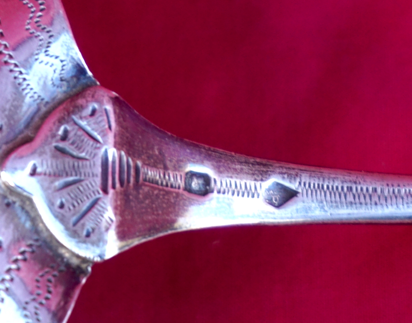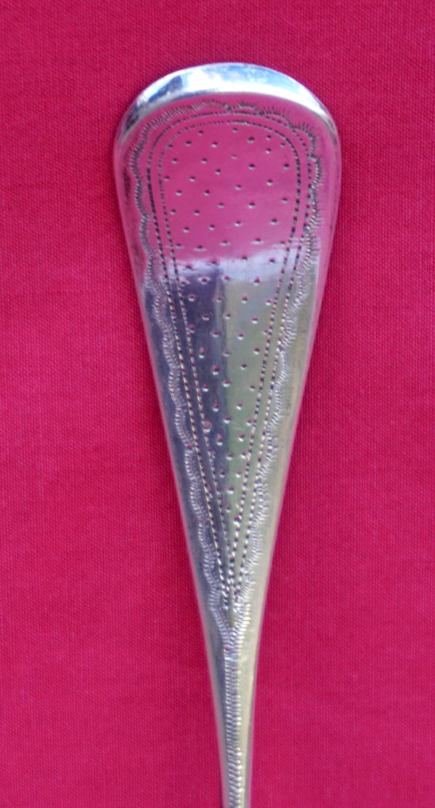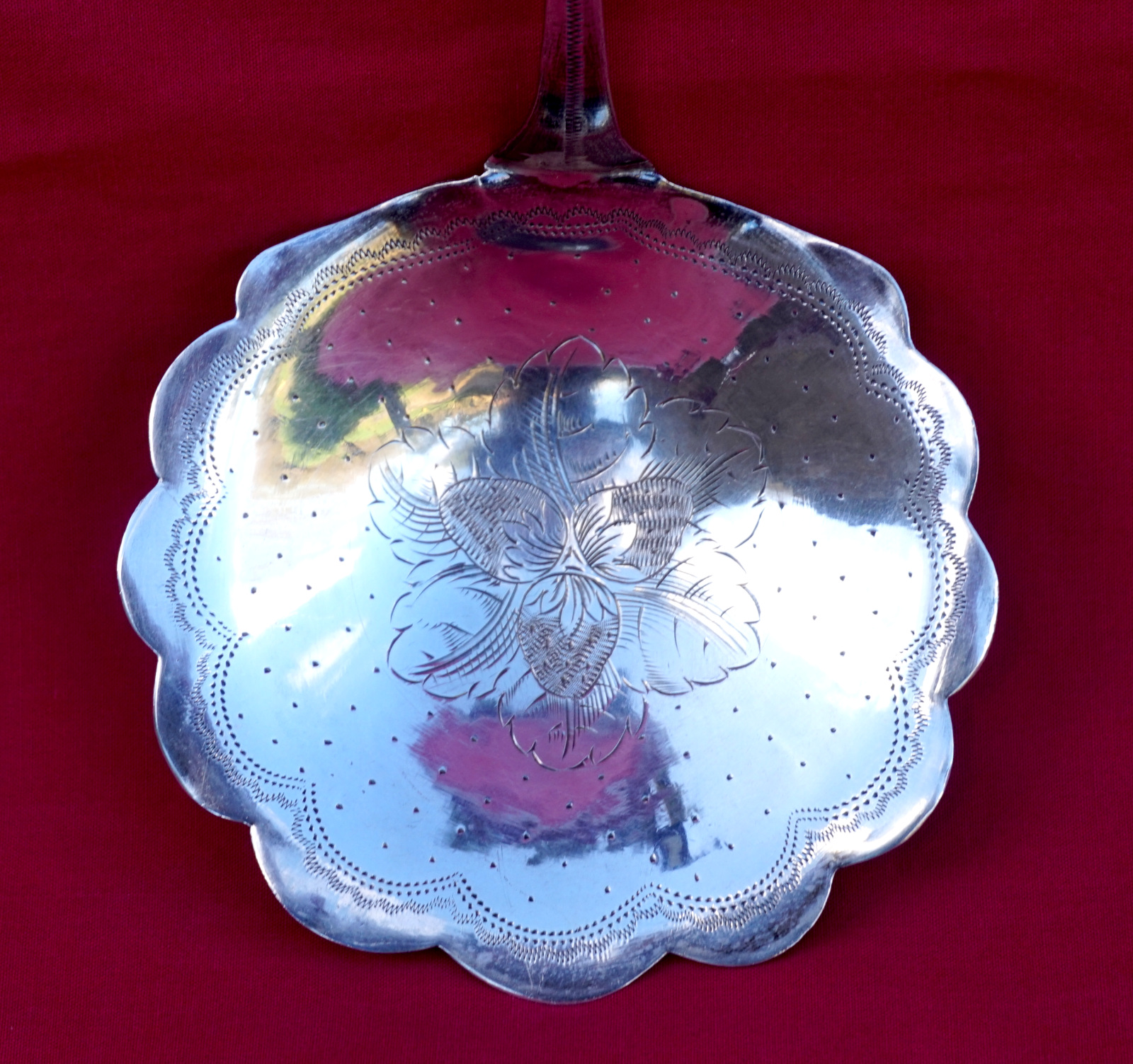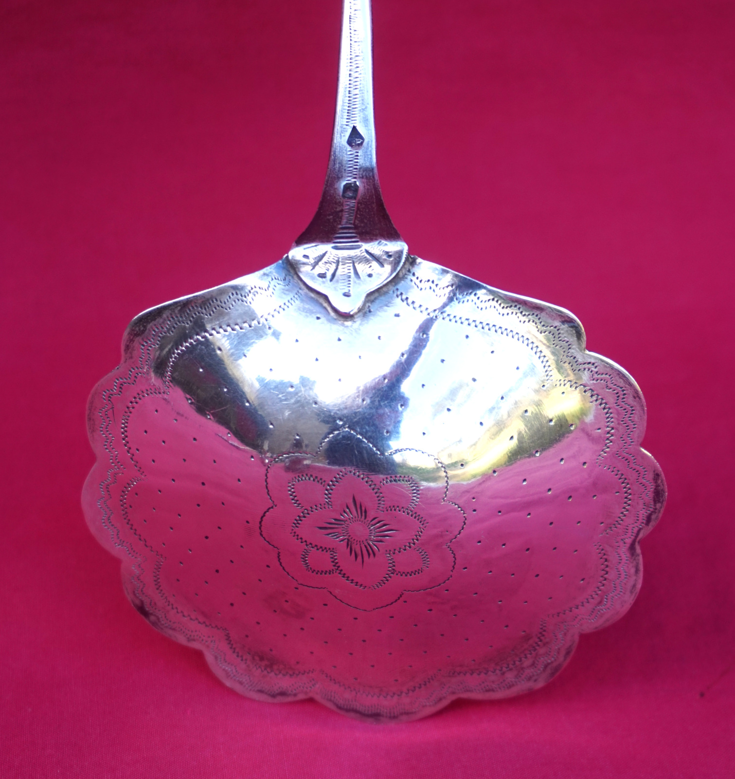 French sterling silver strawberry serving spoon with BS monogram made during the 1900's. It's hallmarked with the head or Minerva, french sterling silver (.925) guarantee, and the Massat Freres mark. 8 7/8" (22.5cm) length, 3 3/8" (8.6cm) diameter, weight 67 grams. Perfect condition.