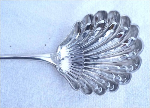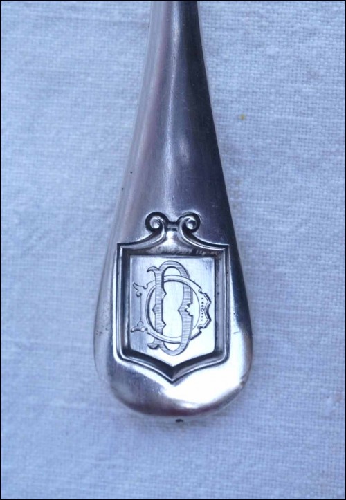 Cuillère saupoudreuse en argent massif , monogrammée OD, par François Nicoud (1875 -1880), Bld de Strasbourg Paris. Elle est poinçonnée de la tête de Minerve et de la marque de l'orfèvre. longueur 21 cm, diamètre de la saupoudreuse 6.2 cm, poids 77 gr. Très bel état.