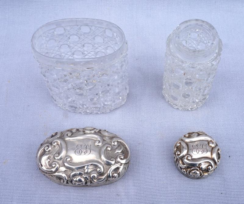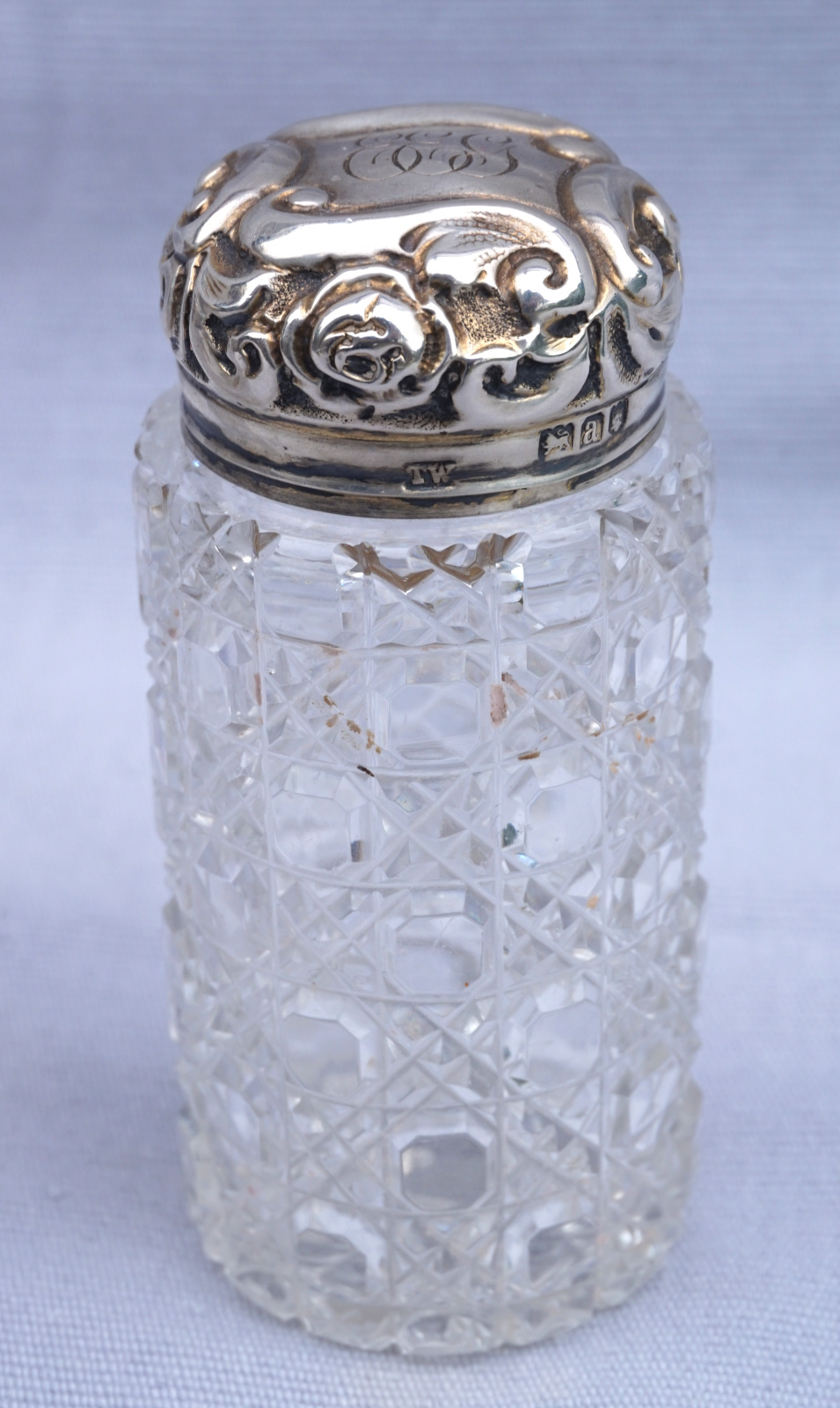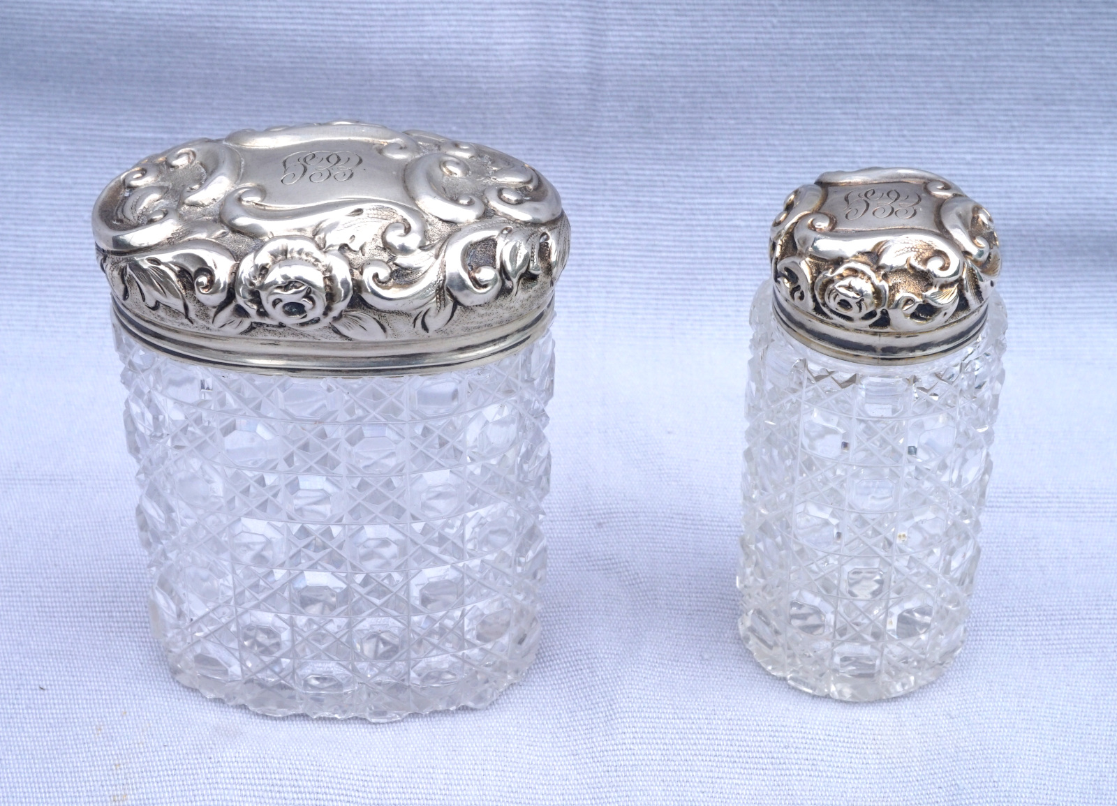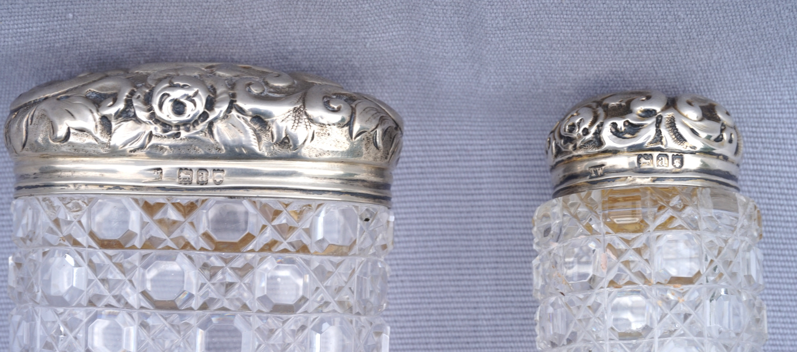 English vanity bottle sait in cut crystal and sterling silver lid n momo EEG , made by Thoma Whitehouse in Louse during the 1950's. They are hallmarked with the English sterling silver guarantee and the silversith mark. They measure for the cylindric bottle 3 1/2" (9cm) height, 1 1/2" (3.7cm) diameter for the oval bottle 4" (10cm) height, 3" (7.5cm) width. Good condition a chip on the base of the oval bottle.