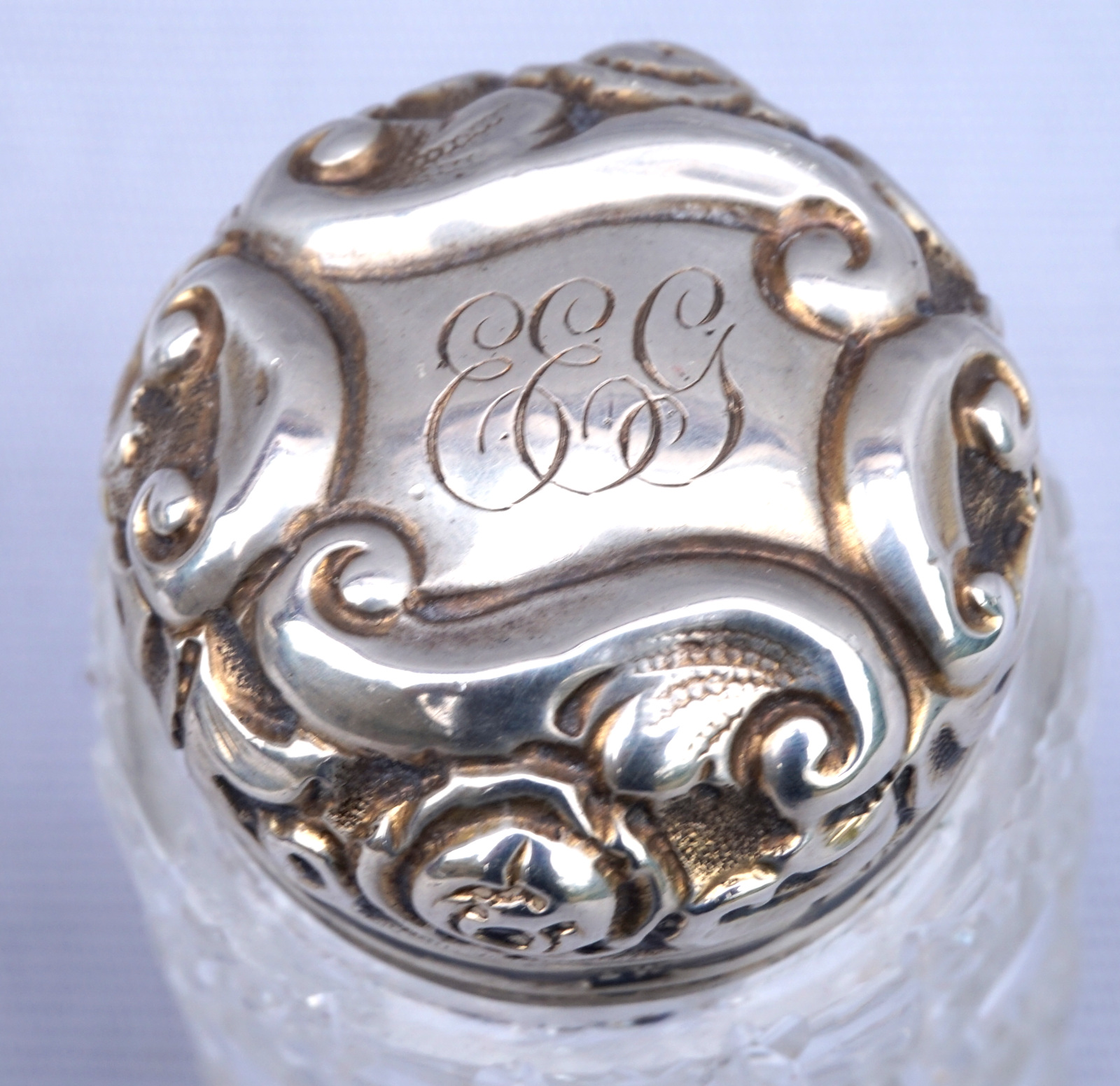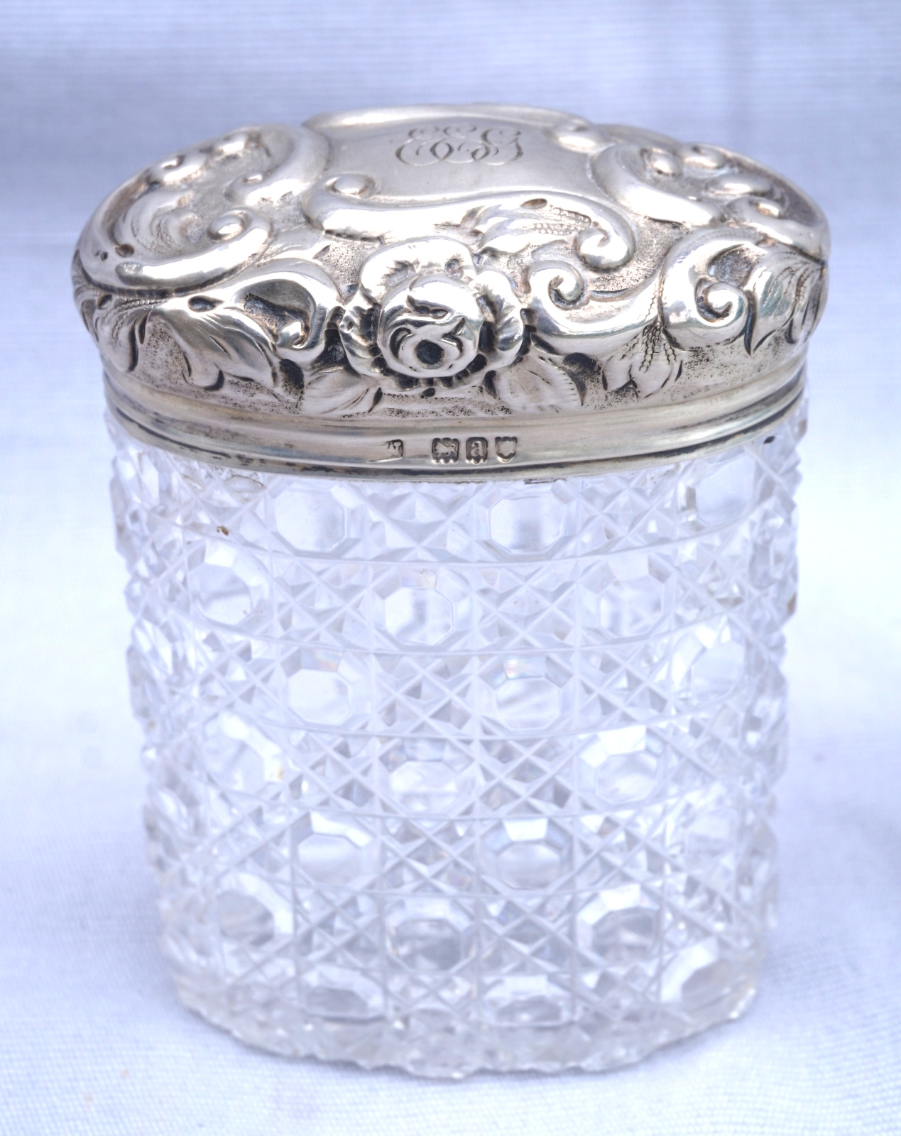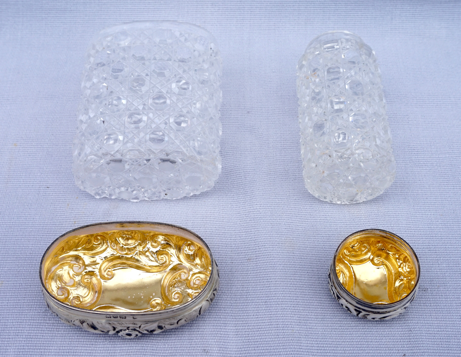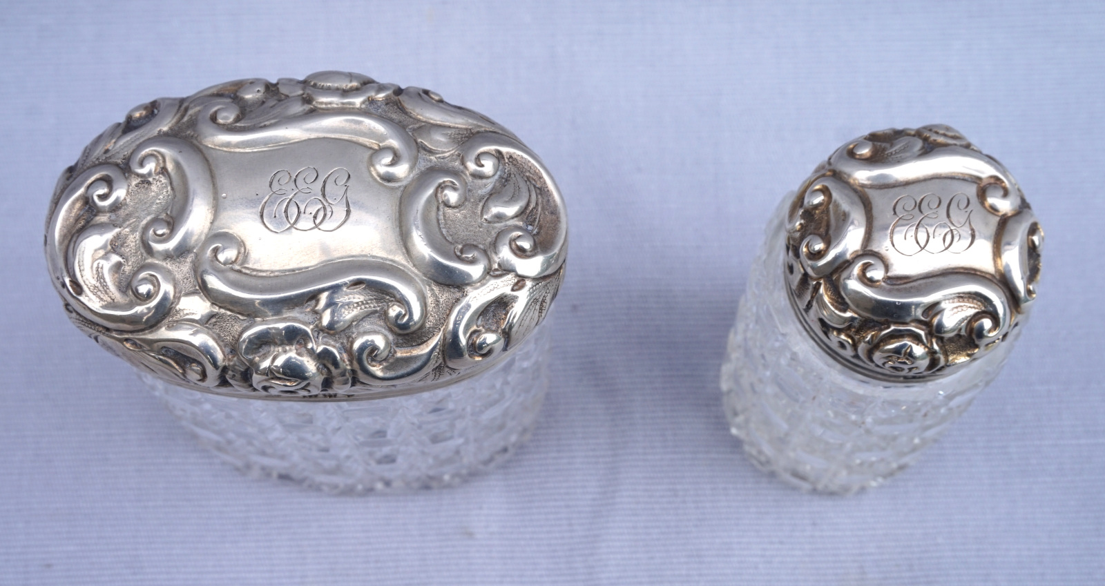 English vanity bottle sait in cut crystal and sterling silver lid n momo EEG , made by Thoma Whitehouse in Louse during the 1950's. They are hallmarked with the English sterling silver guarantee and the silversith mark. They measure for the cylindric bottle 3 1/2" (9cm) height, 1 1/2" (3.7cm) diameter for the oval bottle 4" (10cm) height, 3" (7.5cm) width. Good condition a chip on the base of the oval bottle.