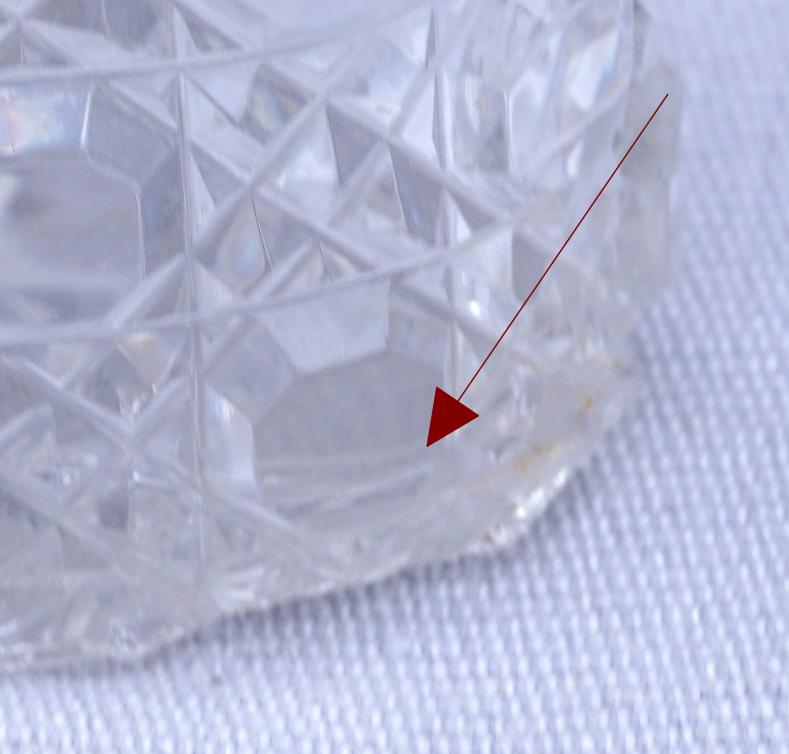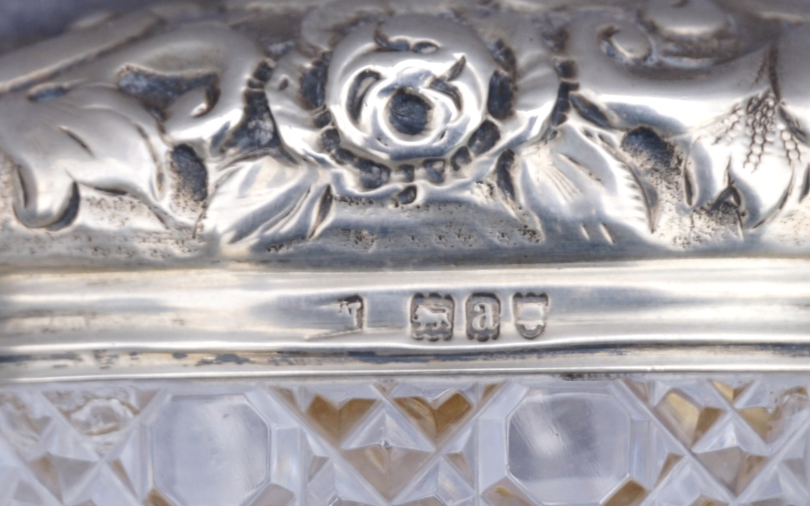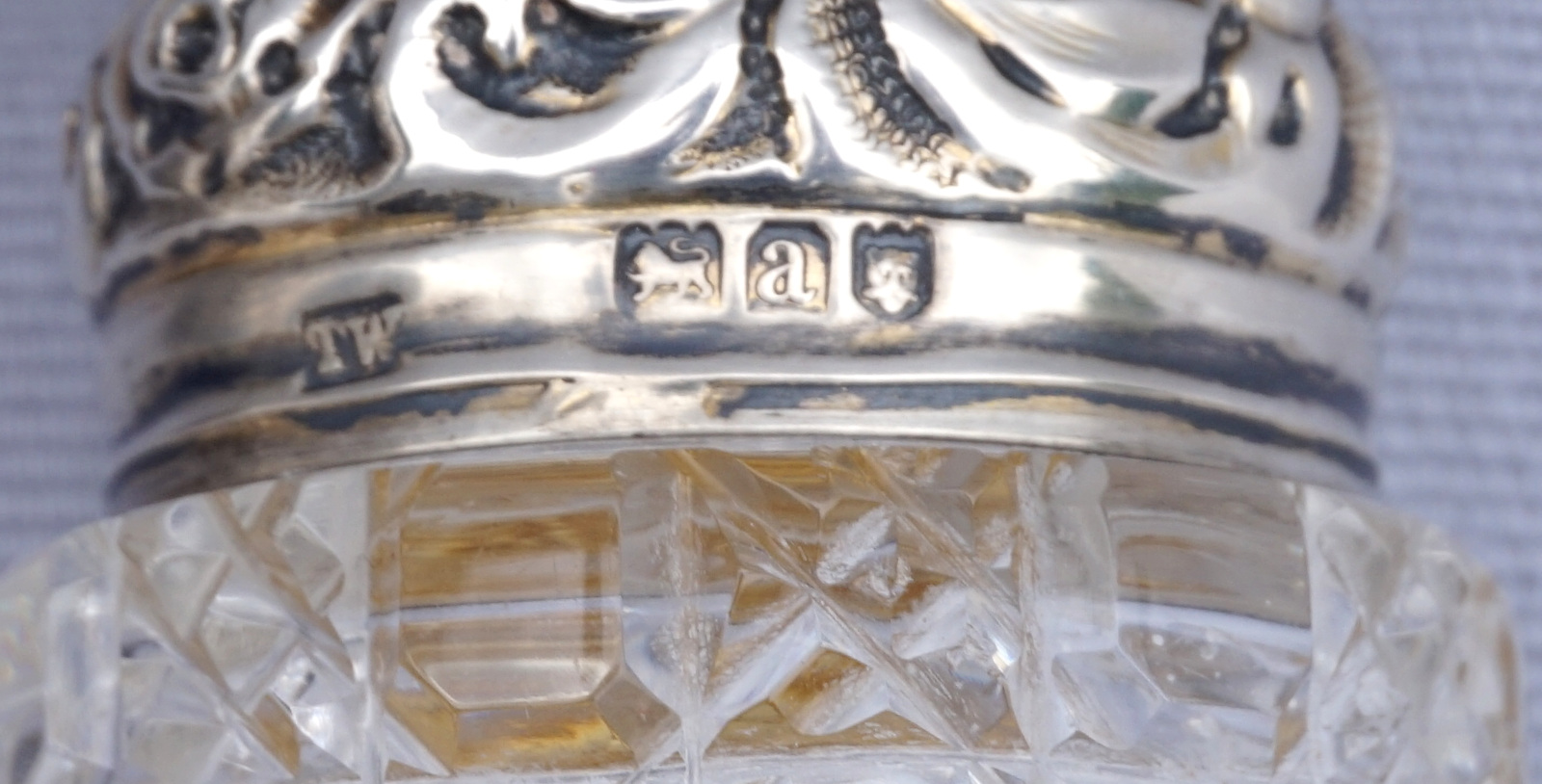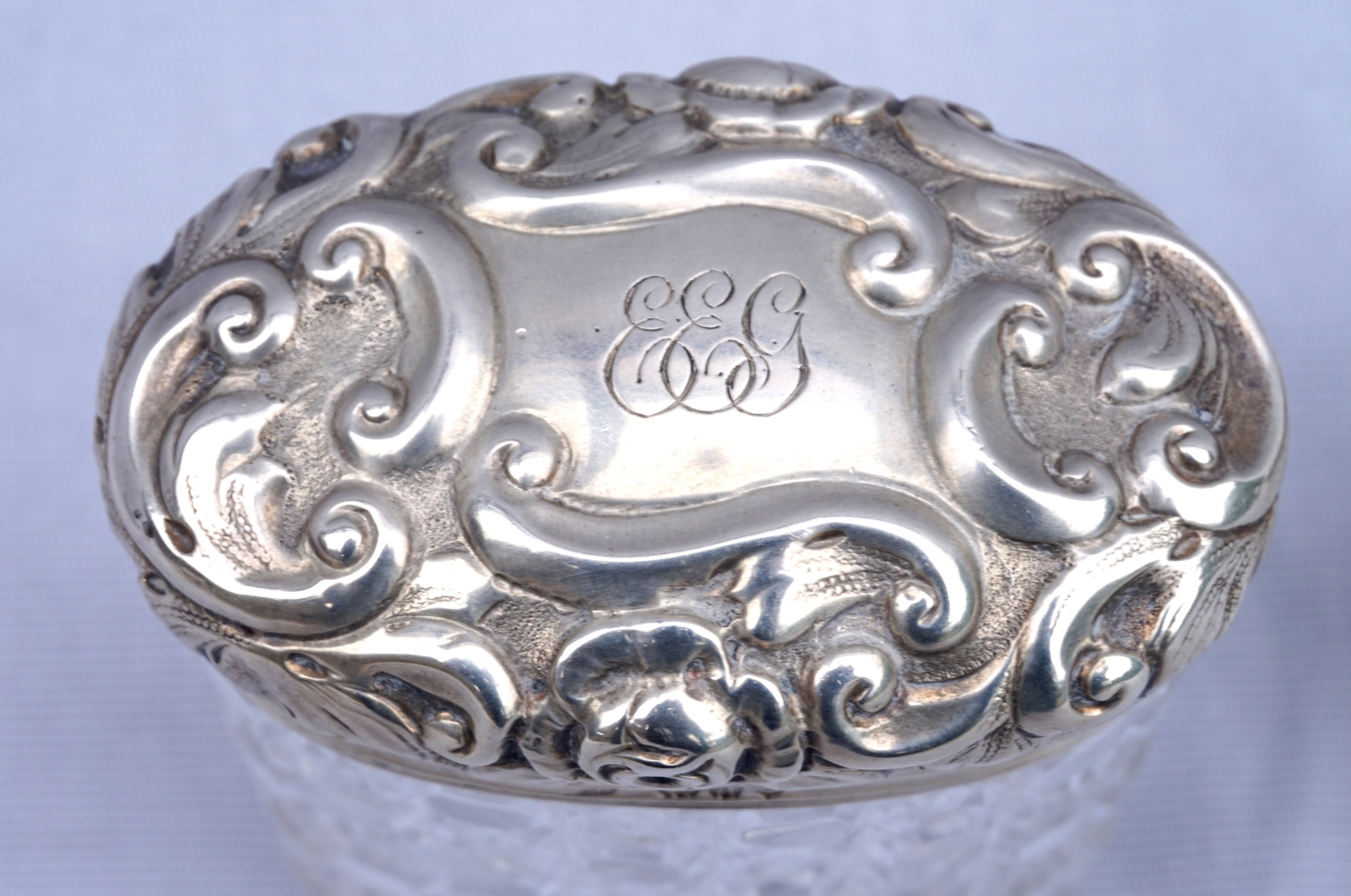 English vanity bottle sait in cut crystal and sterling silver lid n momo EEG , made by Thoma Whitehouse in Louse during the 1950's. They are hallmarked with the English sterling silver guarantee and the silversith mark. They measure for the cylindric bottle 3 1/2" (9cm) height, 1 1/2" (3.7cm) diameter for the oval bottle 4" (10cm) height, 3" (7.5cm) width. Good condition a chip on the base of the oval bottle.