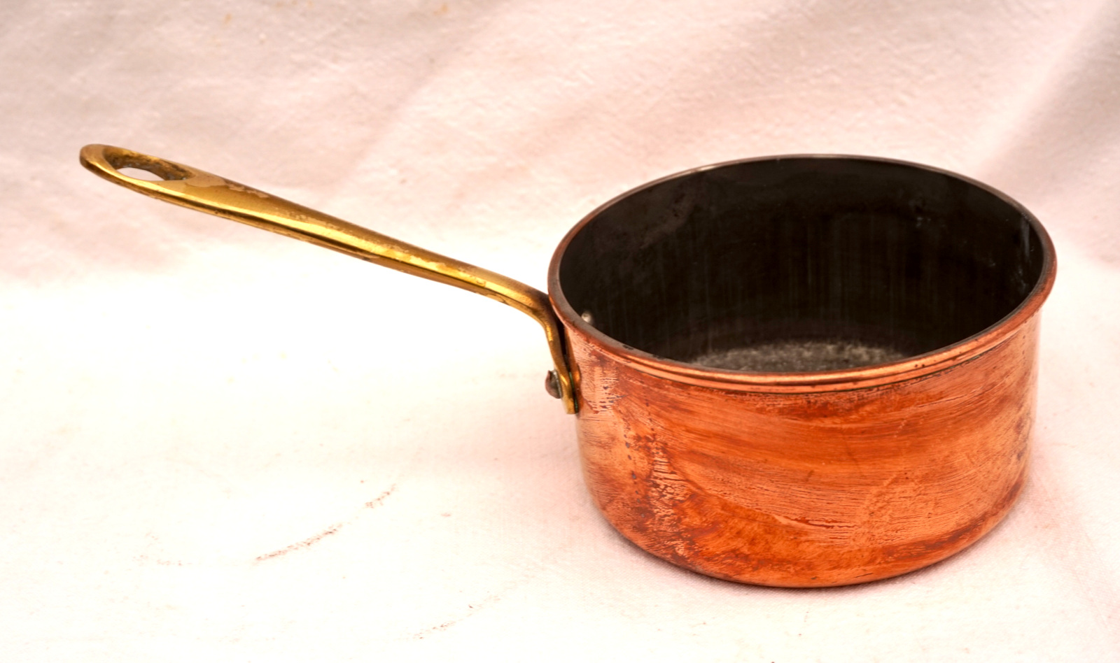 Petite casserole en cuivre étamé et manche laiton pour la sauce ou les flambés, vers 1950. Diamètre 11.4cm, largeur avec le manche 22.5 cm, hauteur 5.7 cm, poids 282 gr, contenance 0.5 l. Très bel état, quelques tâches.