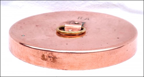 French cookware tin lined copper lid for stockpot stew pan with brass ring for hanging and BA monogram made during the 1900's. 5 7/8" (15cm) diameter, 3/4" (2cm) depth. Good condition a few small stains as shown by the following pictures.