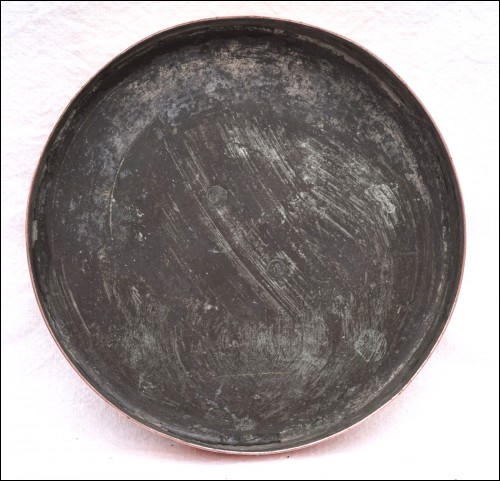 Couvercle de faitout en cuivre étamé avec anneau en laiton et monogramme BA. Diamètre 15 cm, profondeur 2 cm. Très bel état, quelques taches.