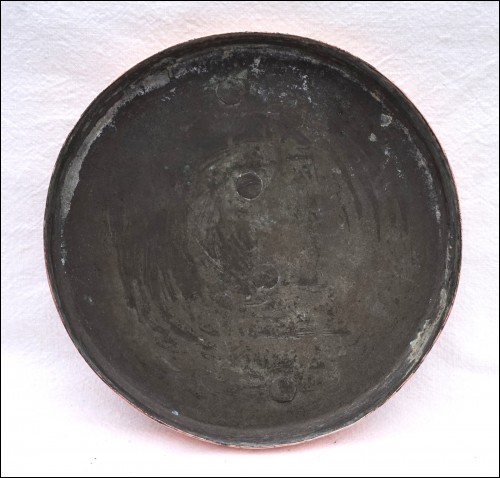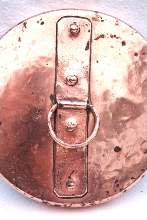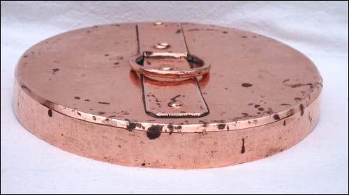 Couvercle de faitout en cuivre étamé avec anneau en cuivre. Diamètre 18.5 cm, profondeur 2.5 cm. Très bel état, quelques taches