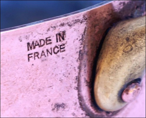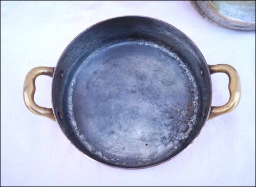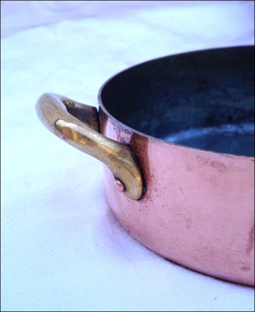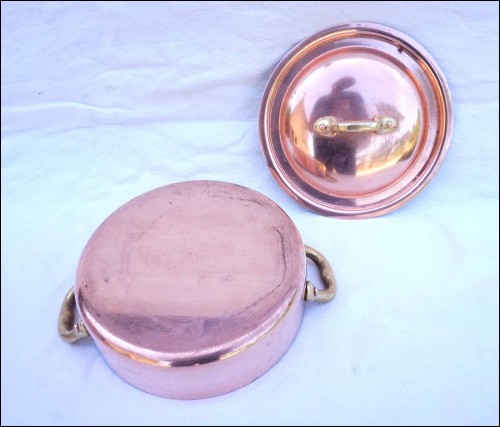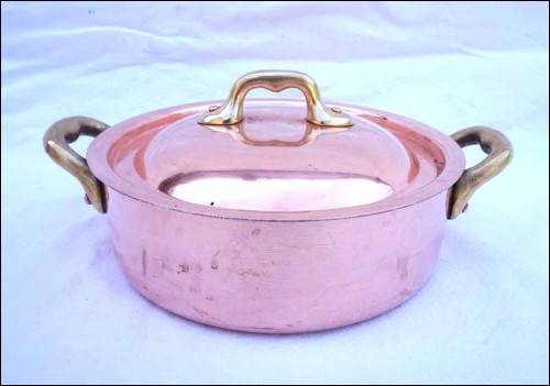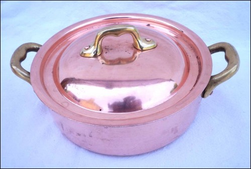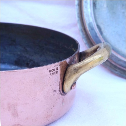 French cookware tined copper lidded cocotte , stewpan, made in Normandy during the 1960's. It's stamped made in France. 6 1/2" (16.5cm) diameter, 8 5/8" (22cm) width with the handles, 2 1/4"(5.5cm) height without lid, 2mm thickness, weight 2lb 2.46oz (977 grams). Perfect condition as shown by the following pictures.