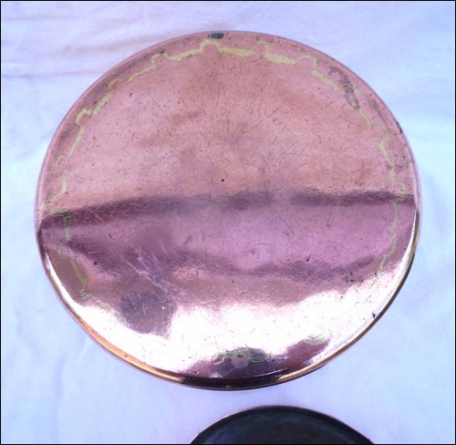 Fait-tout en cuivre étamé avec couvercle et monté à queue d'aronde, anse en fer forgé, fin XIX° siècle. Diamètre 17.7cm, largeur avec les anses 22 cm, hauteur avec le couvercle 17.7cm, poids 2.075kg. Parfait état.