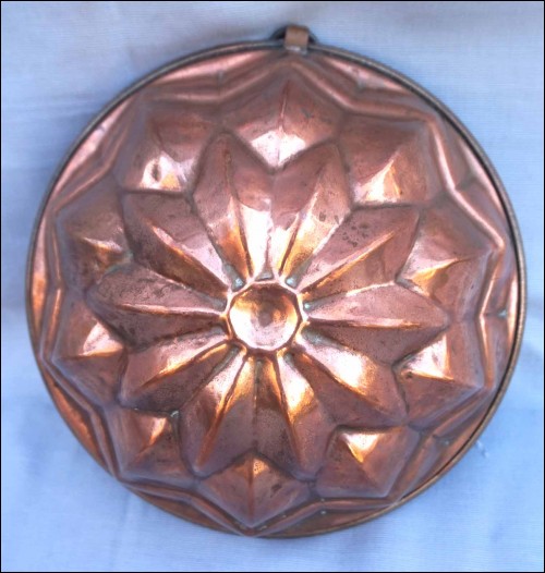 French tined copper mold fpr cake, jelly,with ring for hanging made in France during the 1900's. 9 1/8" (23.2cm) diameter, 4" (10.2cm) height, weight 12.31oz (349 grams). Perfect condition as shown by the following pictures.