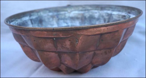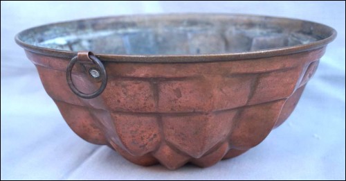 Moule à gateau en cuivre étamé avec un anneau pour le suspendre, début XX° siècle. Hauteur 10,2cm, diamètre 23.2cm, poids 349 grammes.
