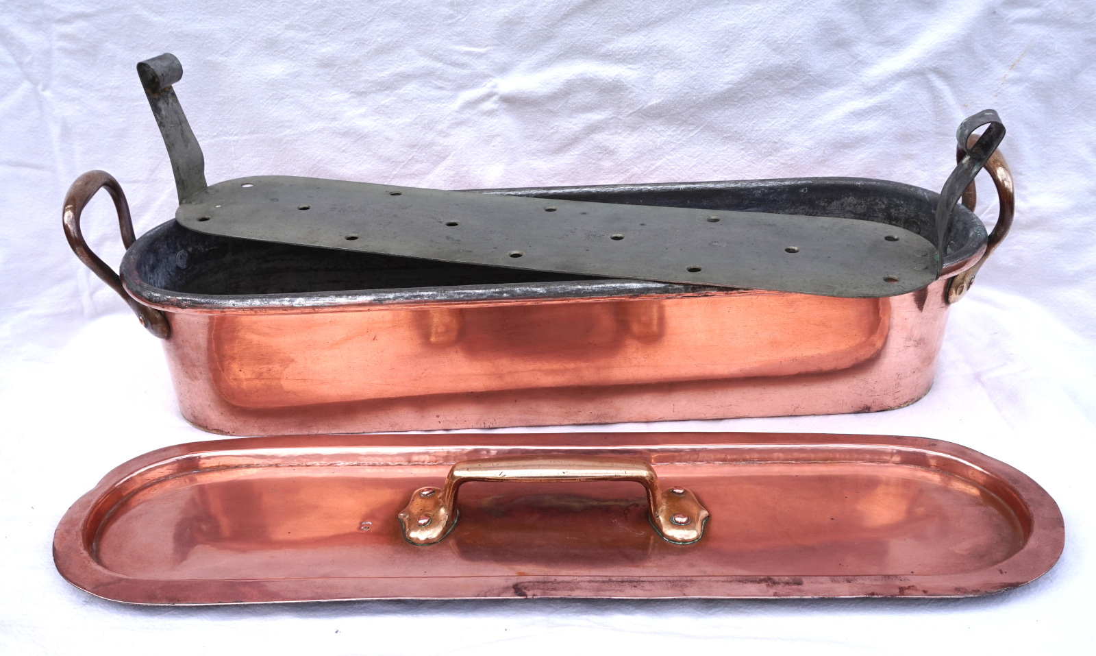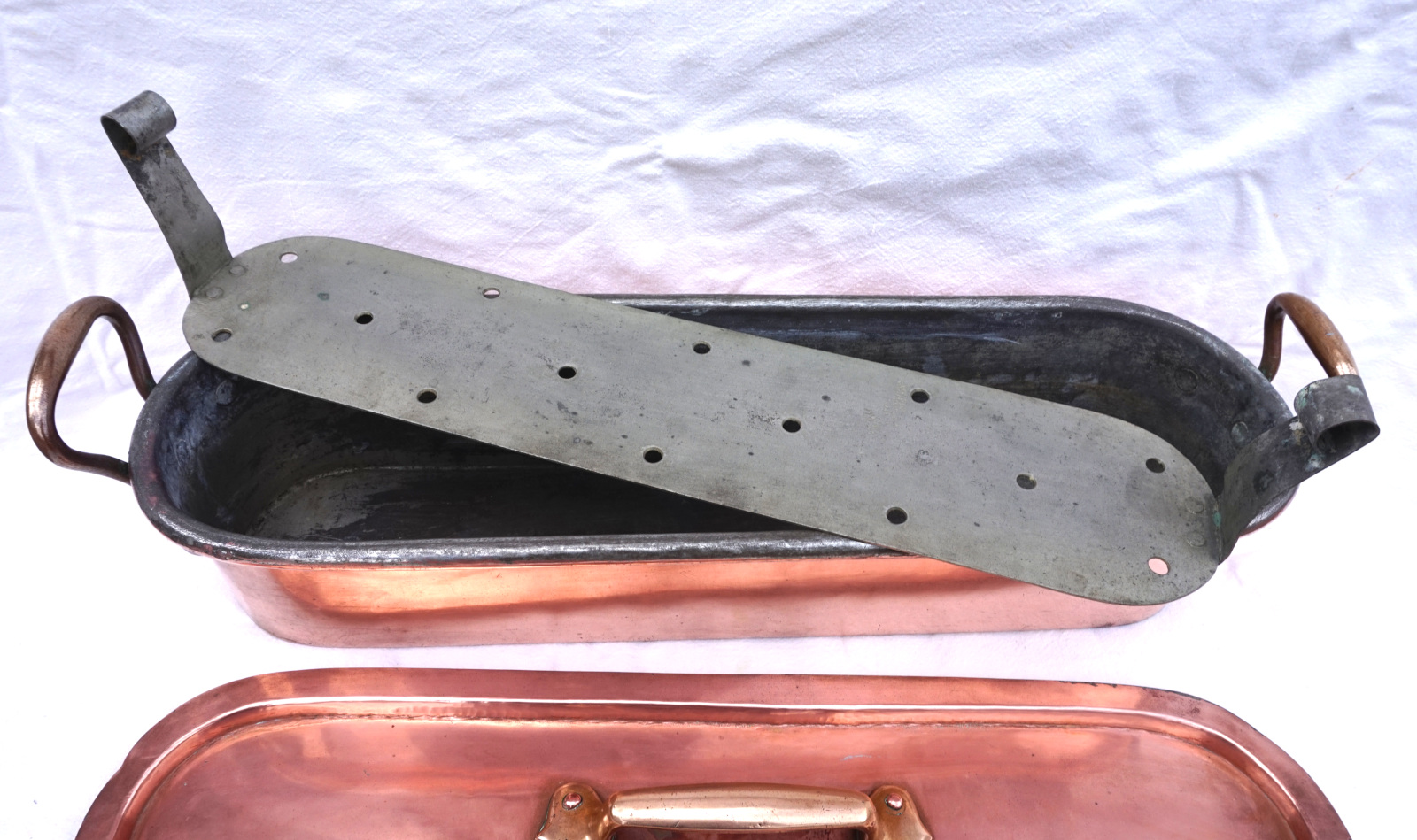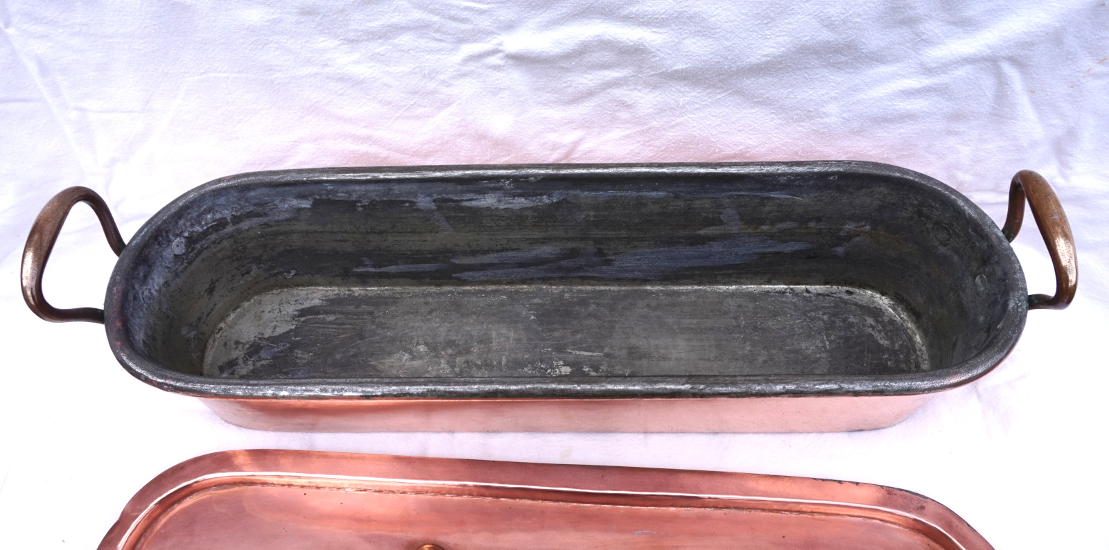 French tined dovetailed copper fish kettle poacher with brass handle made late 19th century. 26" (66cm) length, 7 3/4" (19.7cm) width, 5" (12.7cm) height, weight 17lbs 3.84oz (7.820 kilograms). Beautiful condition we think the lid isn't original as shown by the following pictures.