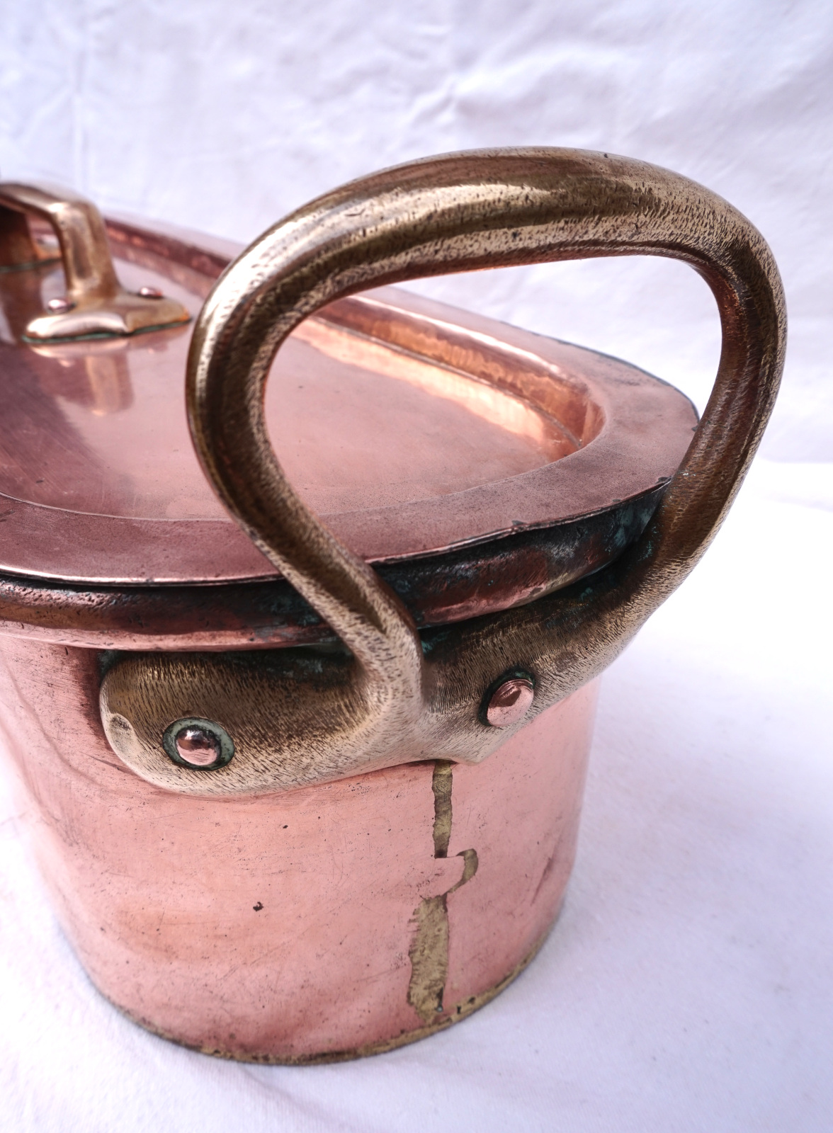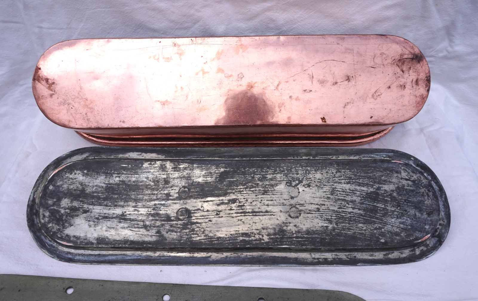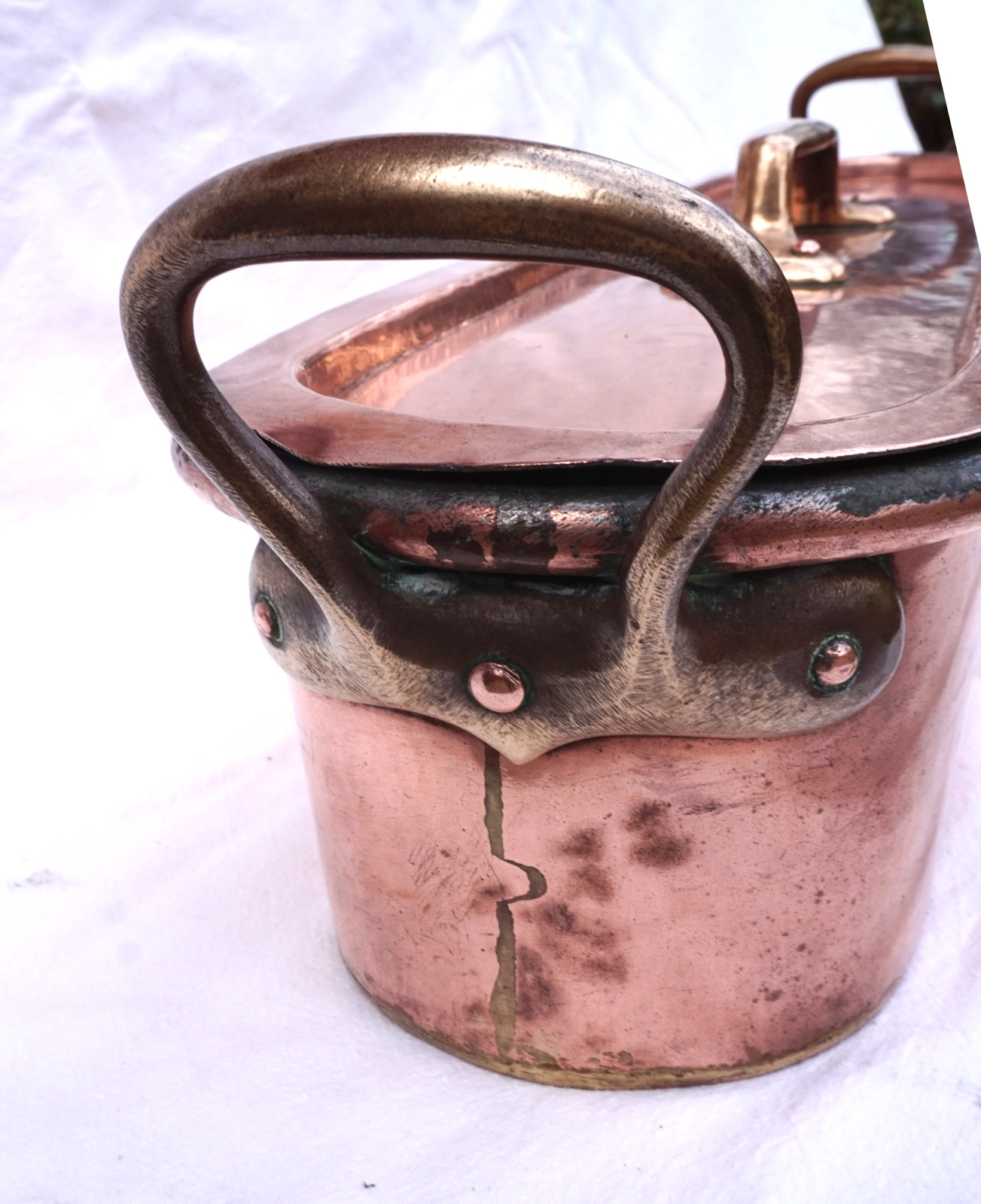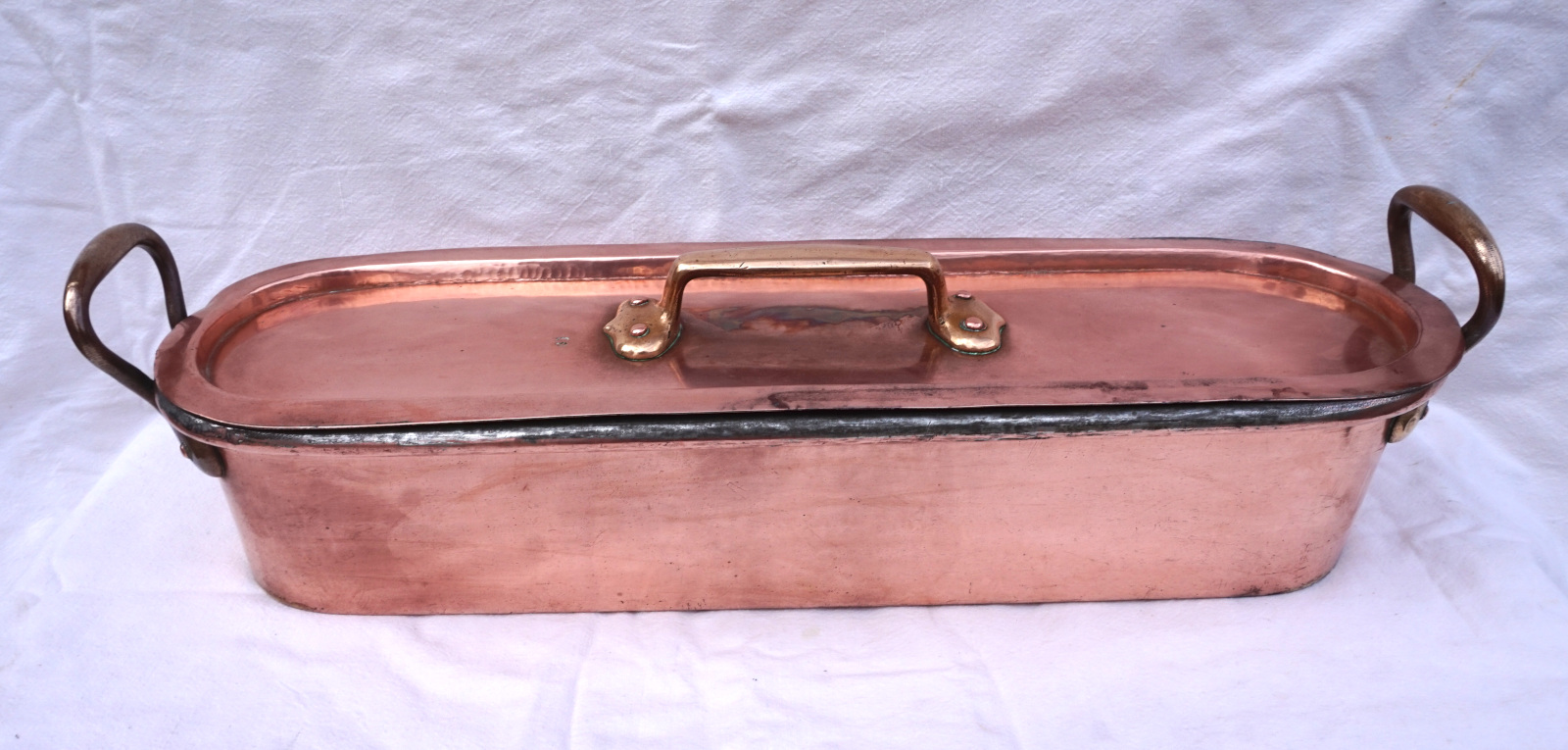 French tined dovetailed copper fish kettle poacher with brass handle made late 19th century. 26" (66cm) length, 7 3/4" (19.7cm) width, 5" (12.7cm) height, weight 17lbs 3.84oz (7.820 kilograms). Beautiful condition we think the lid isn't original as shown by the following pictures.
